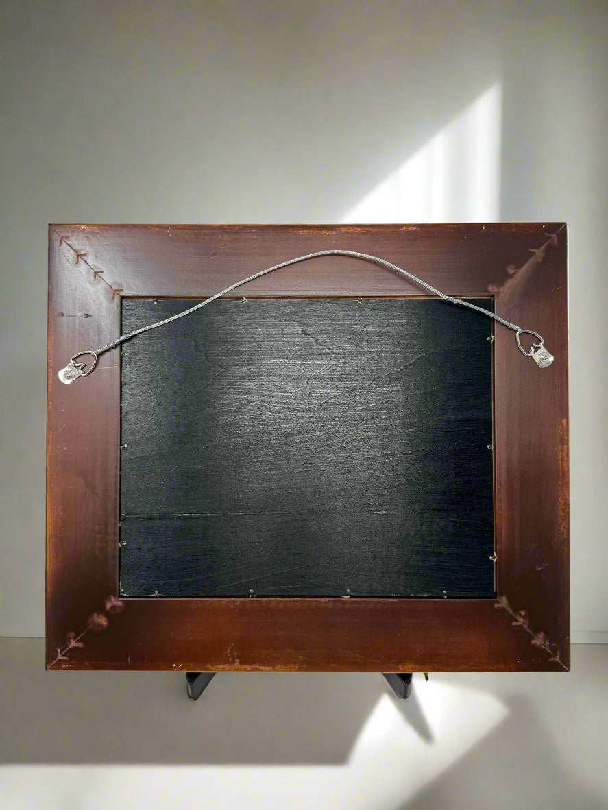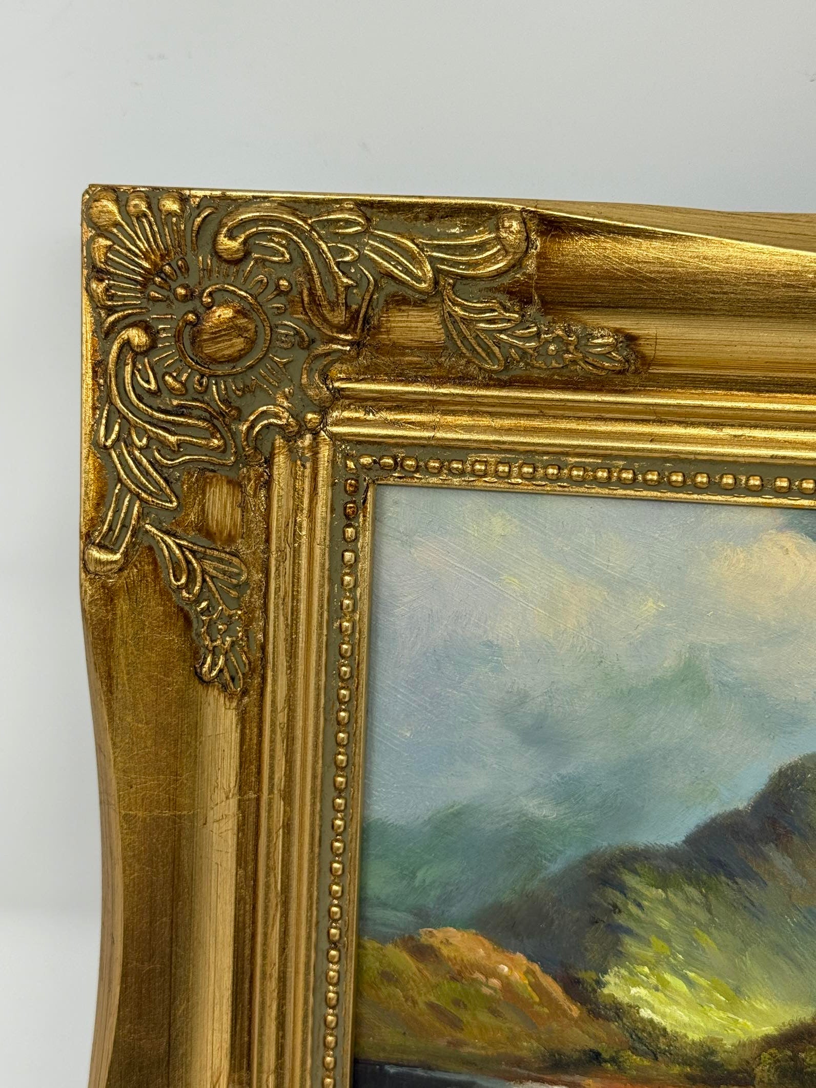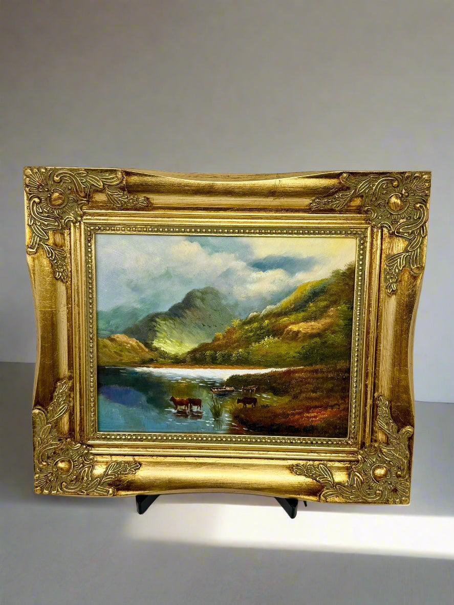 Majestic mountains rise beyond a tranquil lake, their peaks softened by drifting clouds and reflected in the still blue waters. At the shoreline, cattle graze and drink, while small boats rest quietly nearby. Painted in textured impasto, the scene captures both the grandeur of nature and the peaceful rhythm of pastoral life.
