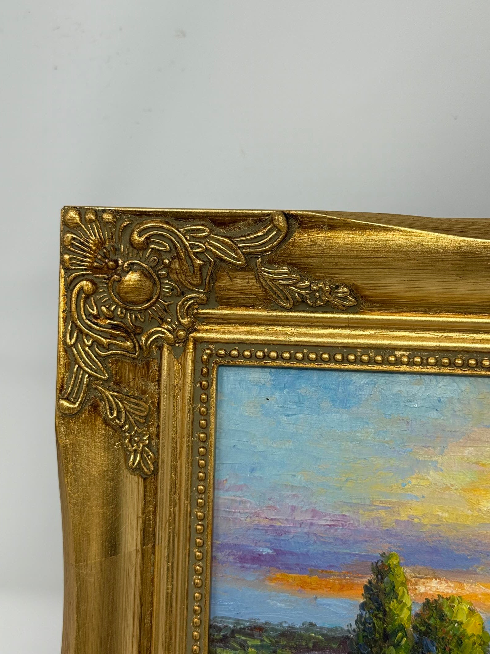 A tranquil lakeside cottage nestles beneath a towering tree as the evening sun sets the horizon aglow in warm hues of gold, violet, and rose. Gentle ripples in the water reflect both the light of the sky and the quiet presence of a solitary rowboat. With bold impasto strokes and jewel-toned colors, this intimate work radiates peace, nostalgia, and timeless beauty. Its ornate gilded frame enhances the painting’s romantic, heirloom character.