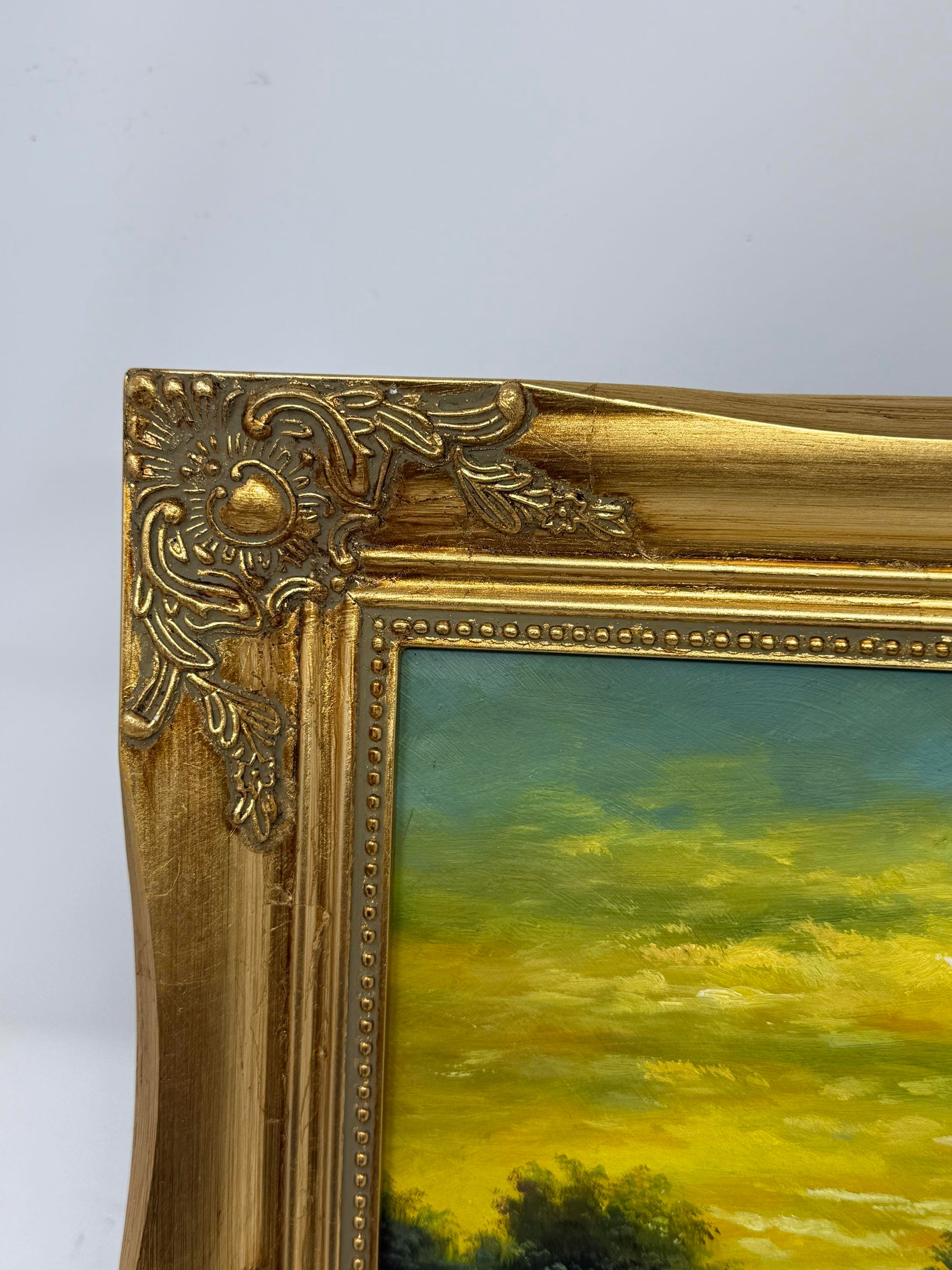 A luminous sky glows in radiant shades of gold and green, casting its brilliance across the quiet river. Along the grassy bank, a small cottage with a blue roof rests near grazing cattle, while a lone boat drifts gently downstream. The scene, painted in rich textured layers, captures the warmth and serenity of evening light in the countryside.