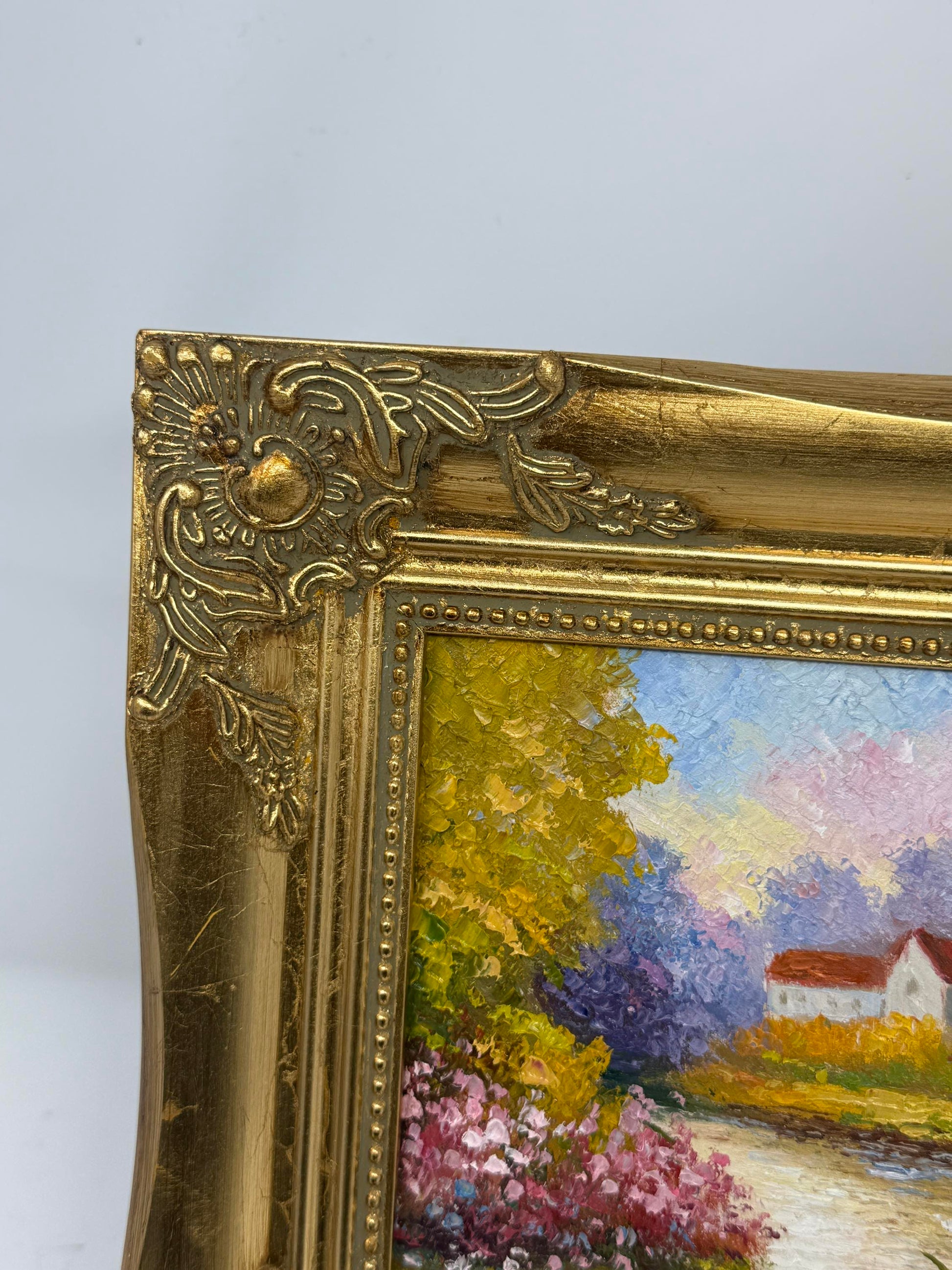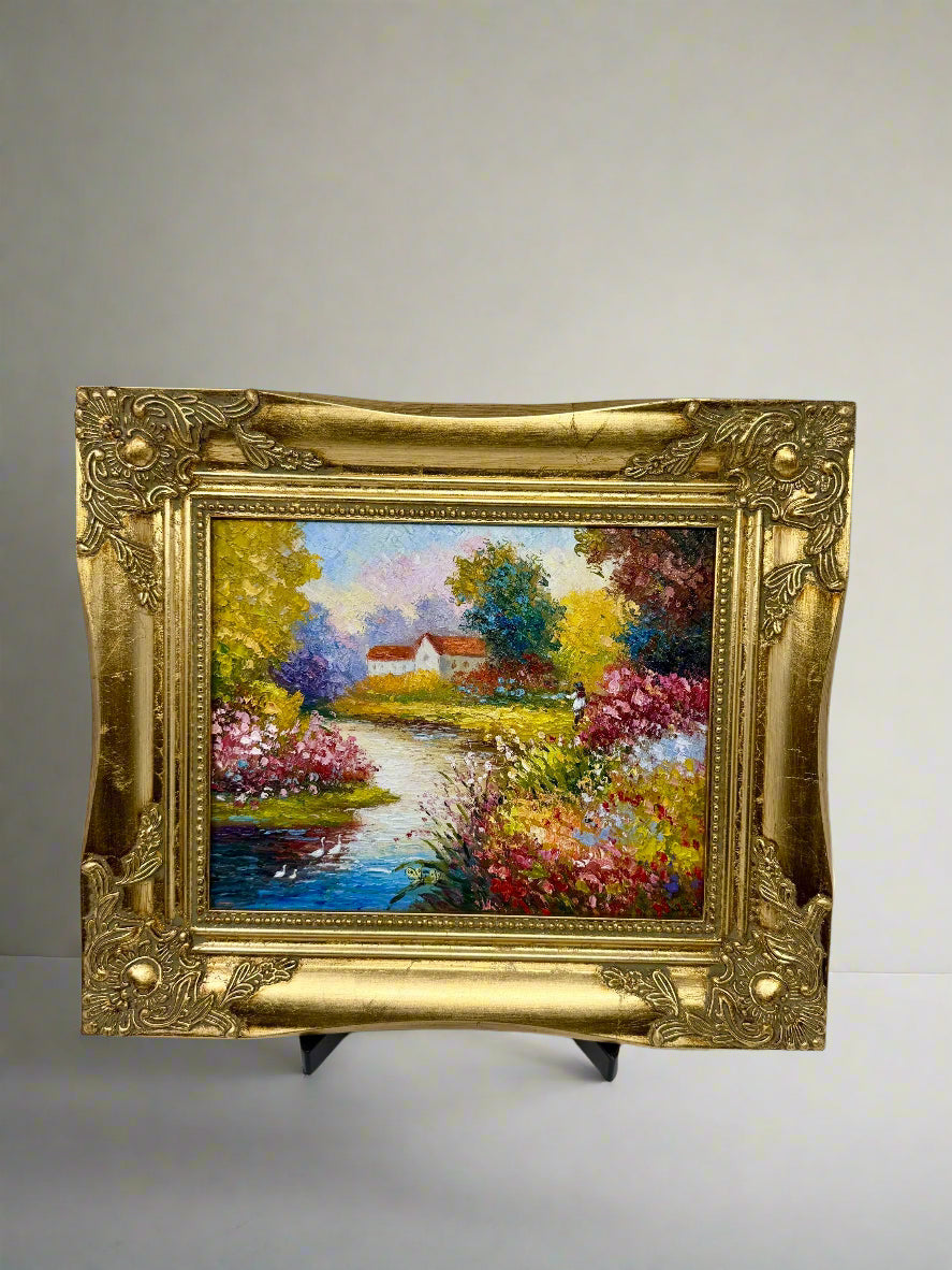 A quiet stream winds past flowering banks in radiant pinks, yellows, and greens, leading to a white cottage glowing in the afternoon light. Tall trees rise in the distance, their foliage soft against the sky, while swans drift gently across the water. Painted in lively, textured strokes, the scene brims with warmth, color, and countryside charm.