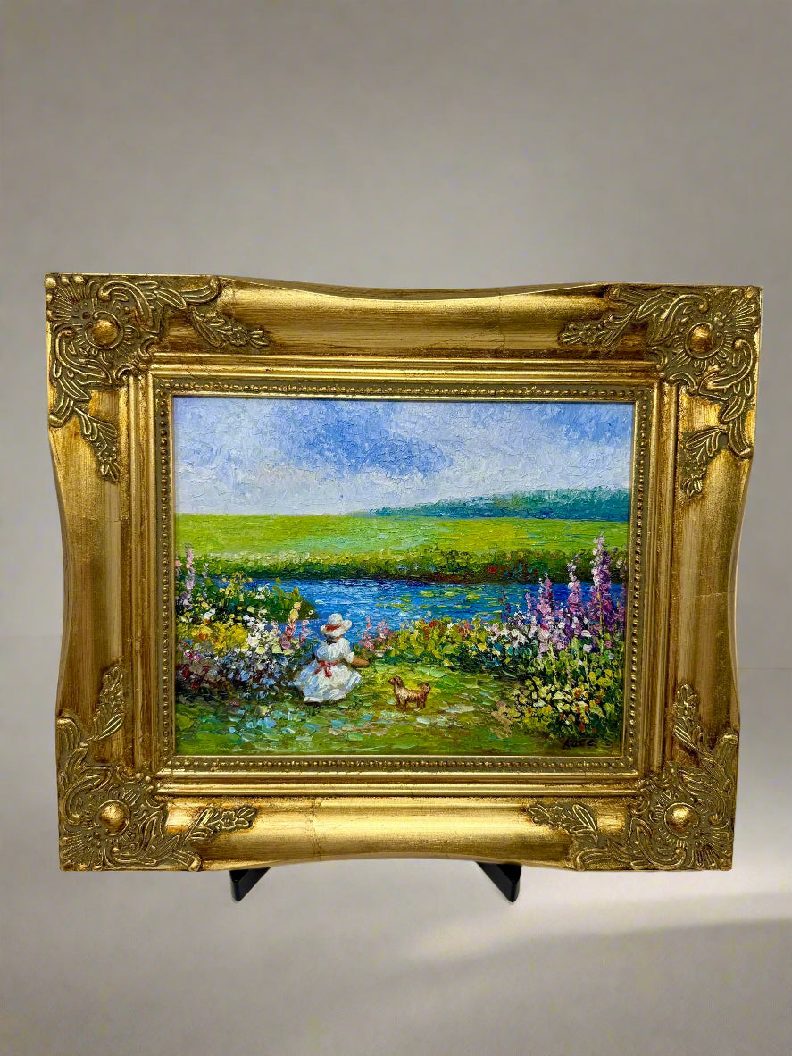 A young woman in a white dress and broad sunhat sits by the flowering river’s edge, her small dog at her side. Beyond the vibrant garden blooms, the water reflects the azure sky, stretching into rolling green hills on the horizon. The scene glows with pastoral tranquility, painted in rich, textured strokes that capture both the stillness of nature and the gentle companionship of the moment.
