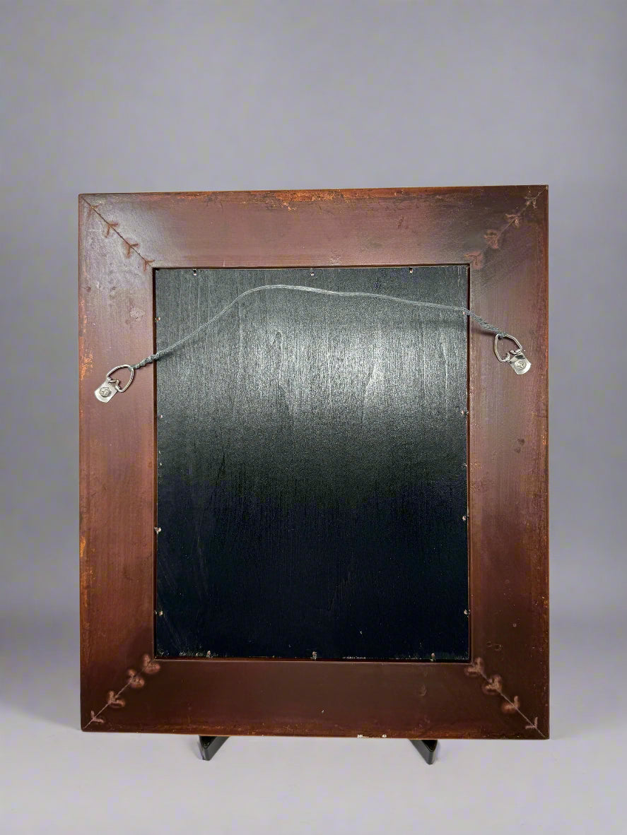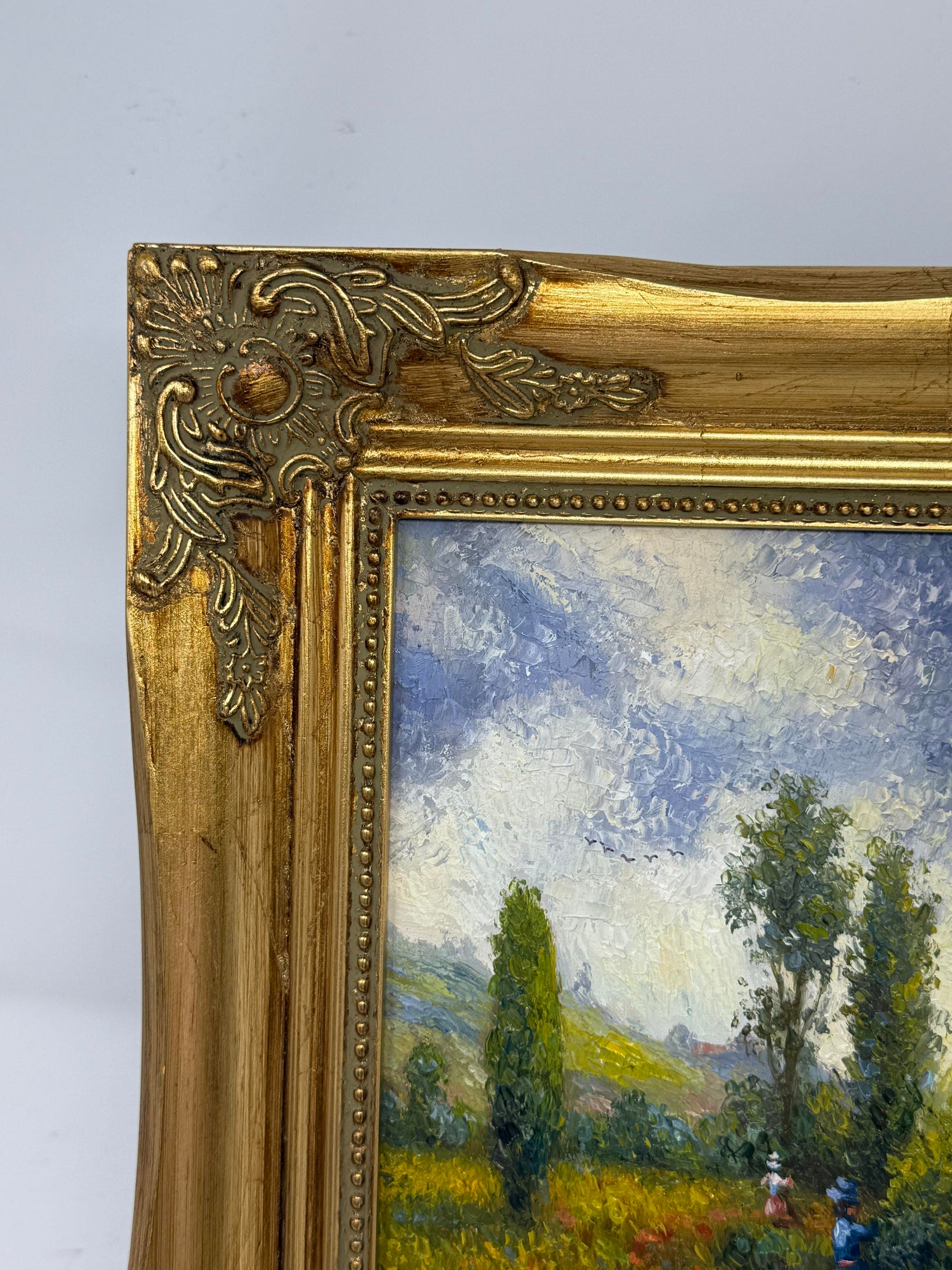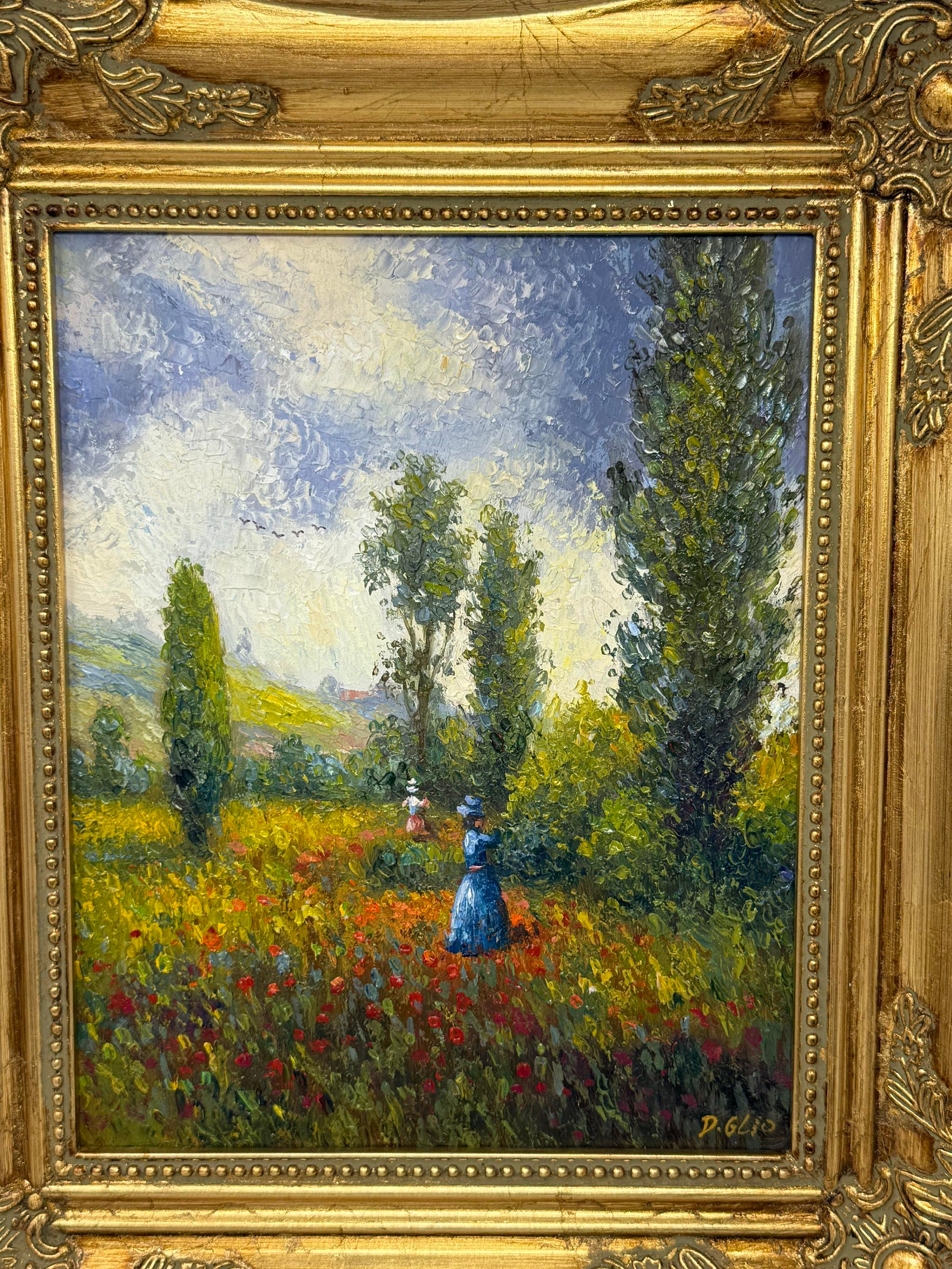 Two figures in blue dresses wander through a field awash with red and gold wildflowers, framed by towering poplar trees that reach toward a luminous sky. The artist’s bold brushwork and layered textures capture both the sweep of the landscape and the intimacy of a quiet countryside stroll. The ornate golden frame enhances its timeless charm, presenting the work as a radiant heirloom piece that speaks of pastoral beauty and serenity.