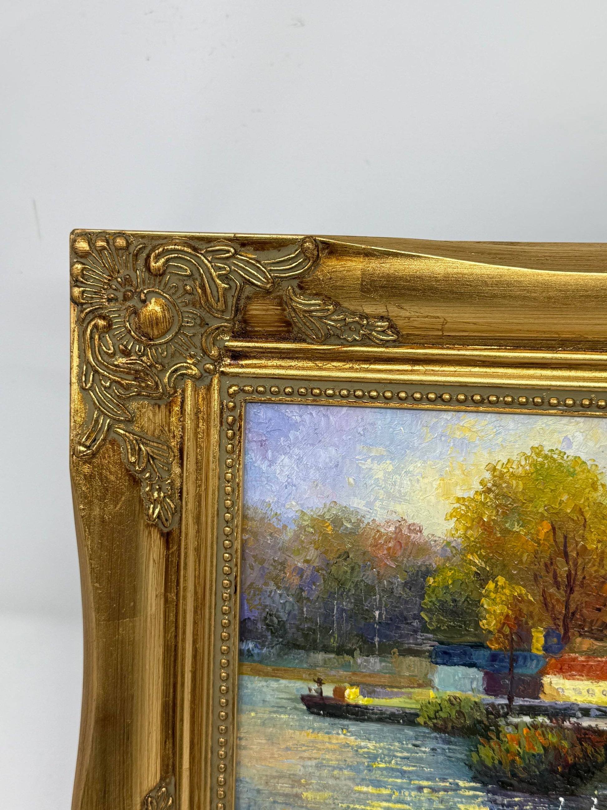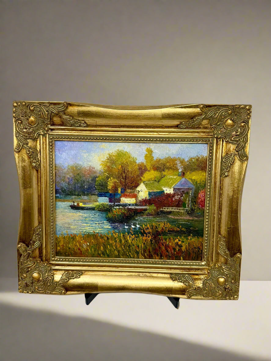 Cottages with red and white roofs line a quiet river, their reflections shimmering across the water beneath the golden glow of autumn trees. A small boat glides near the shore, while a pair of swans drifts peacefully in the foreground. Painted with textured impasto, the scene balances the warmth of village life with the calm beauty of nature.