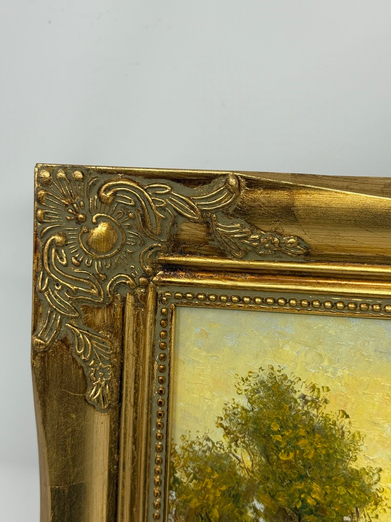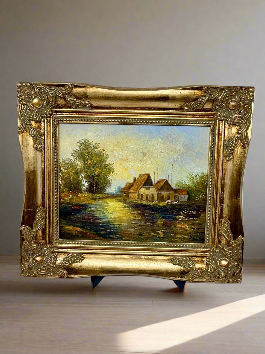 Golden evening light reflects across the quiet river, leading the eye toward rustic cottages nestled among trees. A small boat rests near the bank while warm tones of yellow, green, and brown infuse the water and sky with a tranquil glow. Painted with textured impasto, the work carries the timeless calm of rural life along the water’s edge.