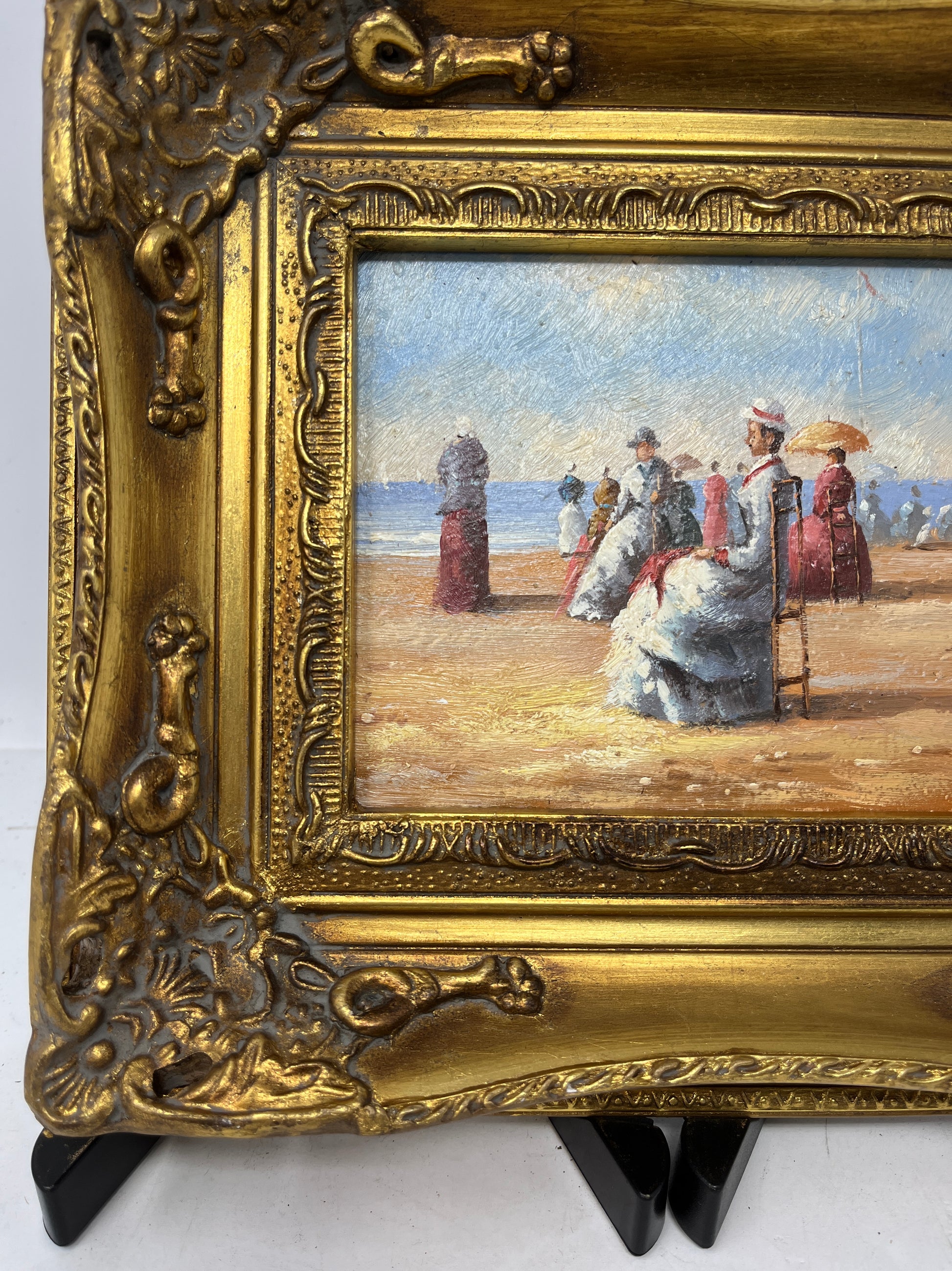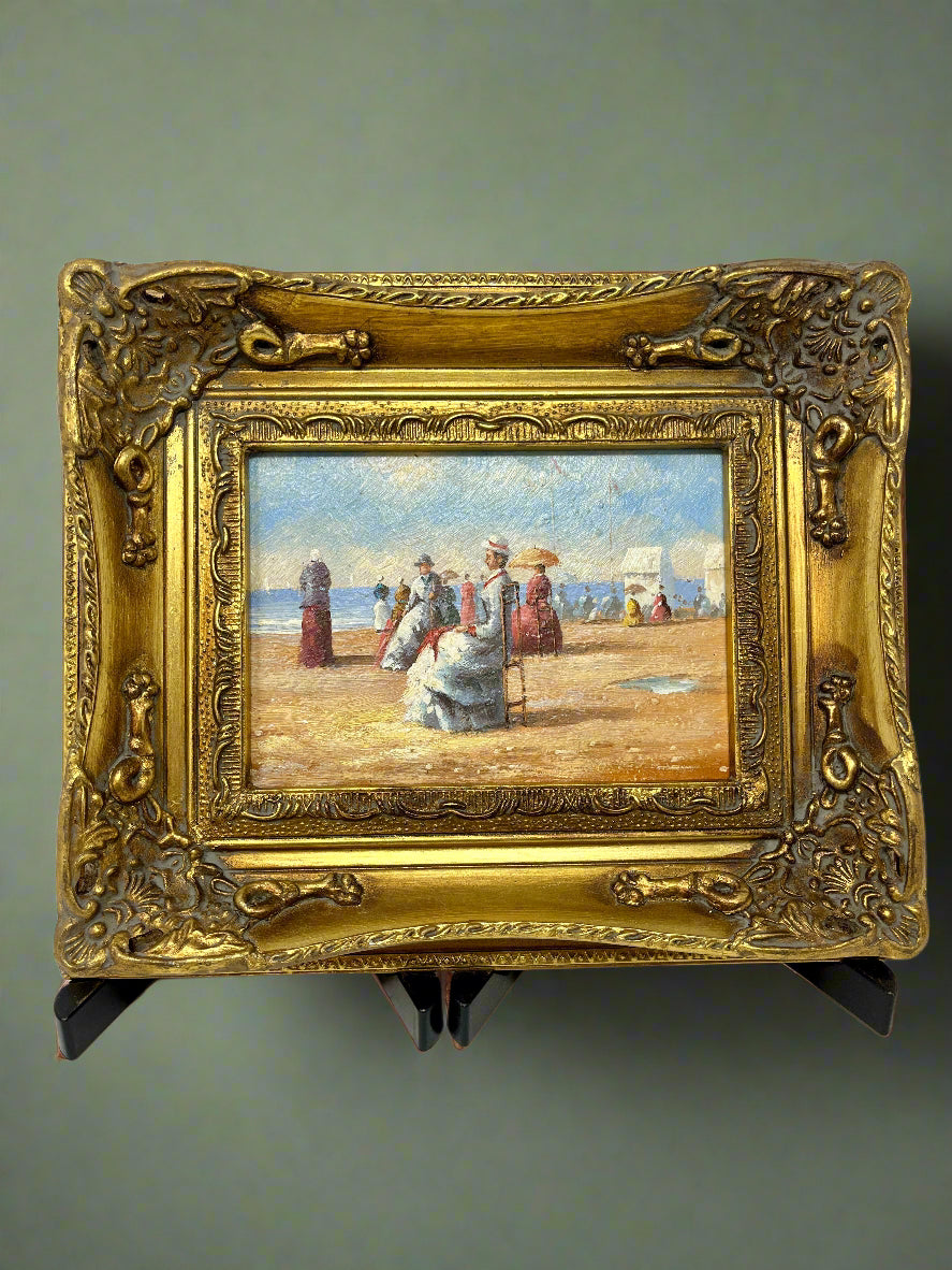 This delightful 5x7-inch oil painting, framed to an elegant 10x12 inches, captures the charm of a bustling seaside scene. Victorian-era figures, adorned in period attire, gather along the sandy shore under vibrant parasols, evoking a sense of nostalgia and leisurely summer days. The soft brushwork and warm palette beautifully illustrate the idyllic coastal atmosphere. Encased in a finely detailed gold-tone frame, this artwork radiates timeless elegance, making it a perfect addition to a classic or vintage-inspired collection.