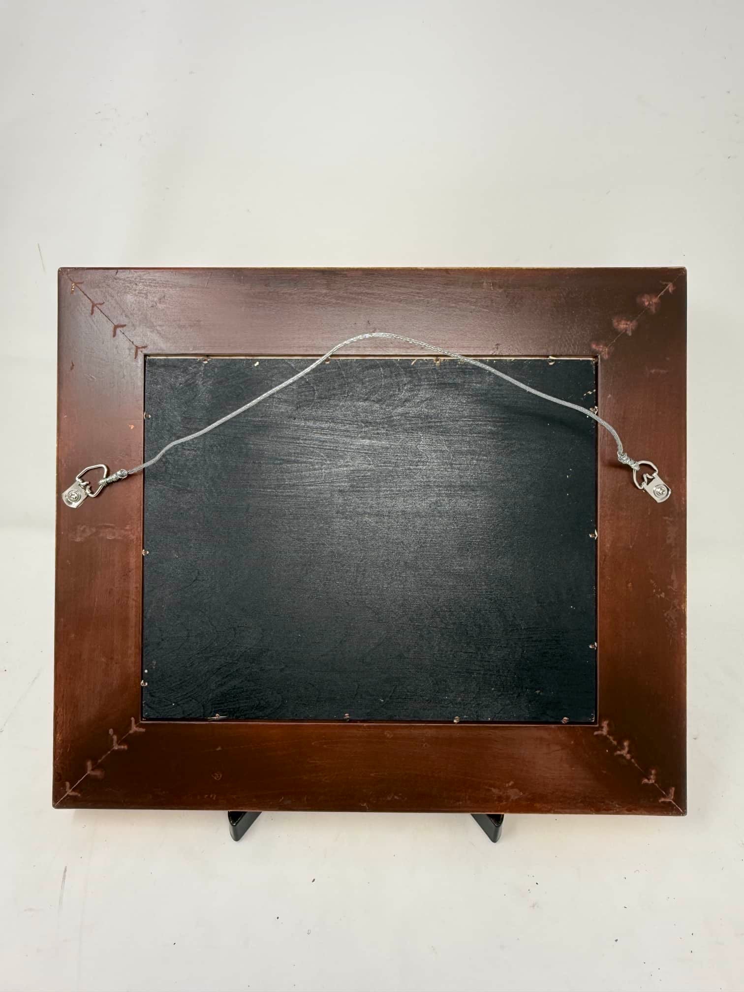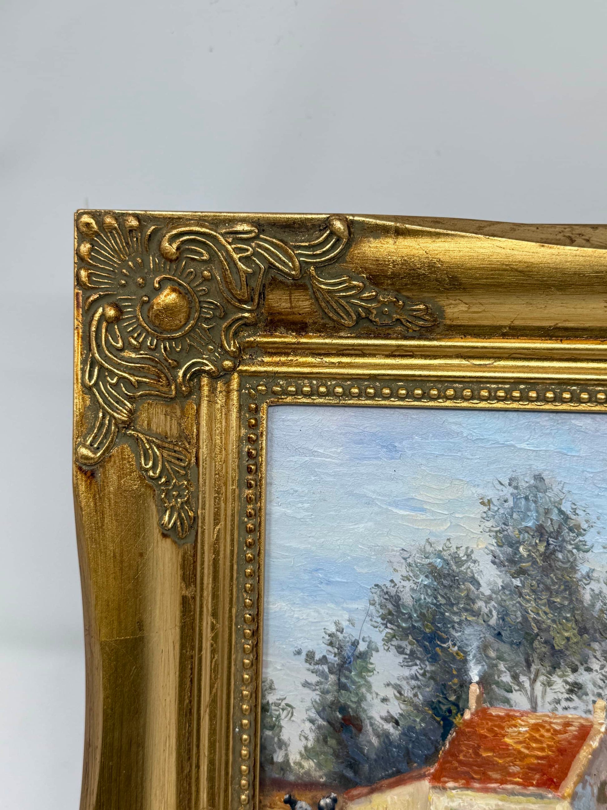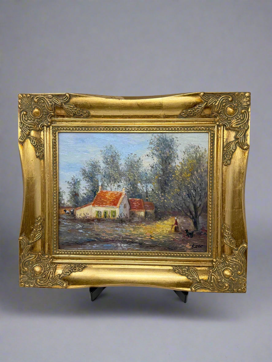 This 8x10 inch oil painting (13x15 inches with frame) invites you into a sun-dappled countryside scene, where a cozy white cottage with a red-tiled roof nestles under tall trees. A woman strolls quietly with her dog, their shadows stretched long in the golden light. The brushwork is expressive, the ground rich with textured strokes of ochre, brown, and violet. There’s a stillness here—but not silence. You can almost hear the rustle of leaves and the gentle clink of a teacup from inside the cottage. Framed in ornate gold, this piece feels like a memory you didn’t know you missed.