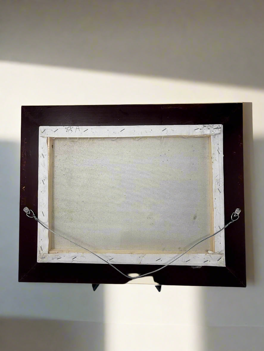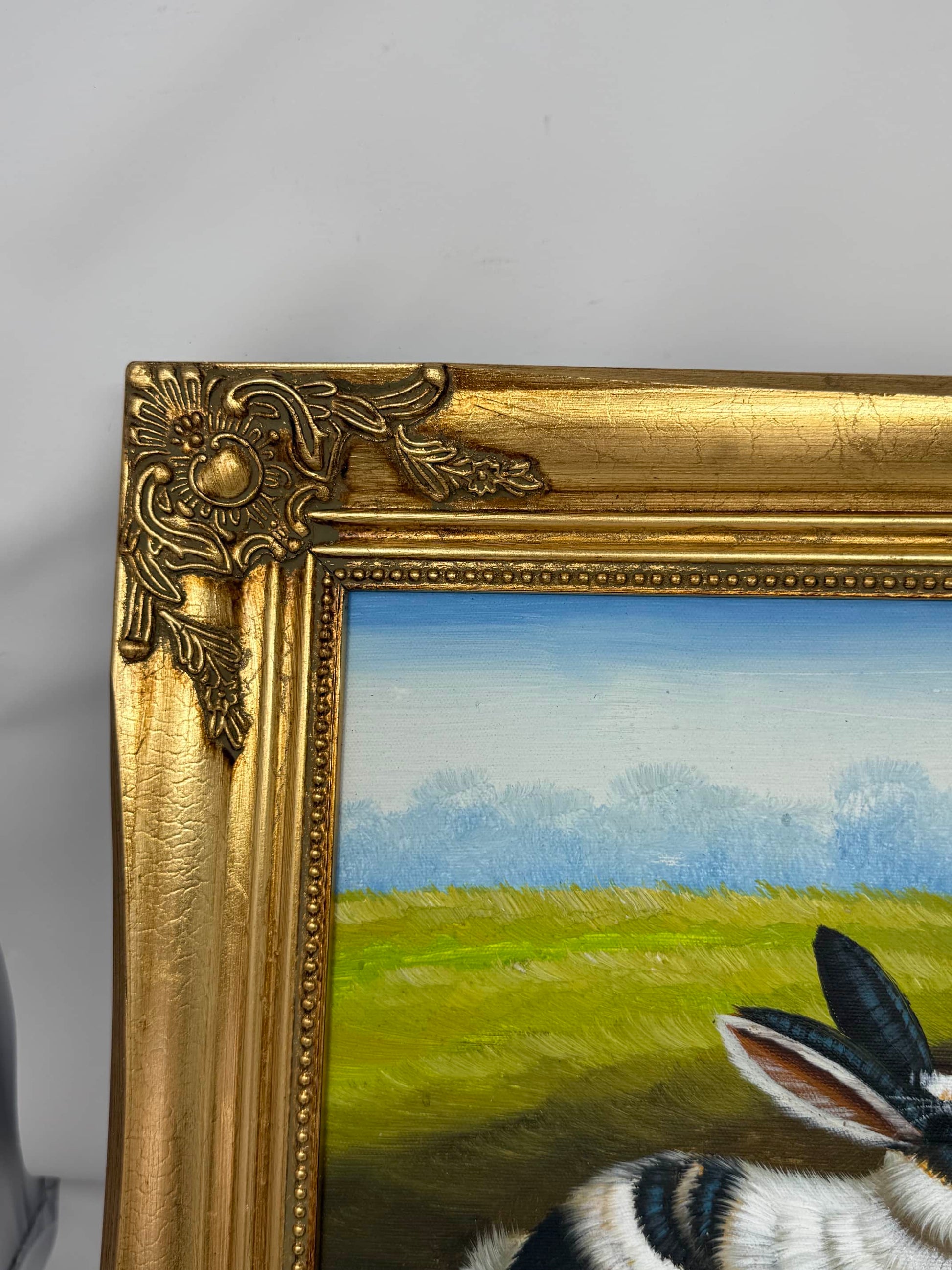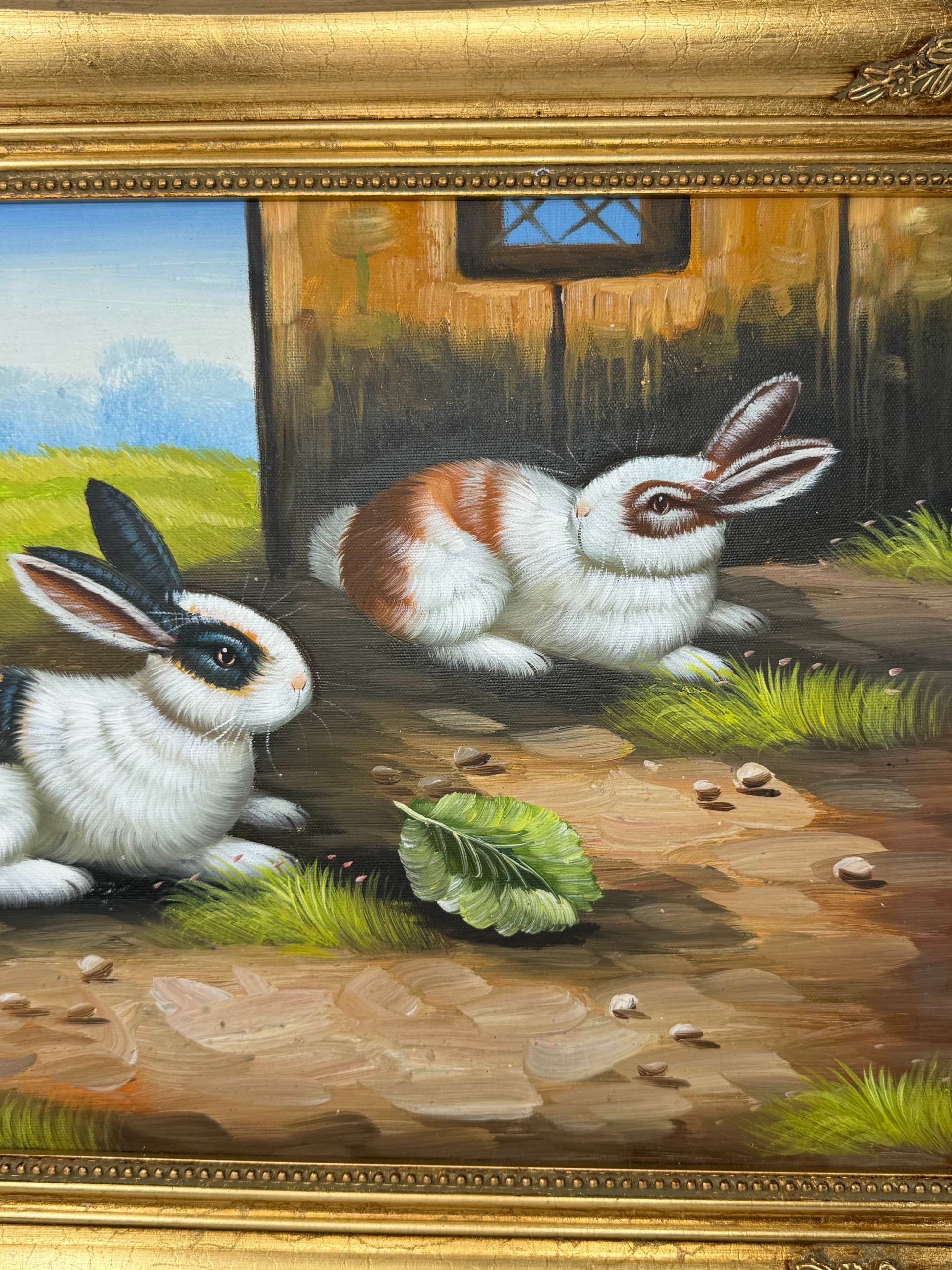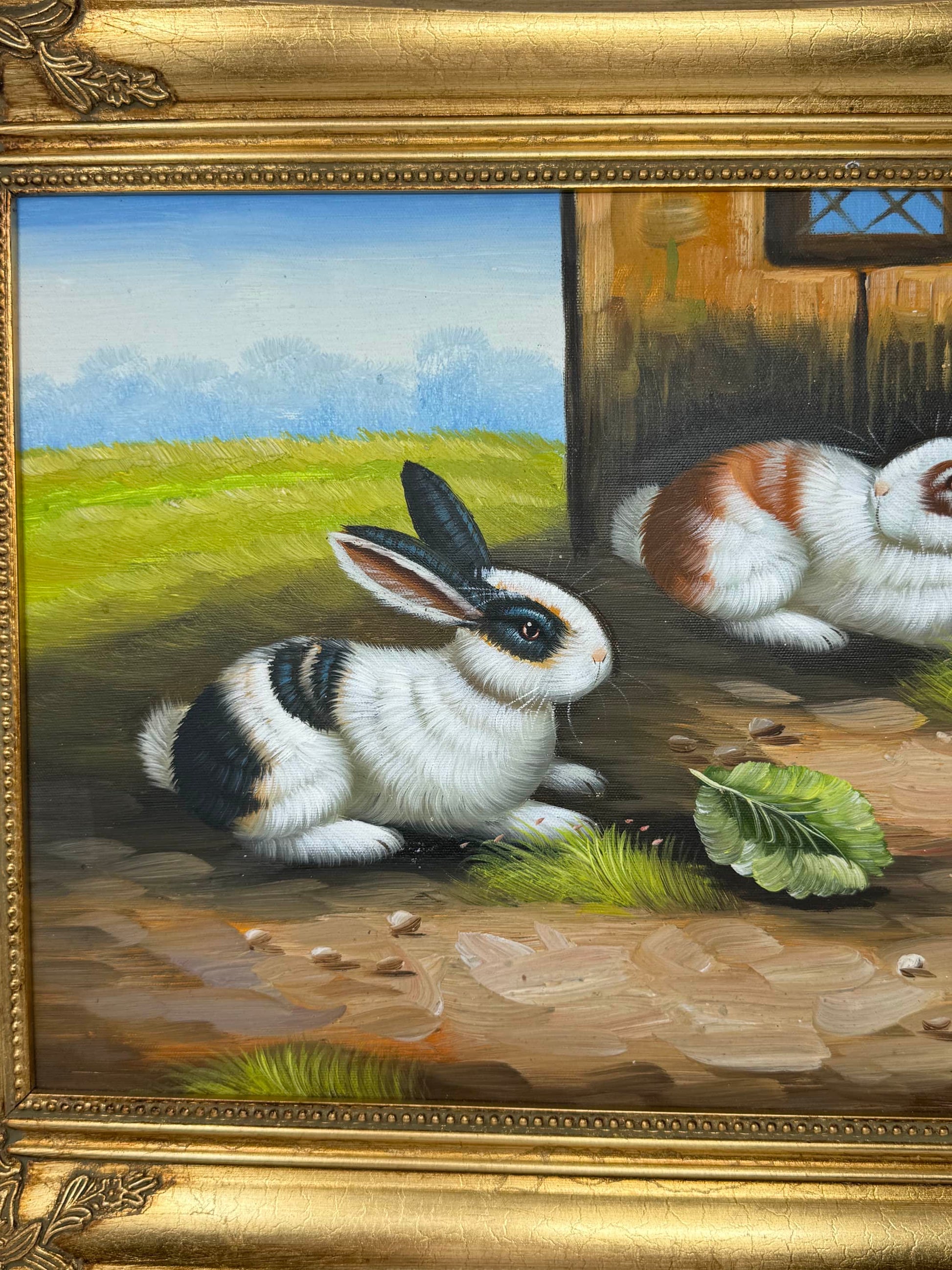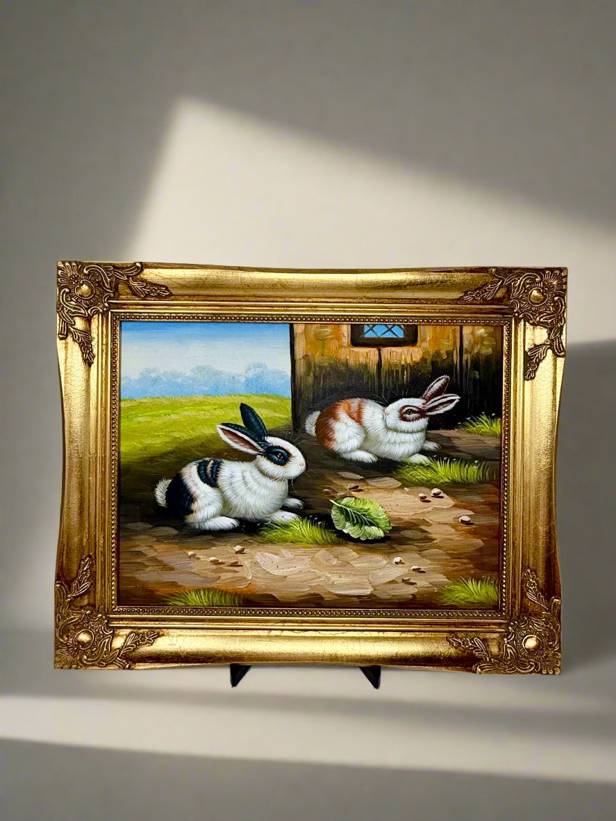 Sunlight spills into a quiet corner of the courtyard, where two rabbits of different markings rest leisurely beside fresh lettuce leaves. The green grass in the distance contrasts gently with the rustic wooden wall, creating a warm and peaceful pastoral mood.