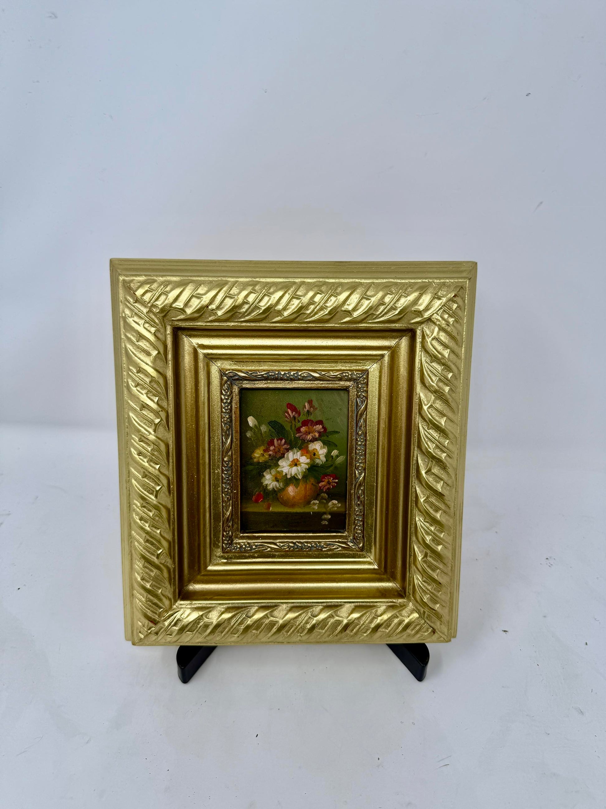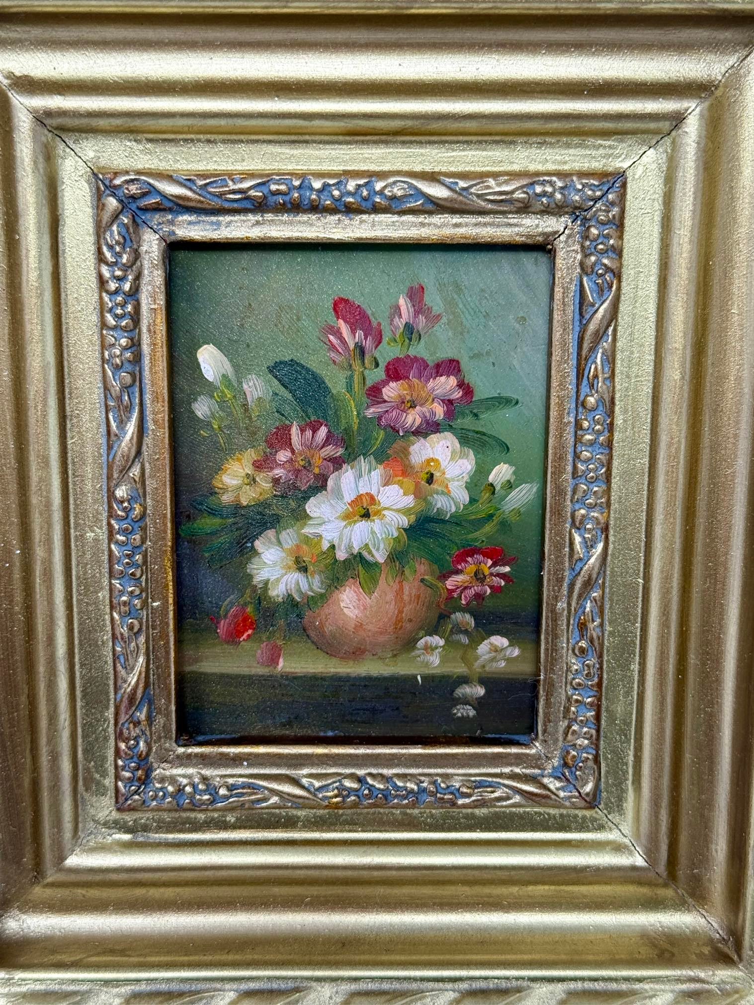 A warm and inviting floral pair from the Heirloom Florals collection, each miniature study features a charming bouquet arranged in soft whites, gentle peaches, and rich autumn reds. The flowers sit against a golden-olive backdrop, giving both pieces a timeless, cozy glow.