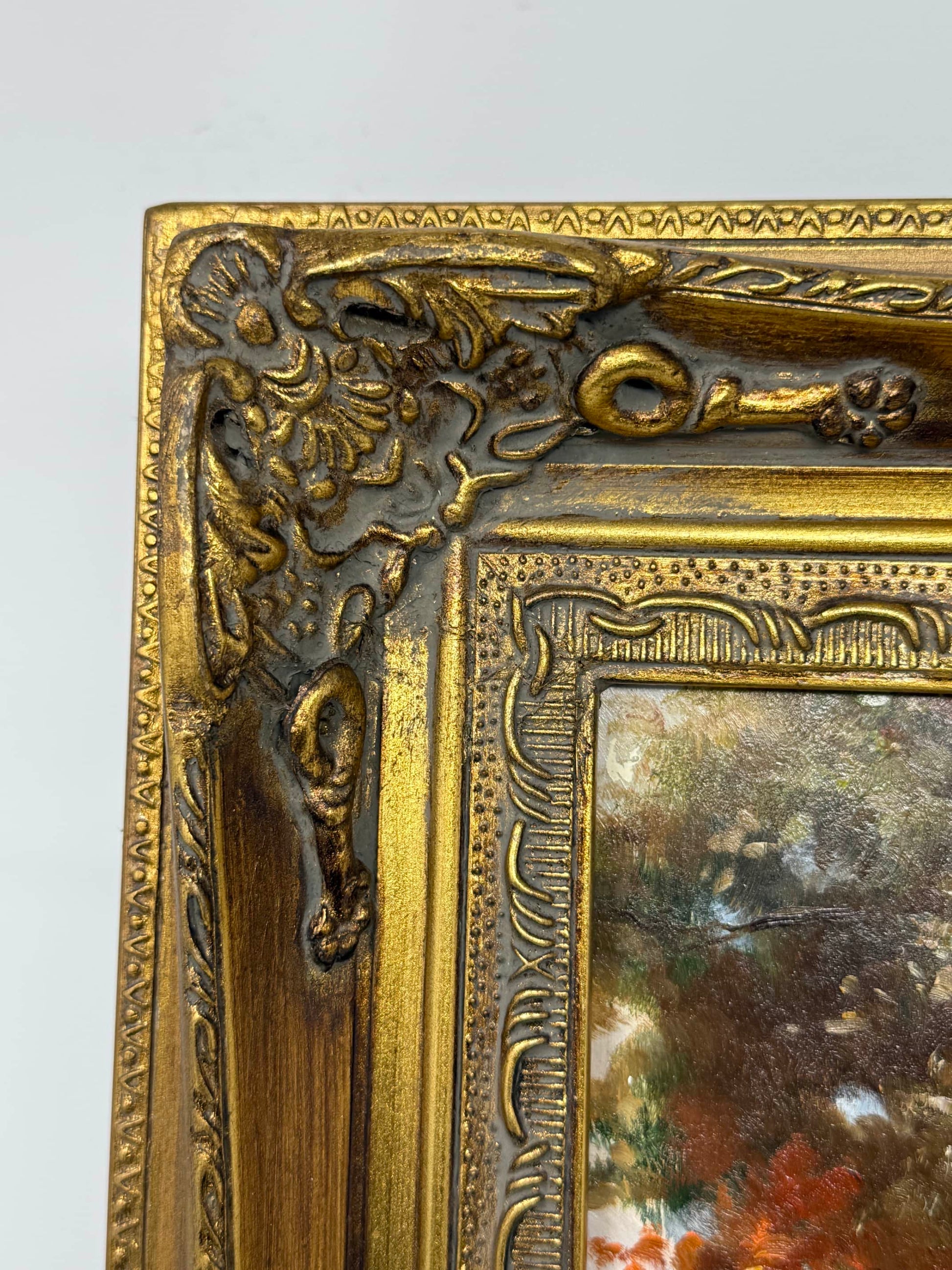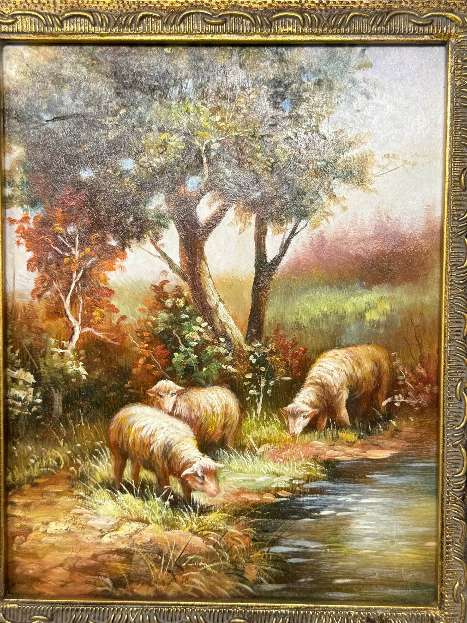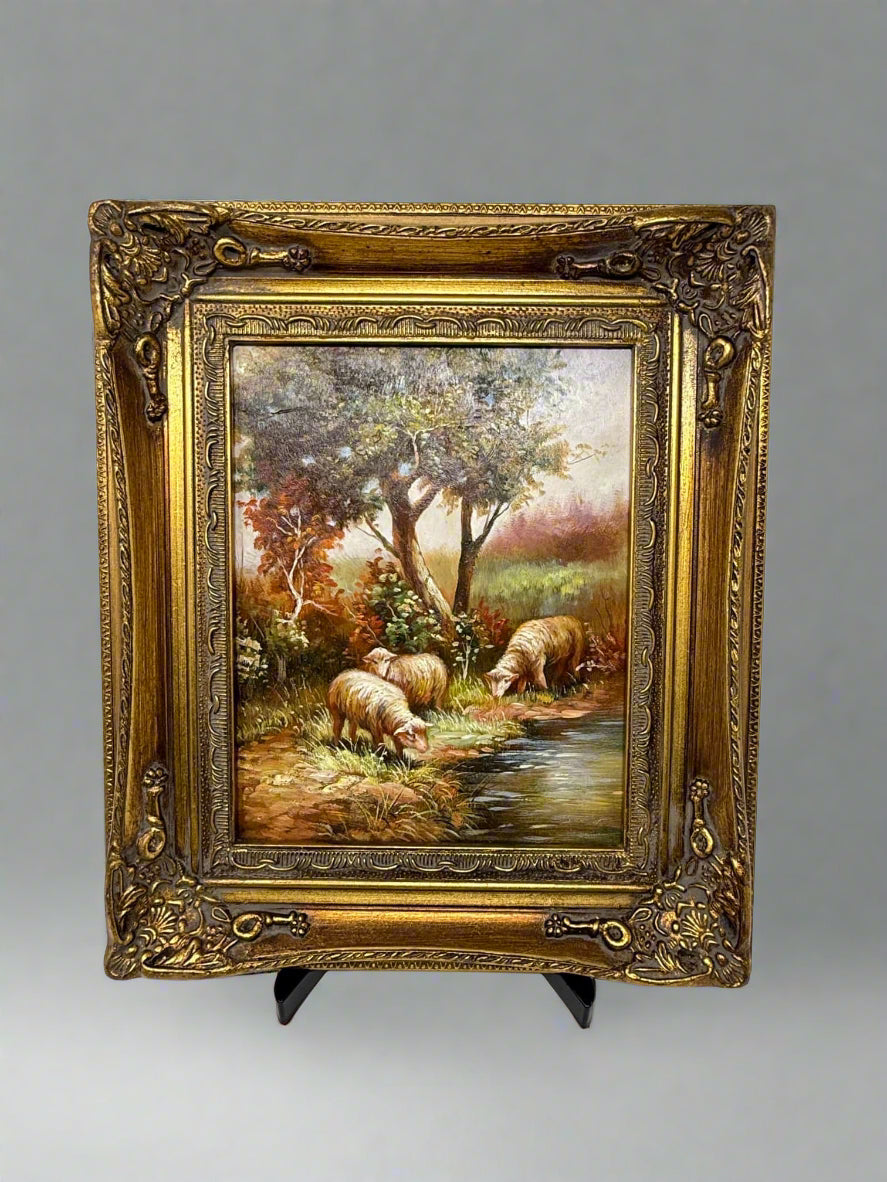 Amber leaves frame a gentle scene of sheep peacefully grazing by a quiet stream, their reflections soft in the rippling water. This 8x10 inch oil painting, set in a finely detailed 12x14 inch antique gold frame, evokes the serenity of autumn’s embrace and the unspoken calm of rural life. A timeless addition for lovers of pastoral charm.