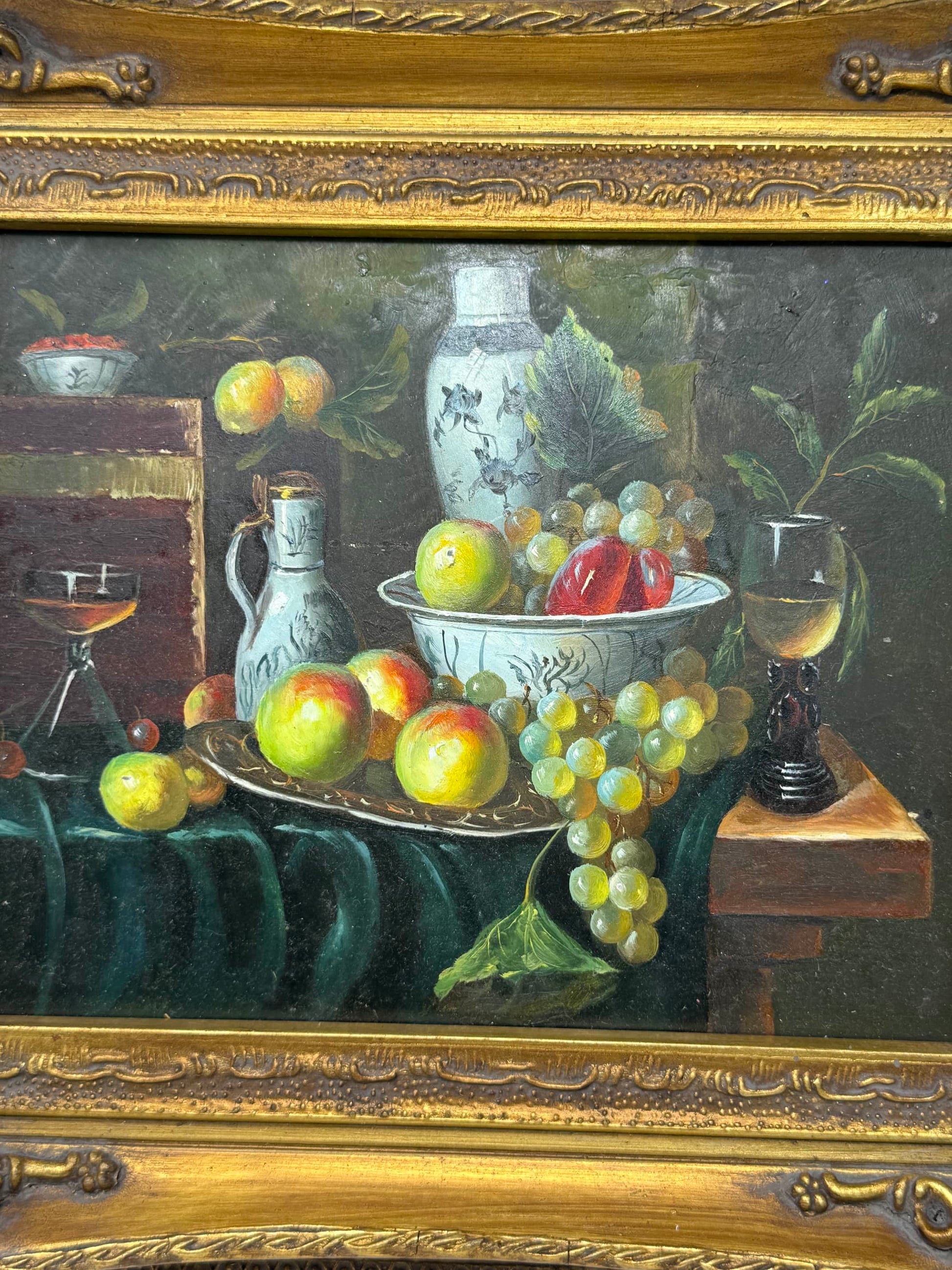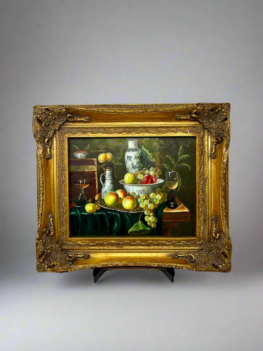 An exquisite vintage oil painting featuring a lavish still life arrangement—golden grapes, apples, a porcelain bowl, wine glass, and teapot—all gathered on a richly draped table. Painted on board, the deep green velvet and ornate details echo the elegance of classical European banquet scenes.
