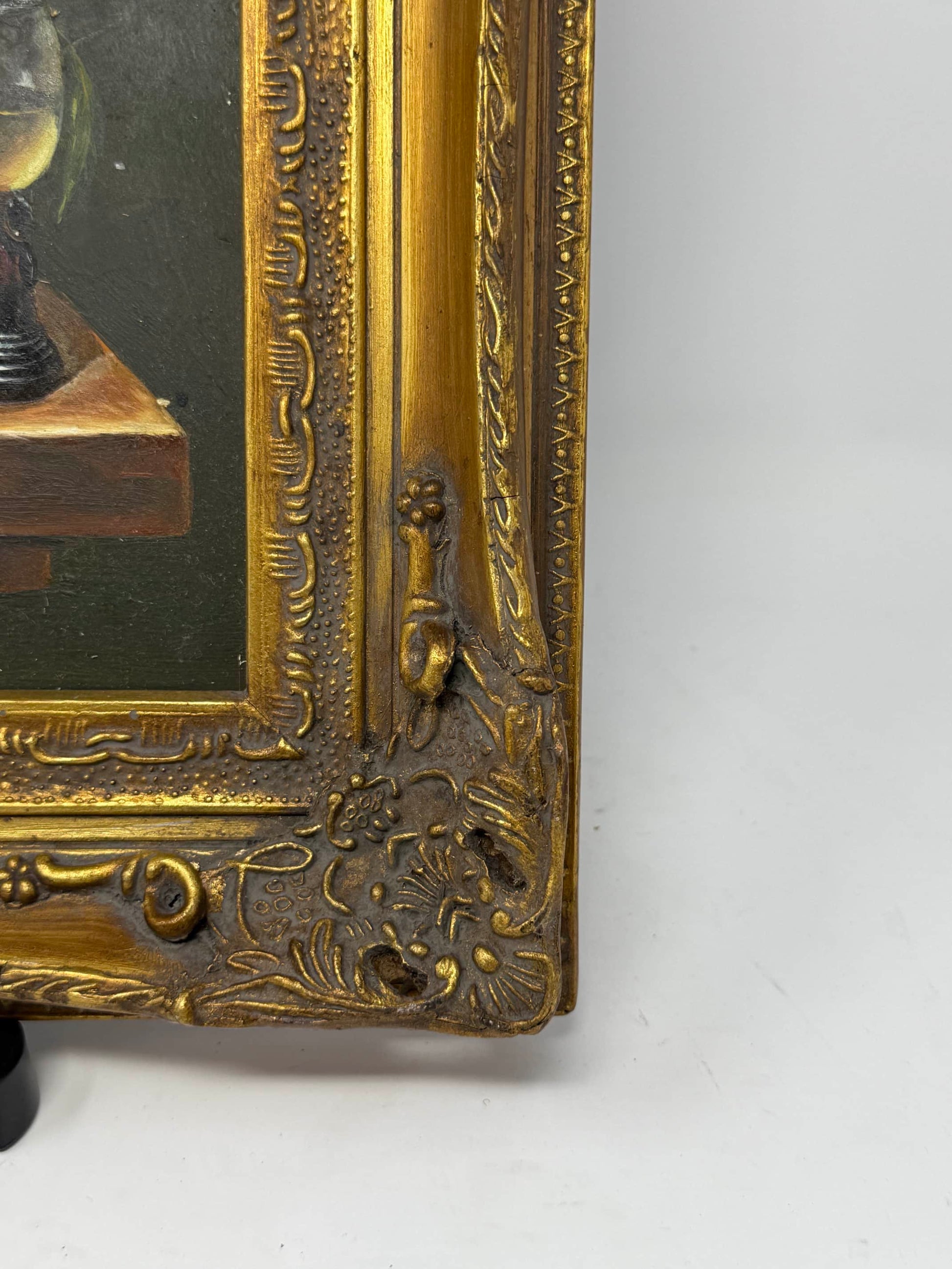 The artwork measures approximately 8 x 10 inches, and with its ornate gold frame, the total size is about 12 x 14 inches. A striking piece for collectors of Old World still lifes and refined vintage interiors.
