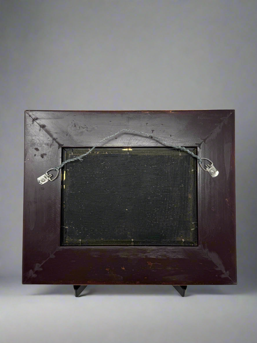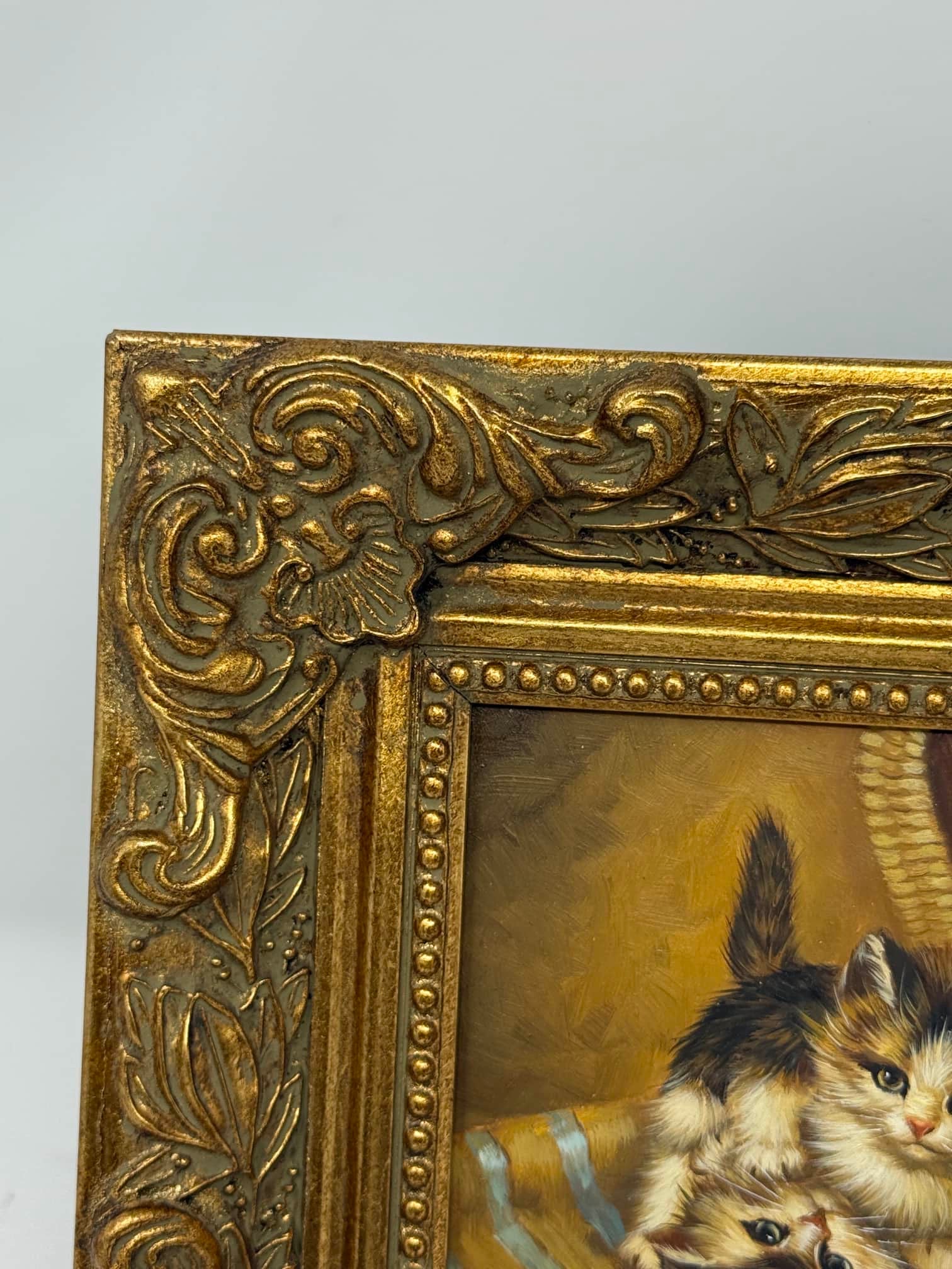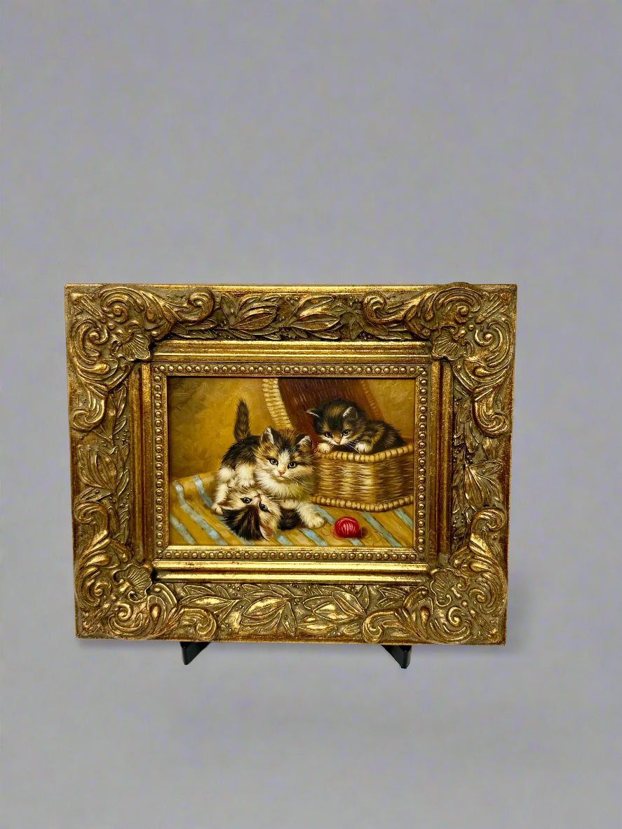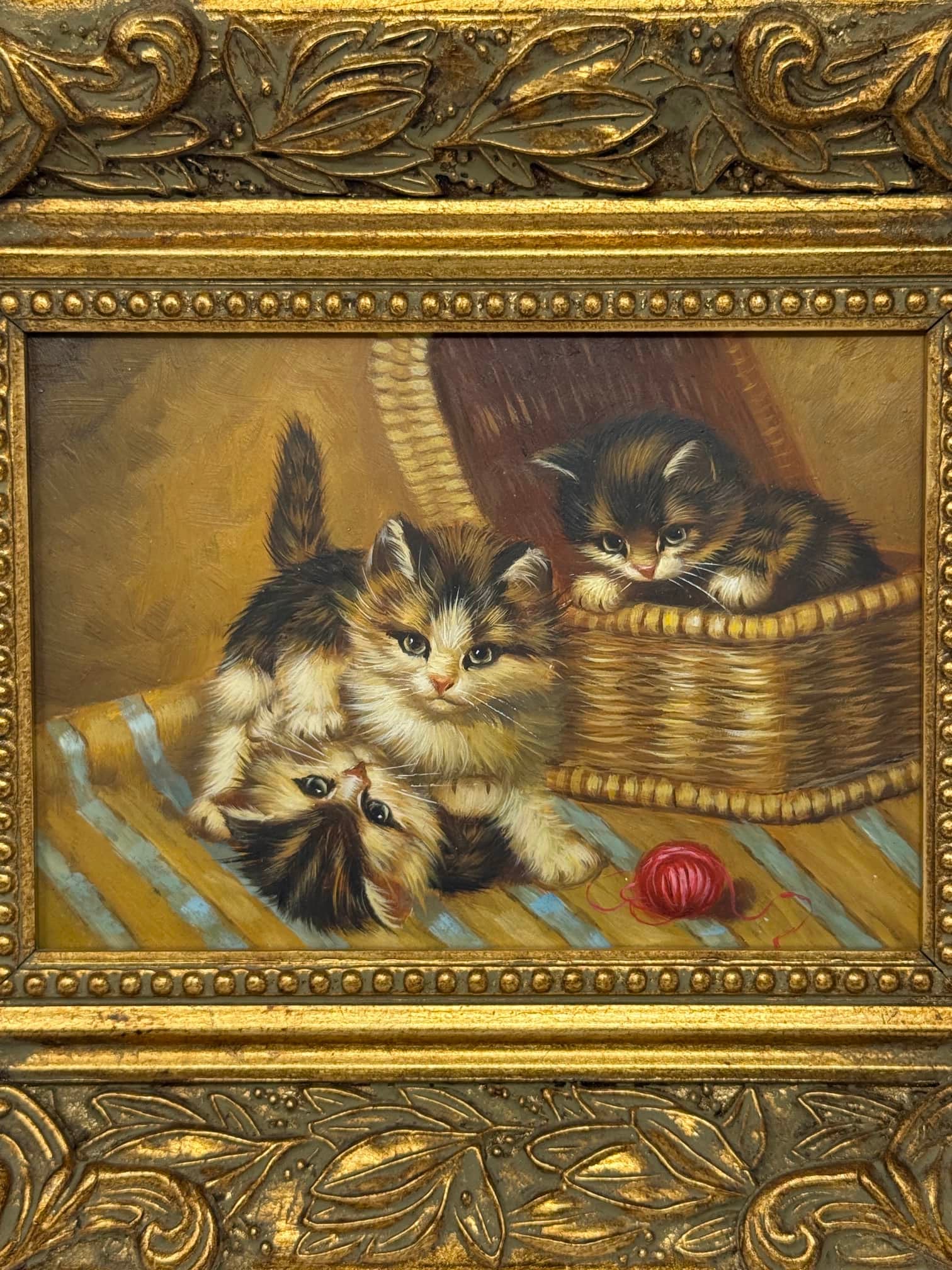 Measuring 5 × 7 inches for the image and 9 × 11 inches overall with the frame, the painting shows two kittens with mottled fur playing beside a woven basket. One peeks out from inside the basket, while the other plays on the rug with a bright red ball of yarn. The vivid colors and fine brushwork capture a lively moment of kitten mischief and innocence.