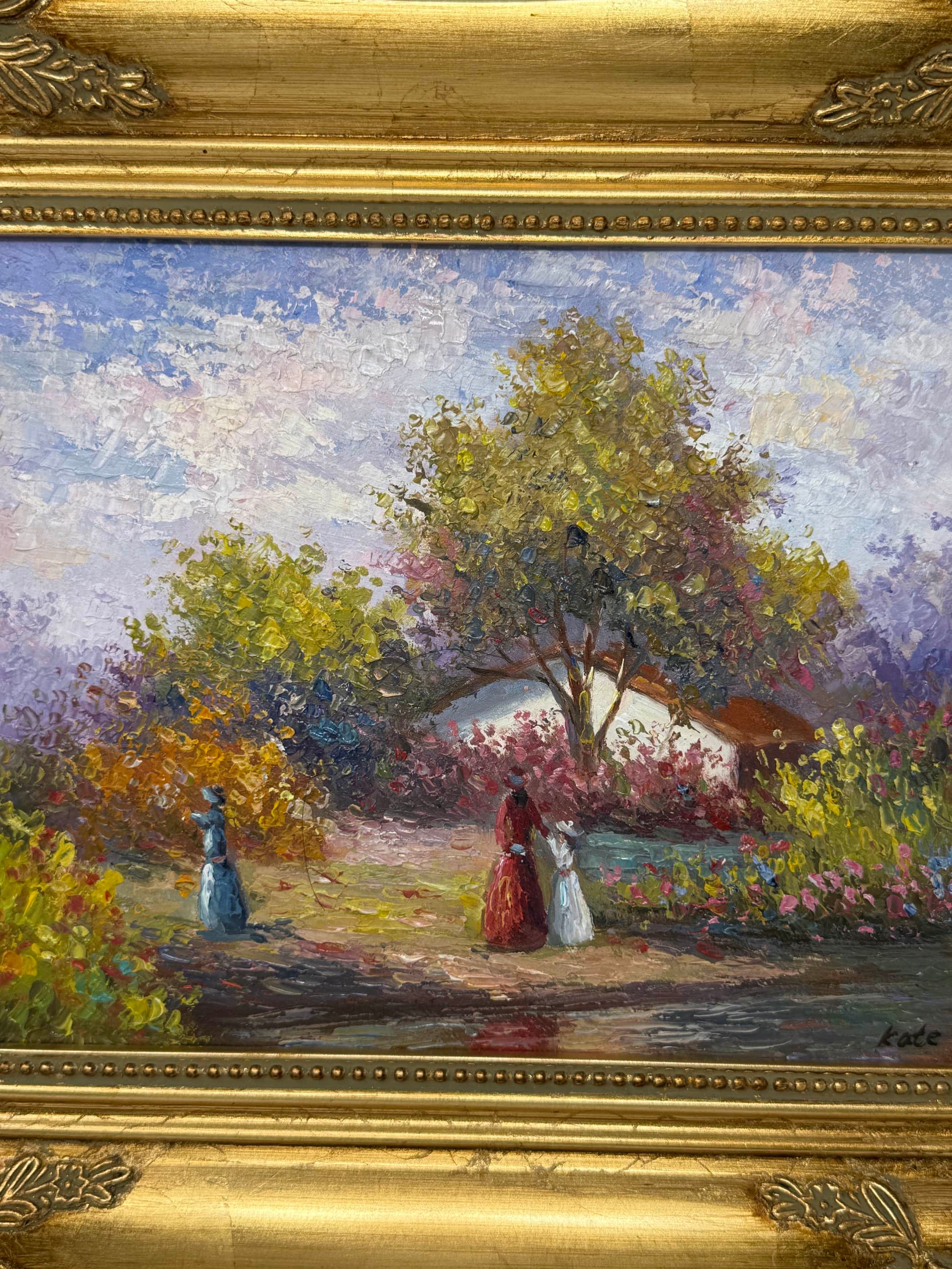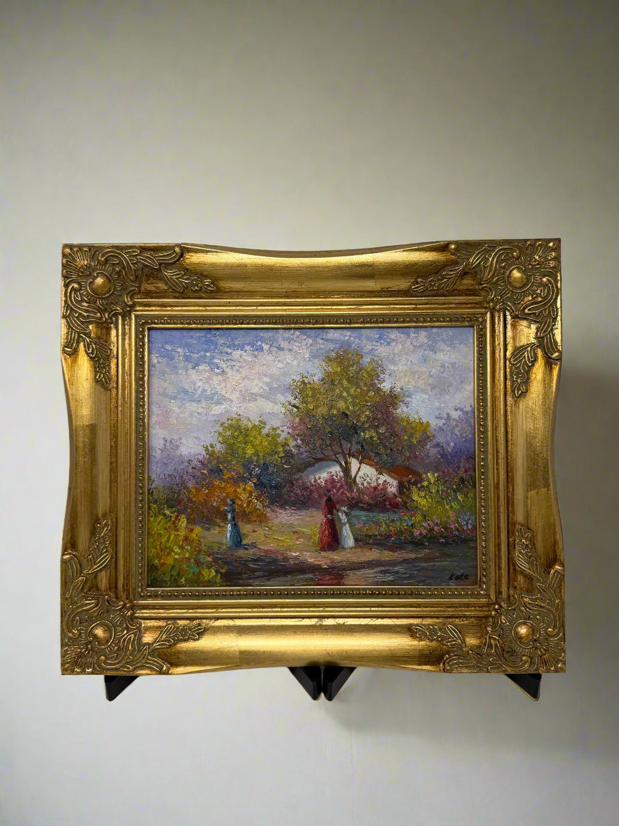 Dappled sunlight filters through blossoming trees as three women stroll through a garden bathed in color. Dressed in gowns of blue, crimson, and ivory, they appear mid-conversation, sharing secrets under the shade of a flowering canopy. In the distance, a charming cottage peeks through the foliage, adding a storybook charm to the scene.