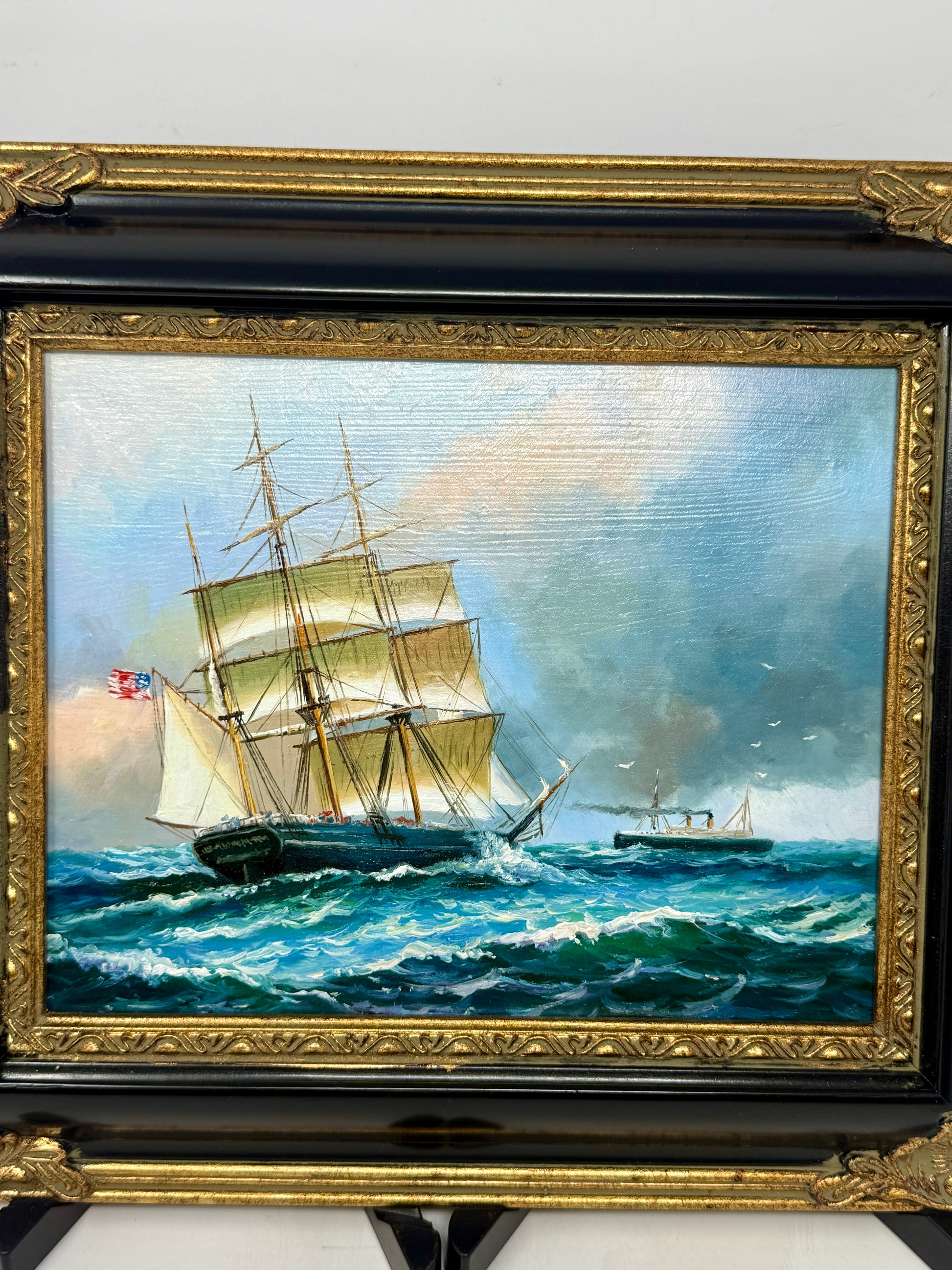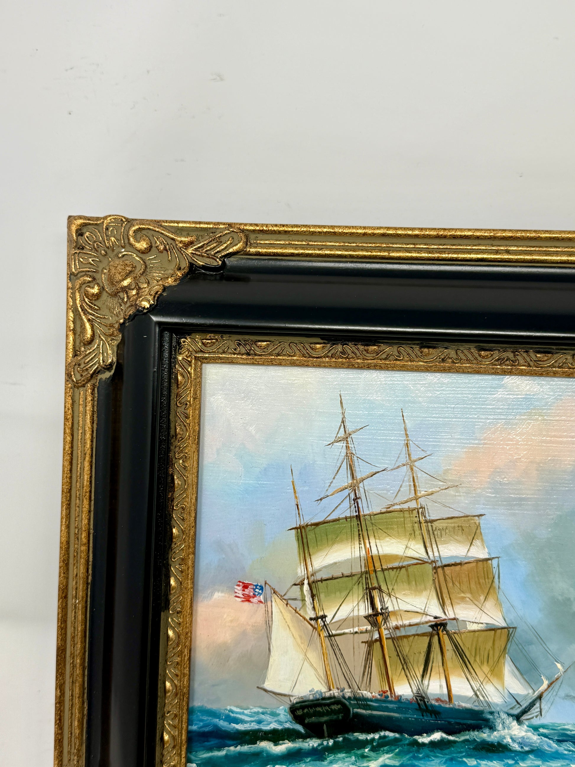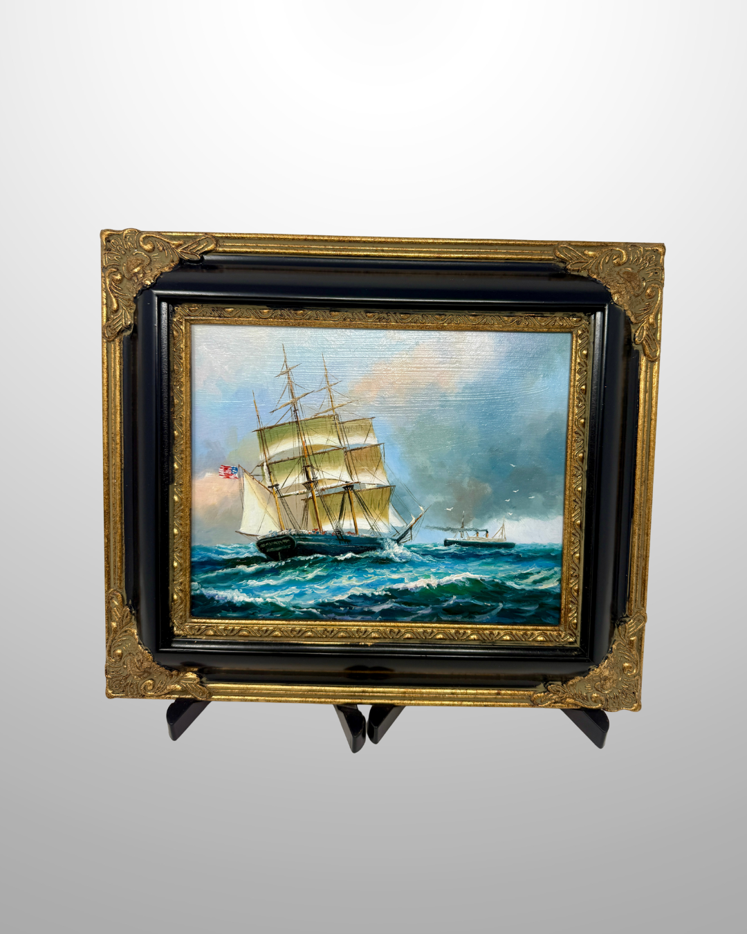 A tall ship cuts through restless water beneath a clearing sky — sails full, horizon steady, momentum undeniable. This 8×10 oil painting captures the quiet tension between motion and calm, where uncertainty fades and direction takes hold.