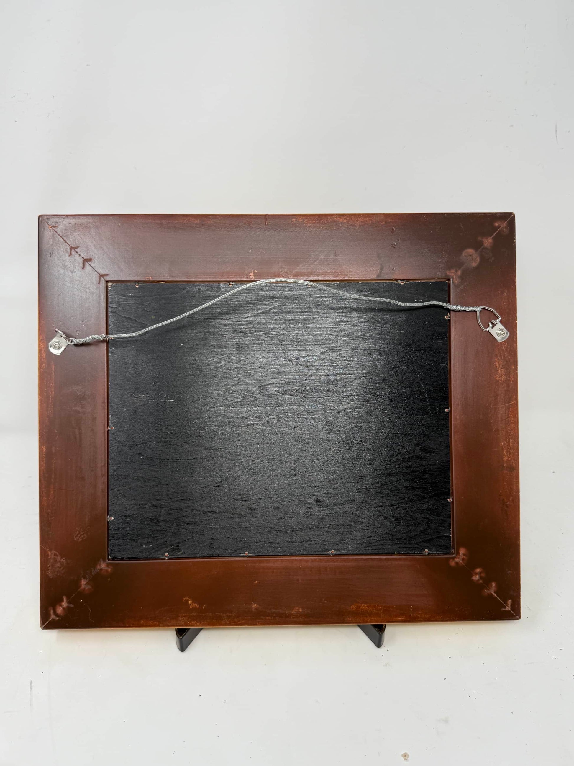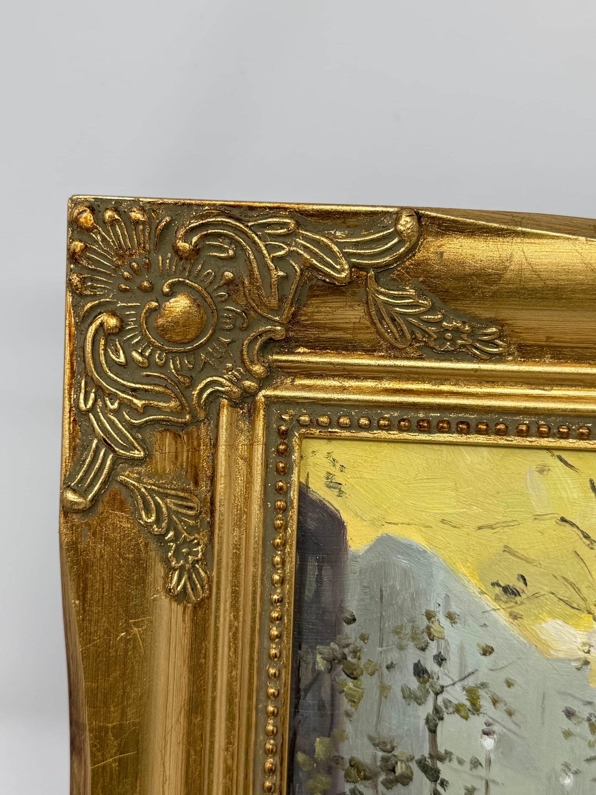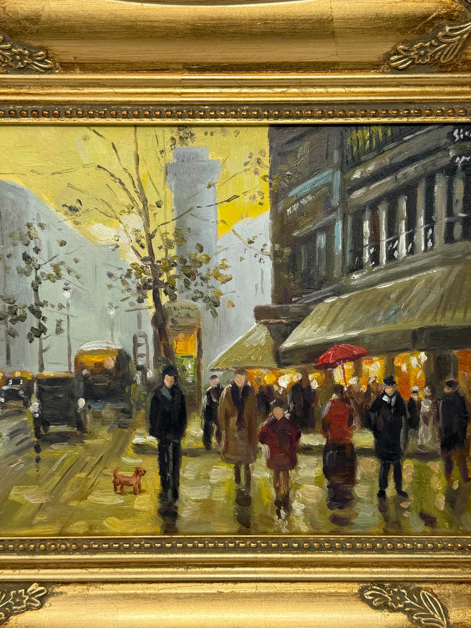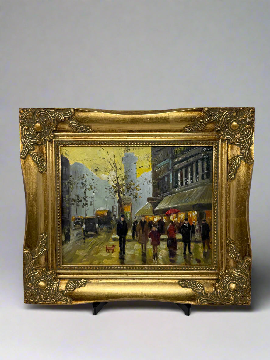 This 8x10 inch oil painting (13x15 inches with frame) transports you to a misty city street bathed in ochre light. Under bare trees and golden skies, figures drift past glowing shop windows—some arm in arm, others lost in thought. A lone man walks his tiny dog, while a splash of red from a passing umbrella breaks the soft palette like a whisper of drama. The brushwork is loose yet intentional, capturing movement, reflection, and fleeting connection. Housed in an ornate gold frame, this piece echoes the soul of a bygone European autumn.