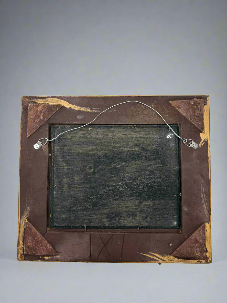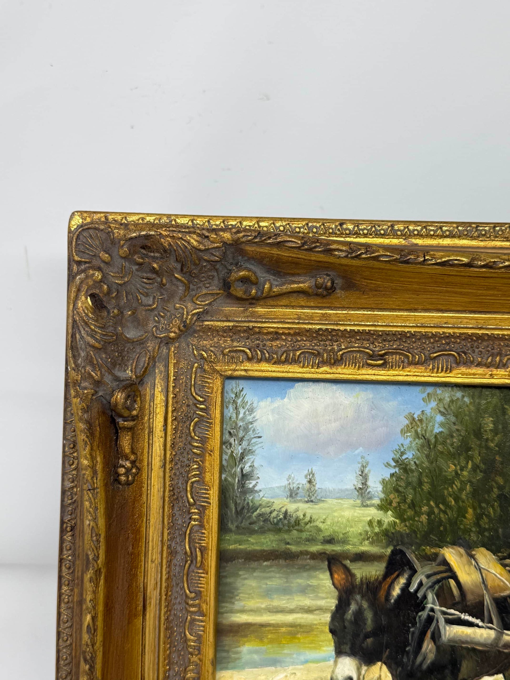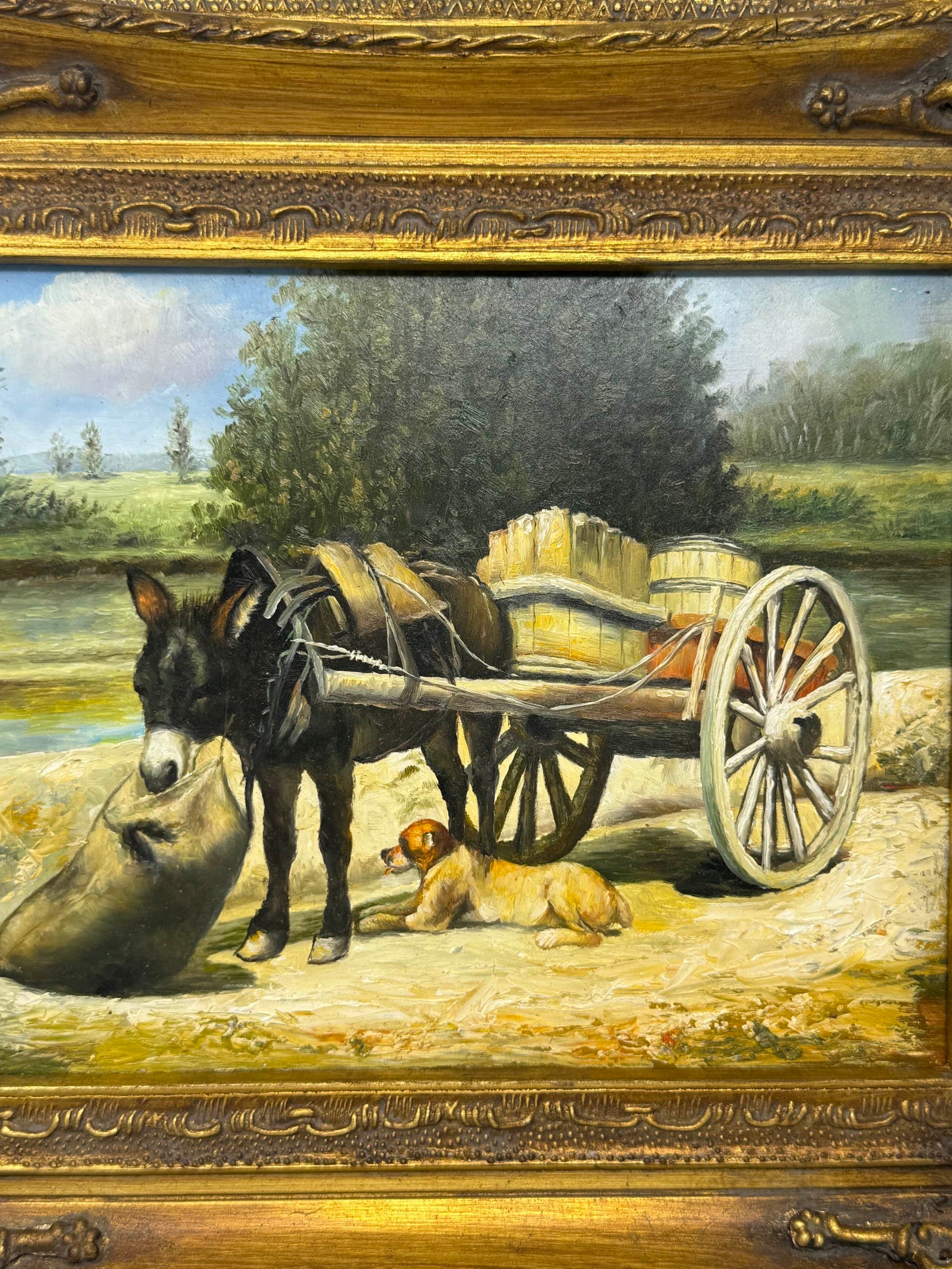 Measuring 10 × 12 inches for the image and 12 × 14 inches overall with the frame, the painting depicts a black donkey harnessed to a wooden two-wheeled cart, pausing along a country path to feed from a burlap sack. Beside it, a small dog rests quietly in watch. The river and trees in the background bring a fresh and tranquil rural charm to the scene.