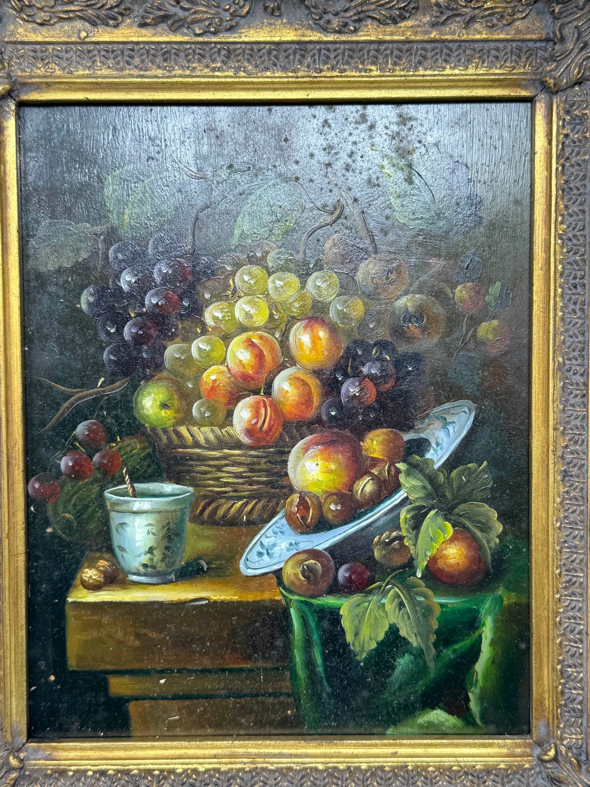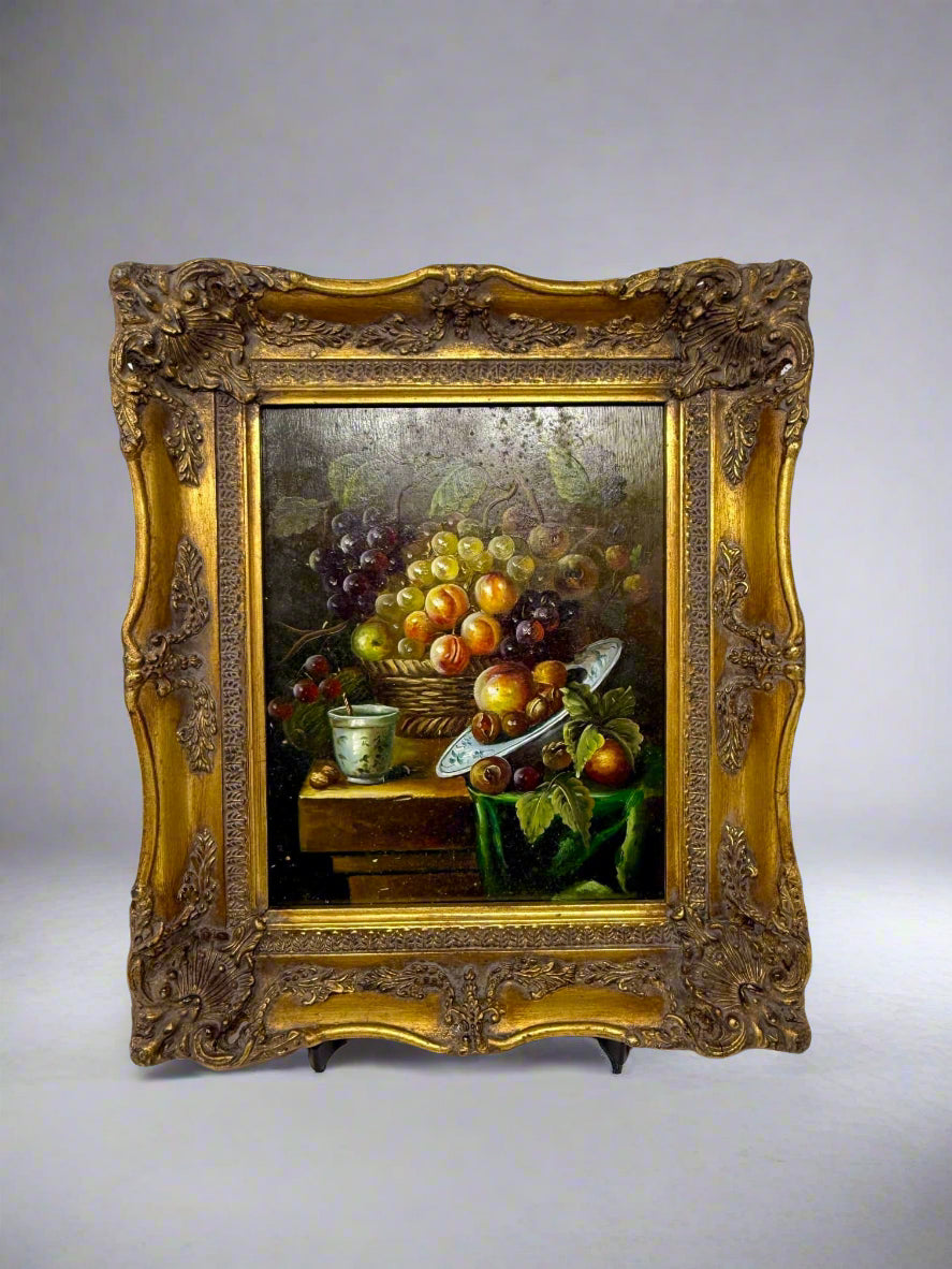 A dramatic vintage oil painting featuring an opulent arrangement of grapes, plums, citrus, and a porcelain cup, all set against a rich green velvet drape. Painted on board with deep shadows and j