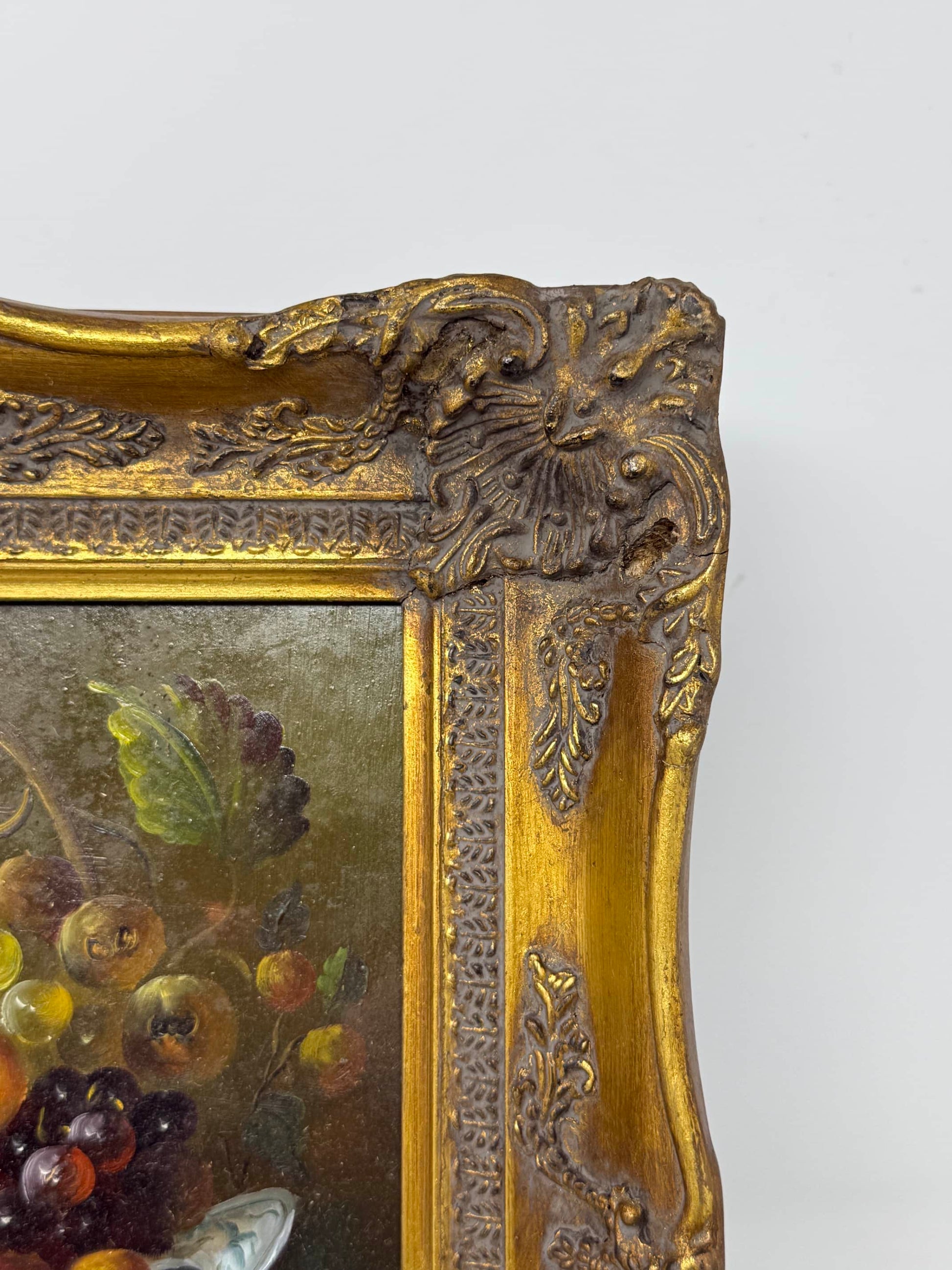 The artwork measures approximately 8 x 10 inches, and with its ornate gold frame, the full size reaches about 12 x 14 inches. A striking piece perfect for lovers of Baroque still life and richly styled interiors.