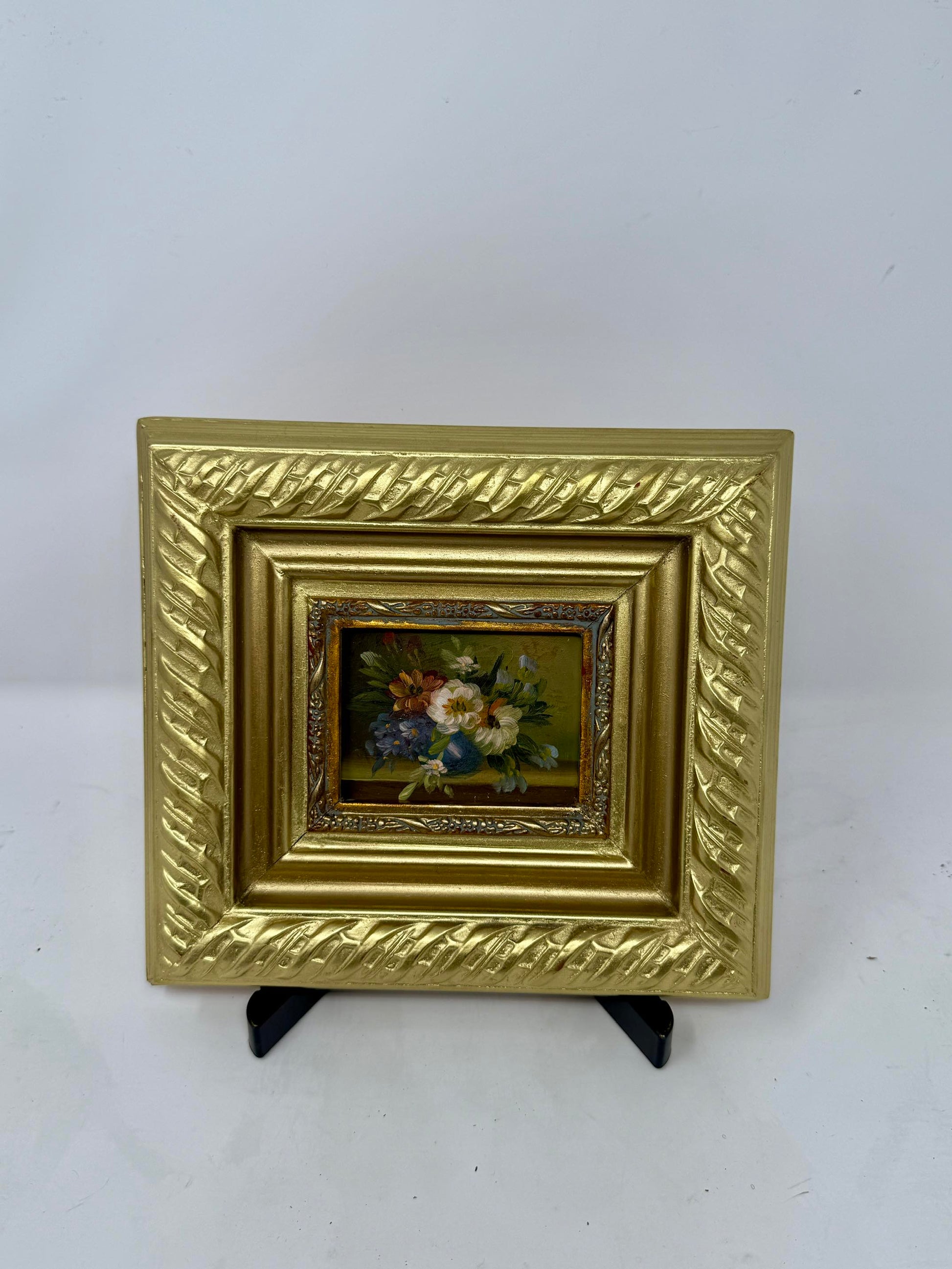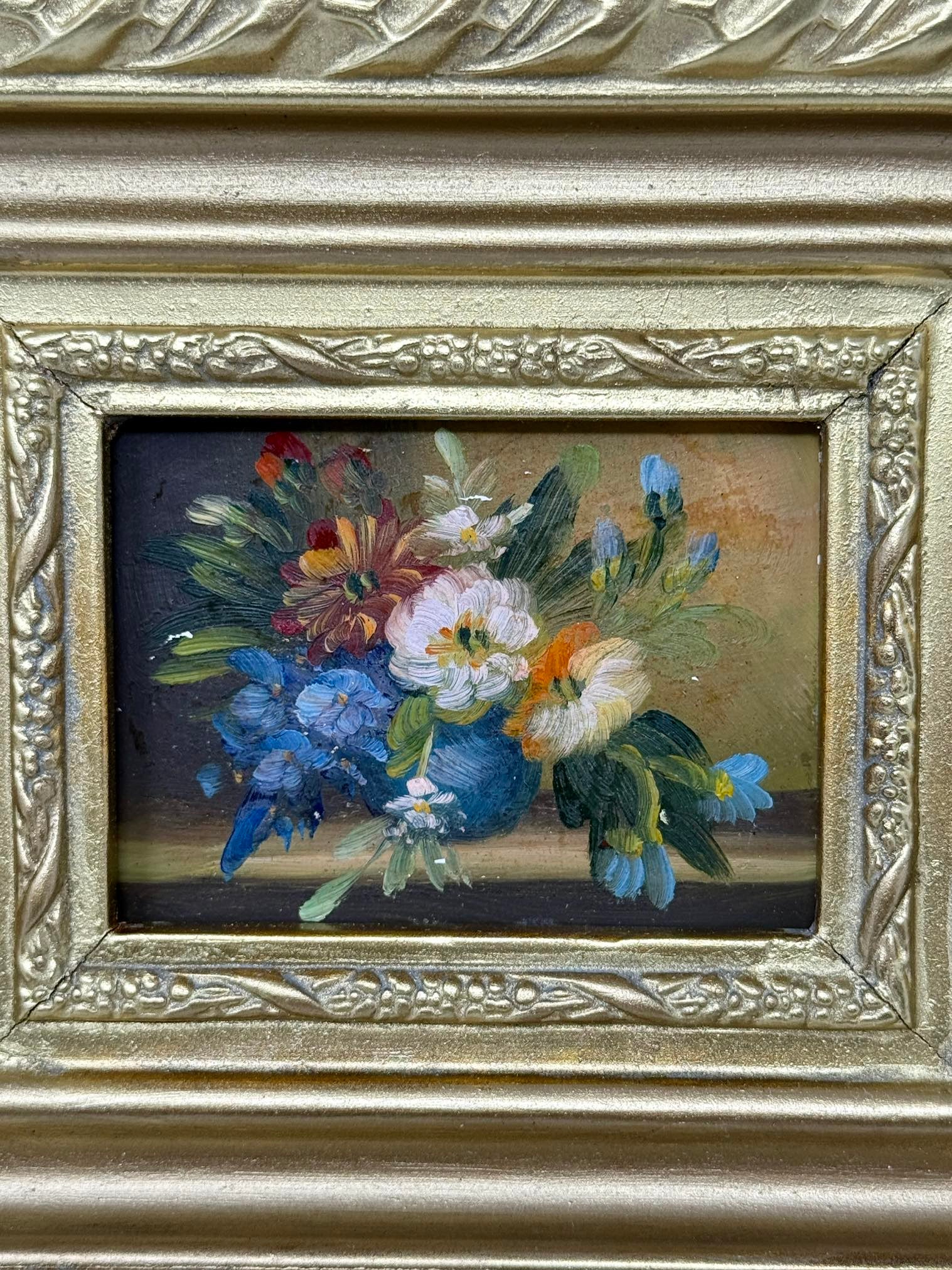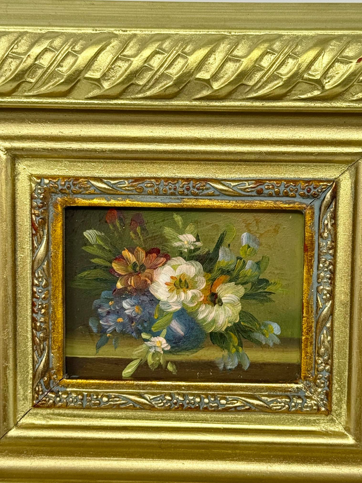 A beautifully balanced floral pair from the Heirloom Florals collection, each miniature painting showcases a lush bouquet arranged with soft whites, delicate blues, and warm autumn tones. The flowers rest against a golden-brown backdrop, giving these pieces a warm and timeless glow.
