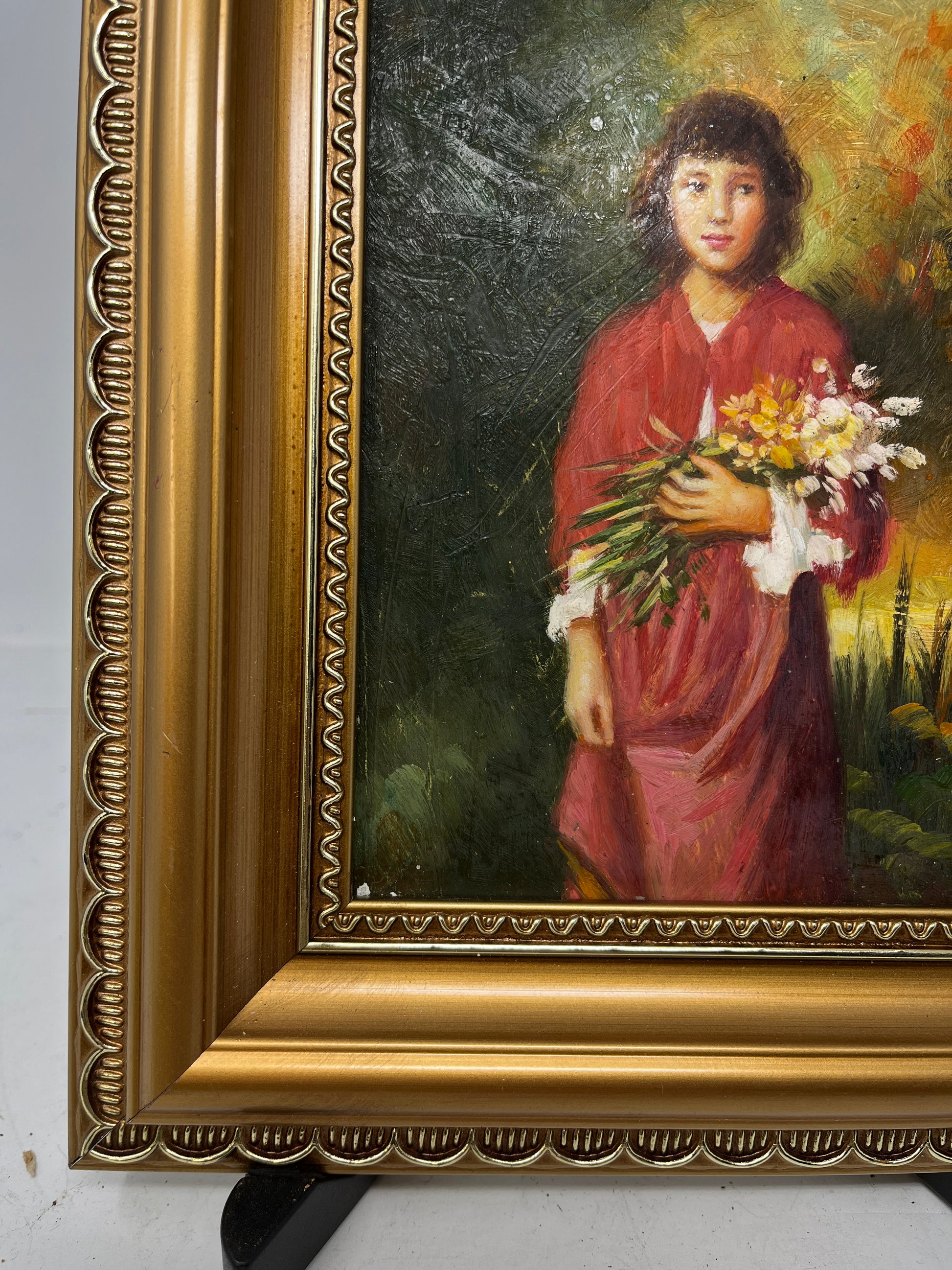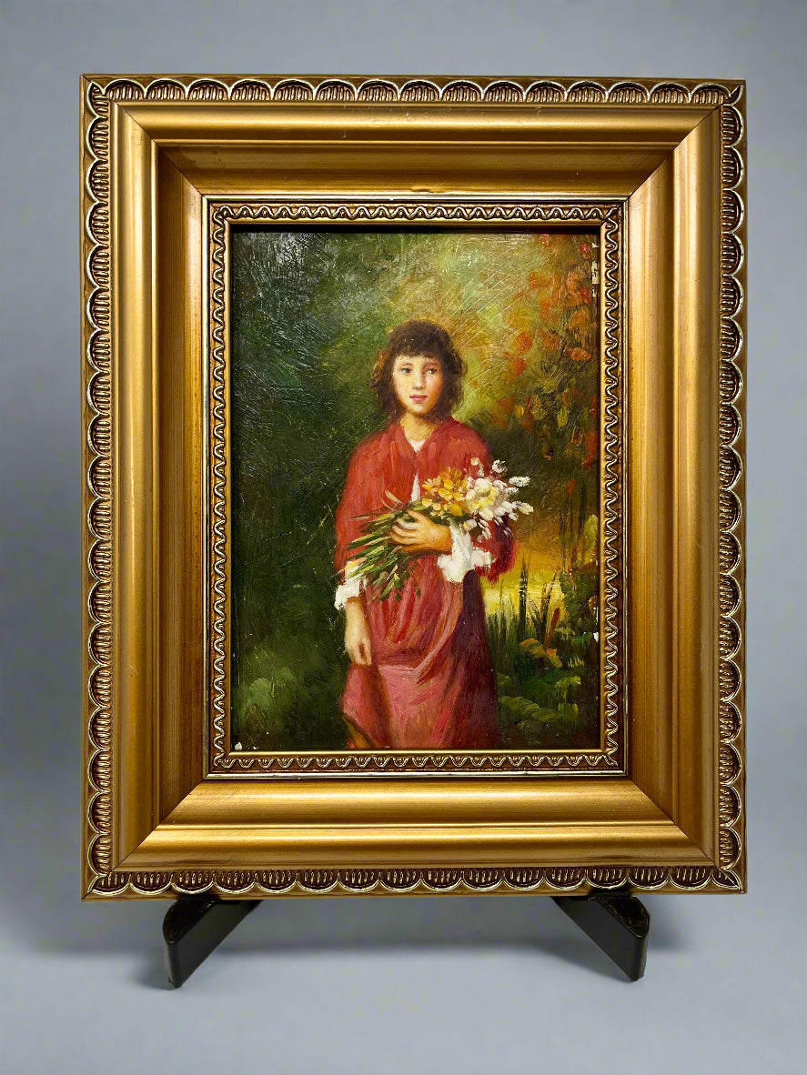 This exquisite oil painting portrays a young girl holding a delicate bouquet of wildflowers, set against a lush, vibrant background. The artwork, measuring 5x7 inches, is beautifully complemented by an ornate gold frame, bringing the total dimensions to 10x12 inches. The tender expression of the subject and the rich, warm tones evoke a sense of innocence and serenity, making this piece a captivating addition to any art collection or home decor.