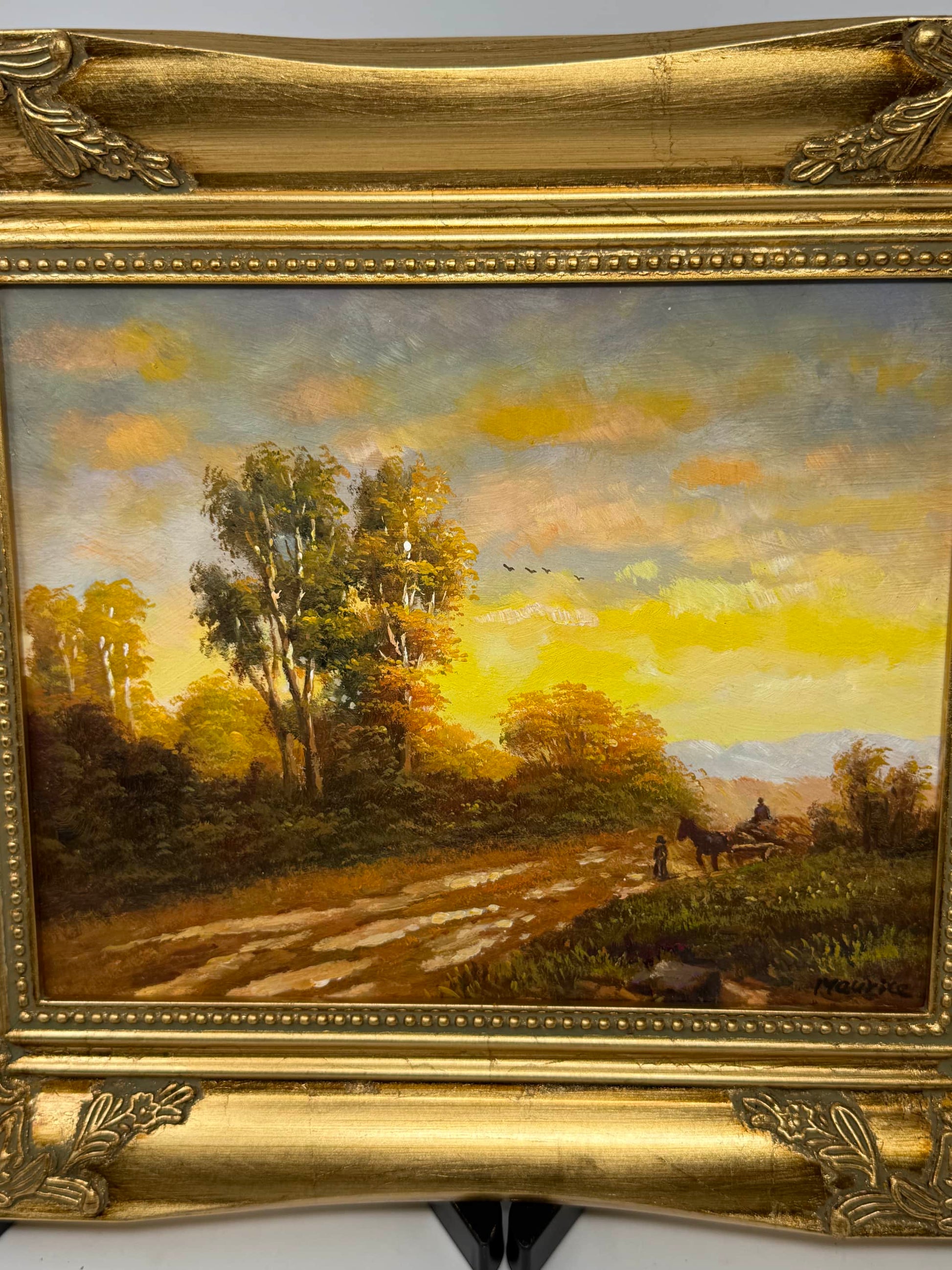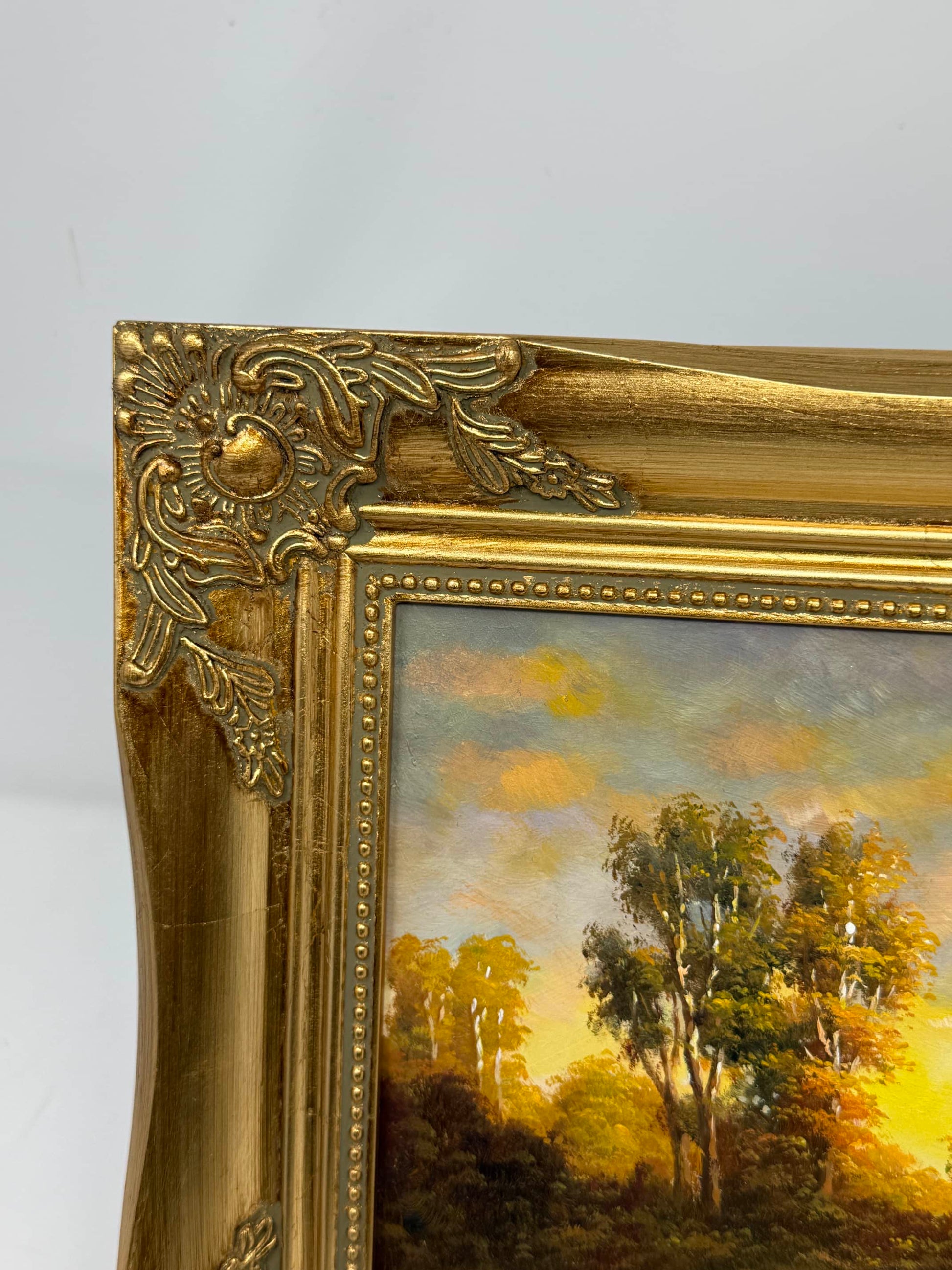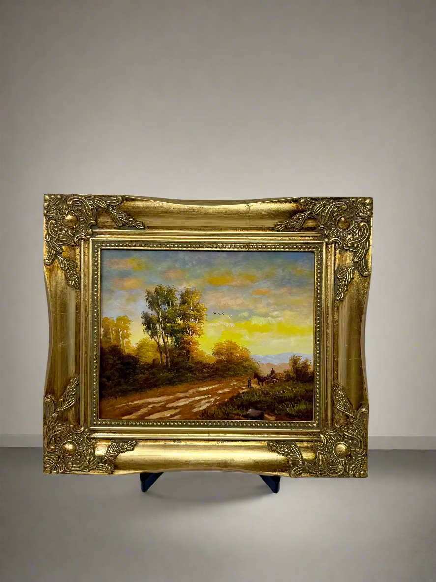 A radiant countryside sunset floods the sky with golden light, illuminating tall trees and a winding dirt path. A lone figure with a horse-drawn cart makes their way homeward, evoking peace, nostalgia, and timeless simplicity. The warm palette and glowing atmosphere transform this pastoral moment into a luminous keepsake. Housed in an ornate gilt frame with beaded inner molding, elegant and ready to hang.