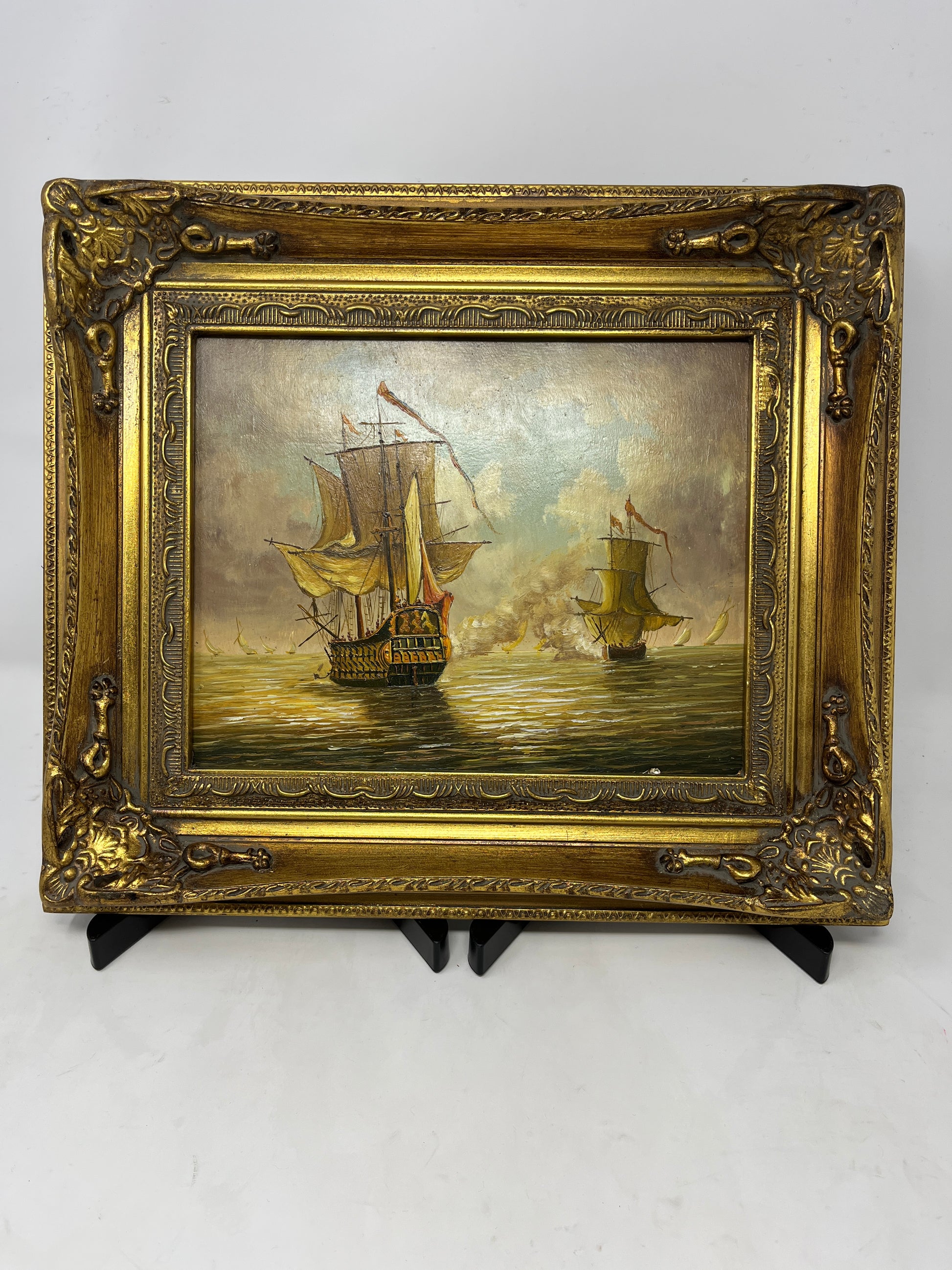 An evocative maritime scene capturing the grandeur of 18th-century sailing vessels as they cut across a mist-veiled sea. The rich detailing of the rigging and the burnished gold of the ornate frame add gravitas, transforming this 8x10 oil into a commanding statement piece. With its 13x15 inch frame, the artwork conveys both movement and majesty, ideal for collectors drawn to nautical history and timeless seafaring romance.