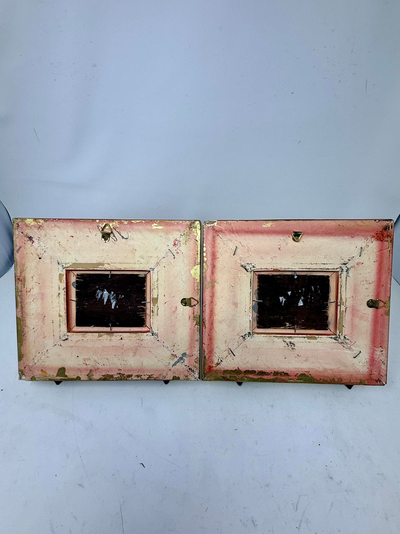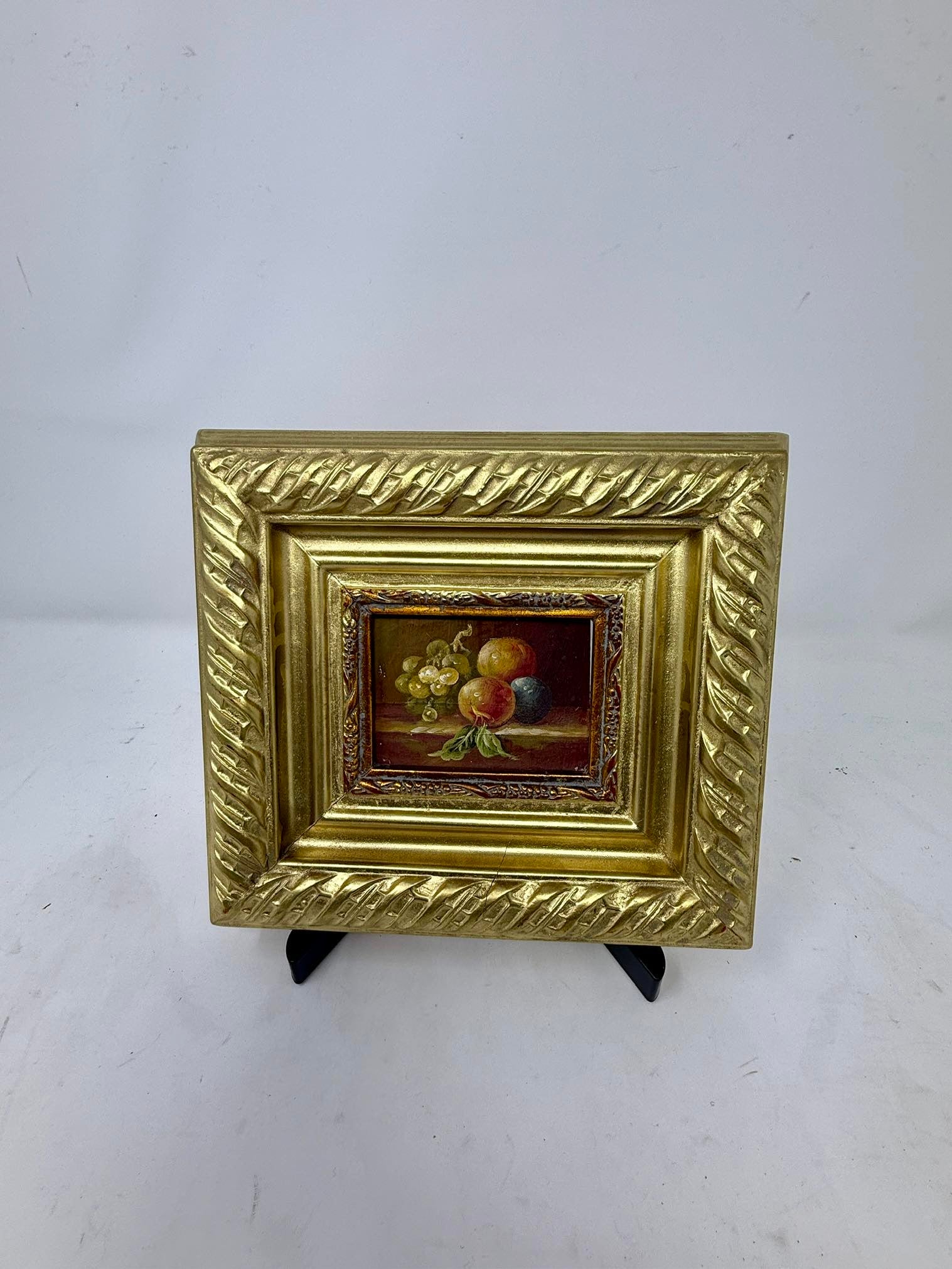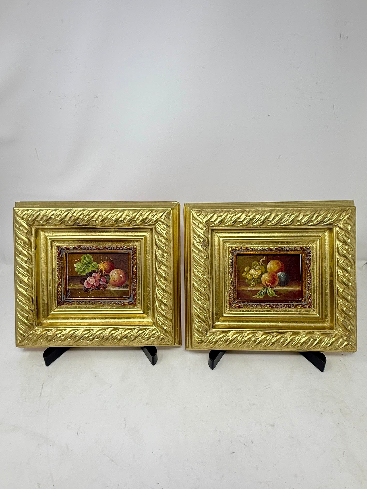A distinguished pair from the Heirloom Still Life series, each miniature study captures ripe orchard fruit resting against a warm, rustic backdrop. Deep plums, tender grapes, and blushing peaches glow inside richly carved gold frames, creating a timeless harmony between color and craftsmanship.