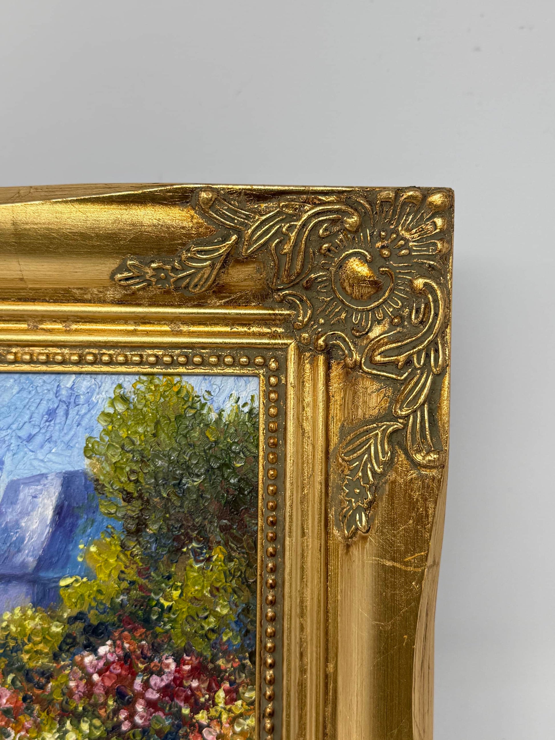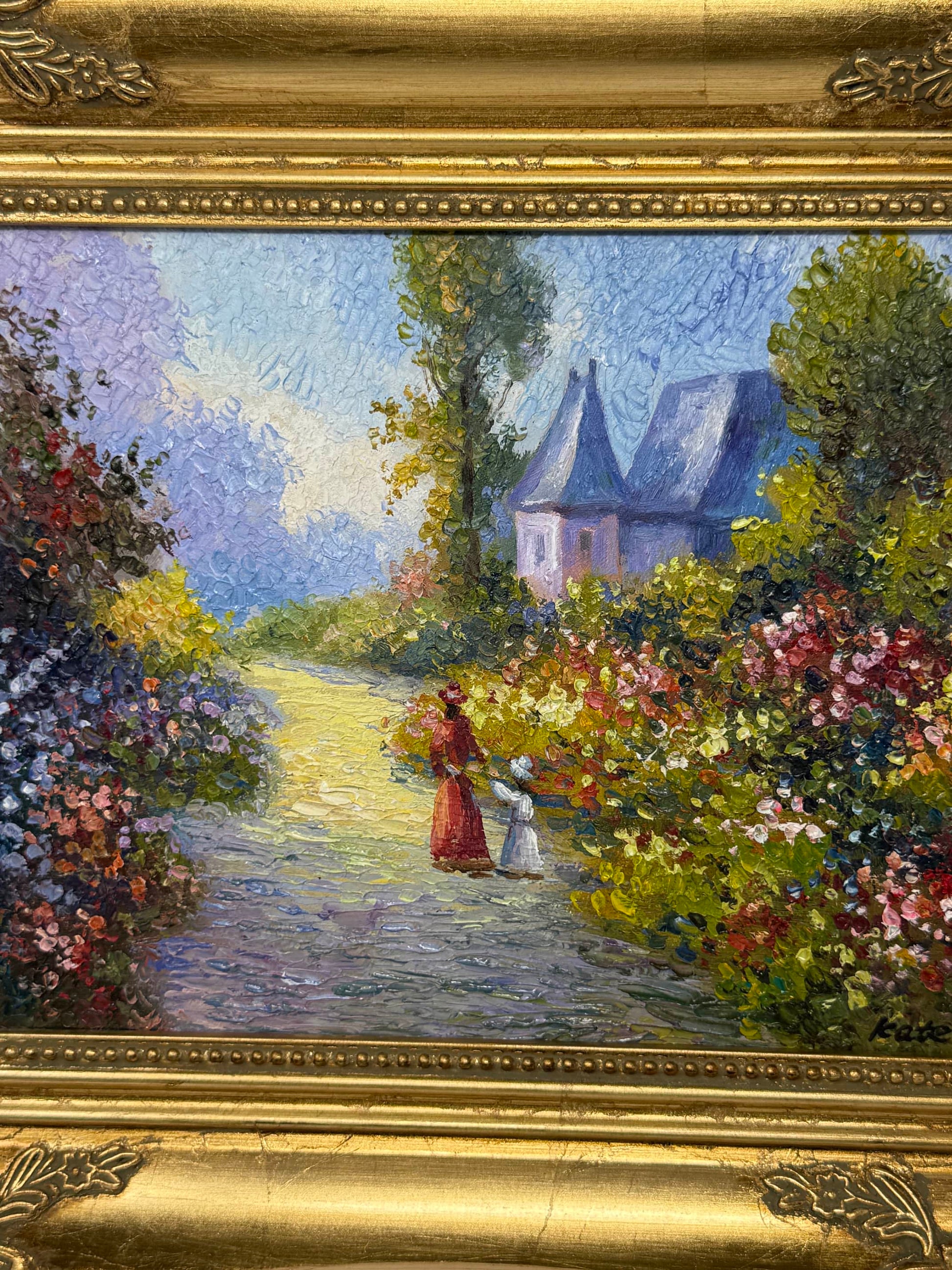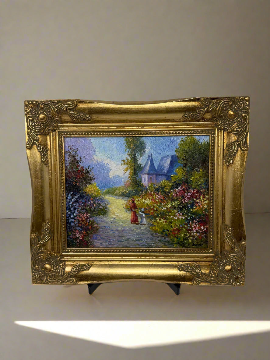 This 8x10 inch oil painting (13x15 inches with frame) captures a quiet moment suspended in soft light. A woman and a child walk side by side along a garden path, surrounded by wildflowers that seem to bloom just for them. The house in the distance, with its gentle blue roof, feels less like a destination and more like a memory—familiar, but not urgent. Every brushstroke carries warmth, from the reds in the woman’s dress to the violet shadows beneath the trees.