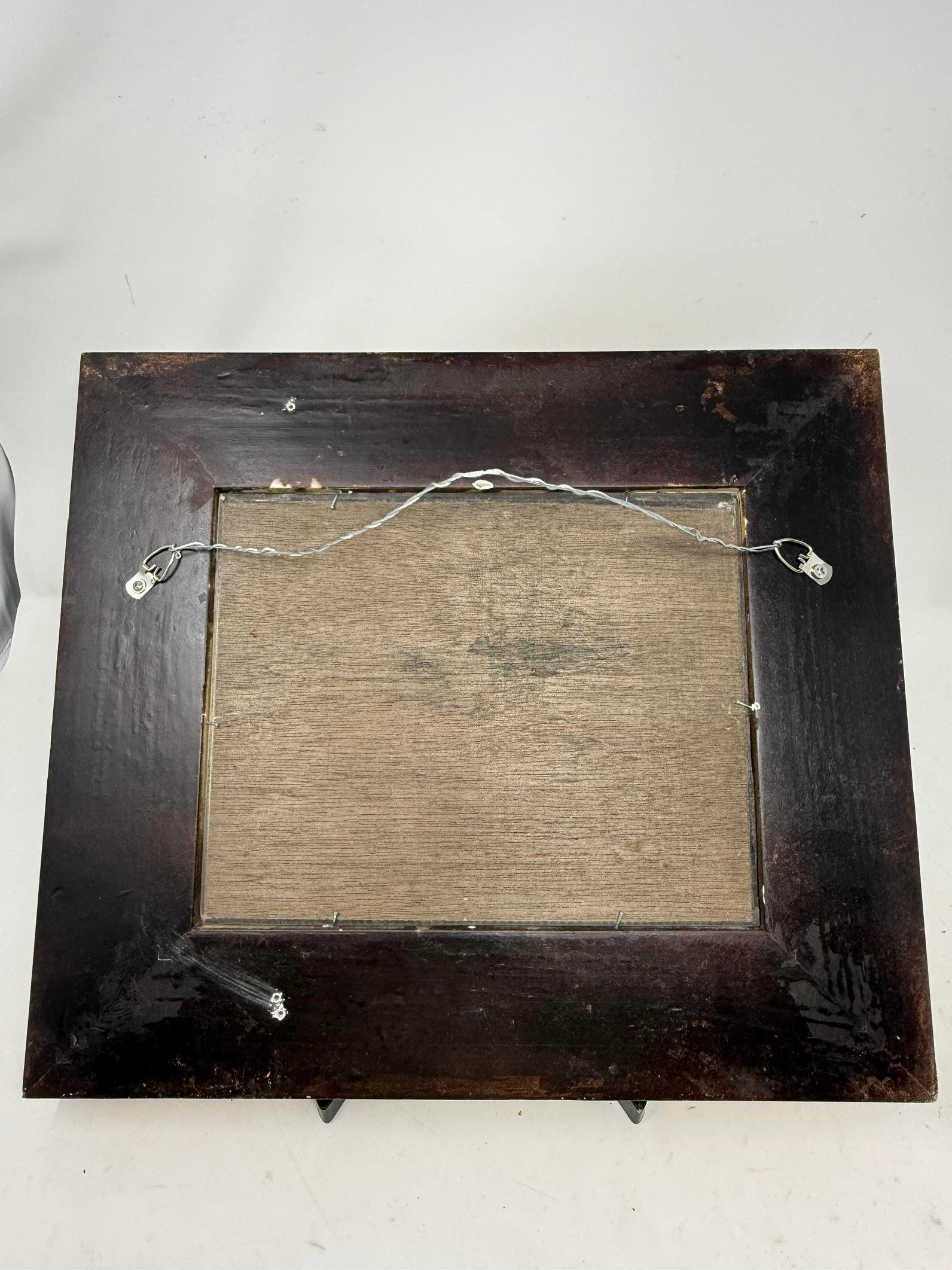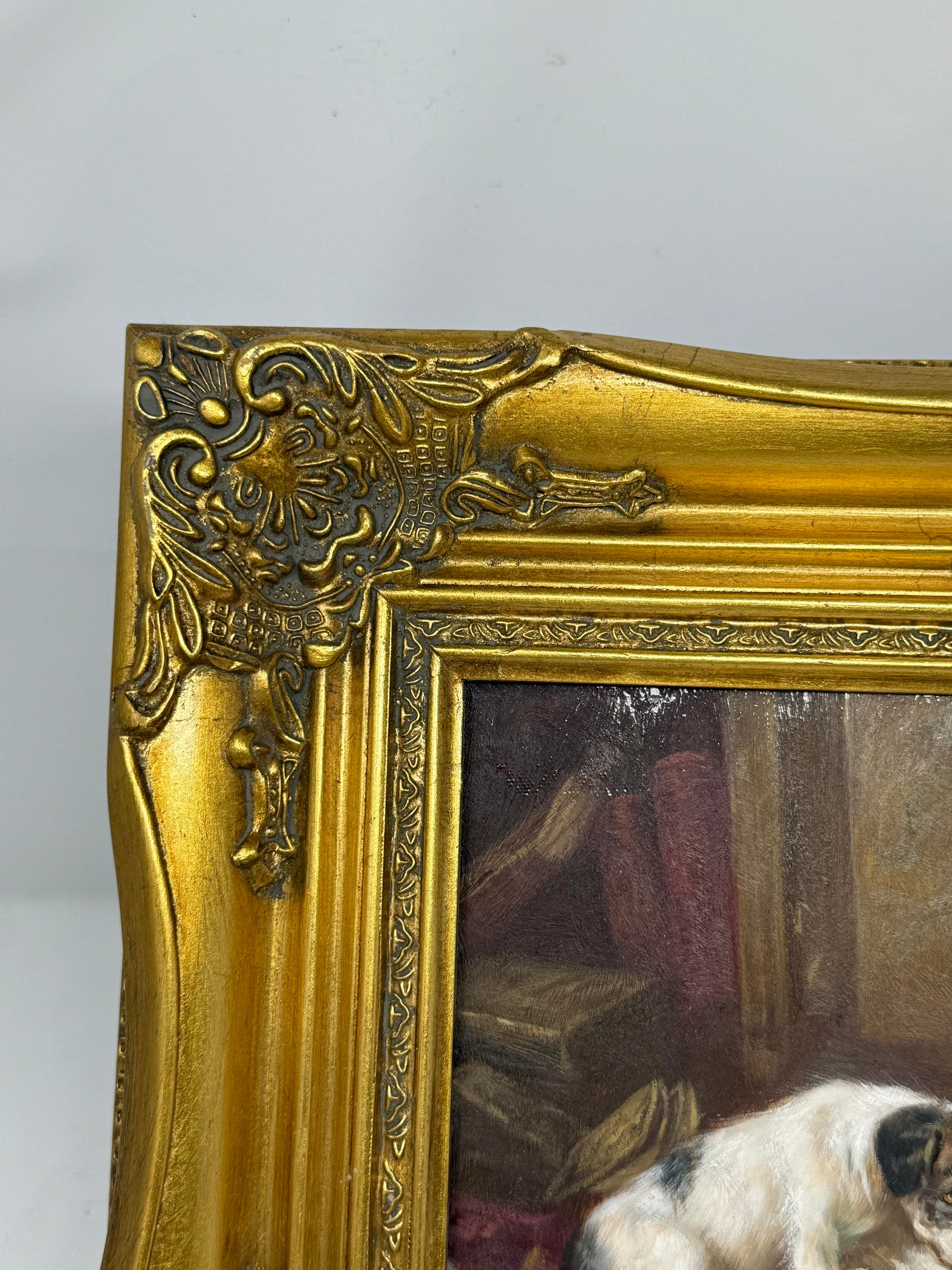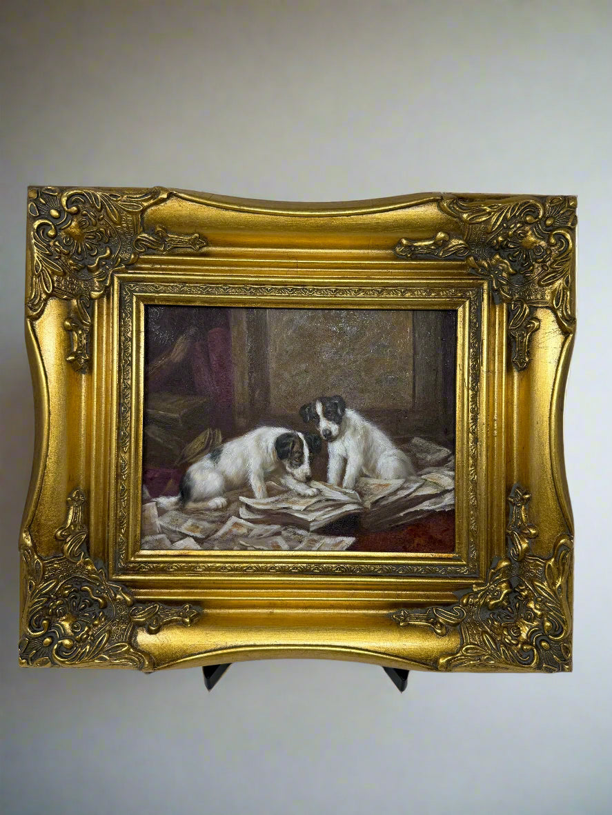 This vintage oil painting (Art: 8 x 10 in, Frame: 13 x 15 in) captures two playful puppies caught in a curious moment, tumbling over scattered pages. Their bright eyes and soft coats are rendered with exquisite detail, bringing warmth and movement to the scene. The ornate gold frame, with its scrolling baroque flourishes, adds grandeur and complements the lively subject matter. A whimsical and timeless piece, perfect for collectors of canine art or as a statement accent in any home.