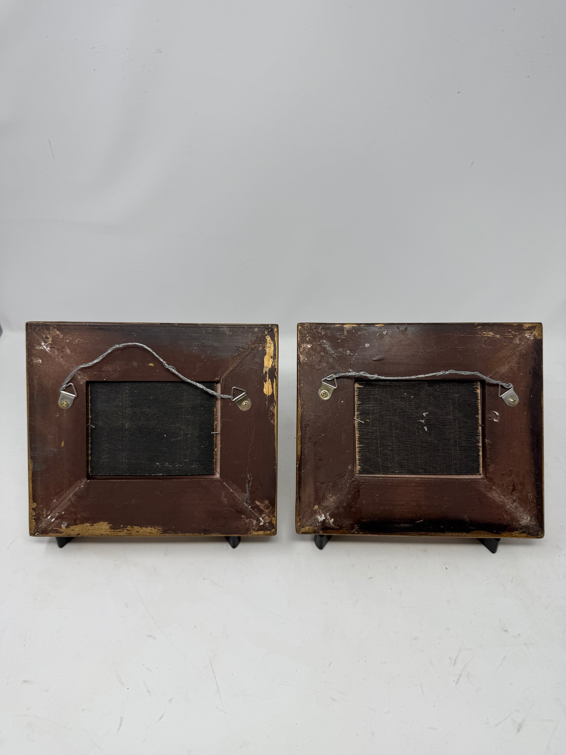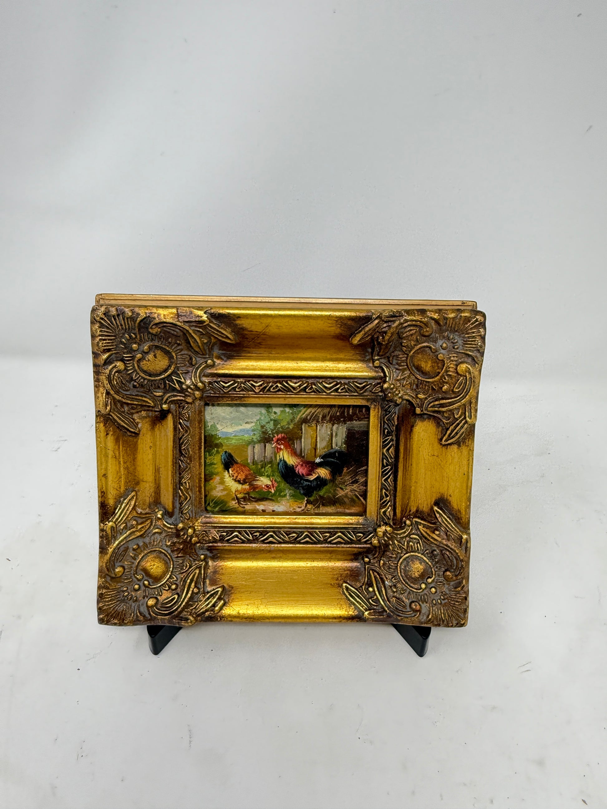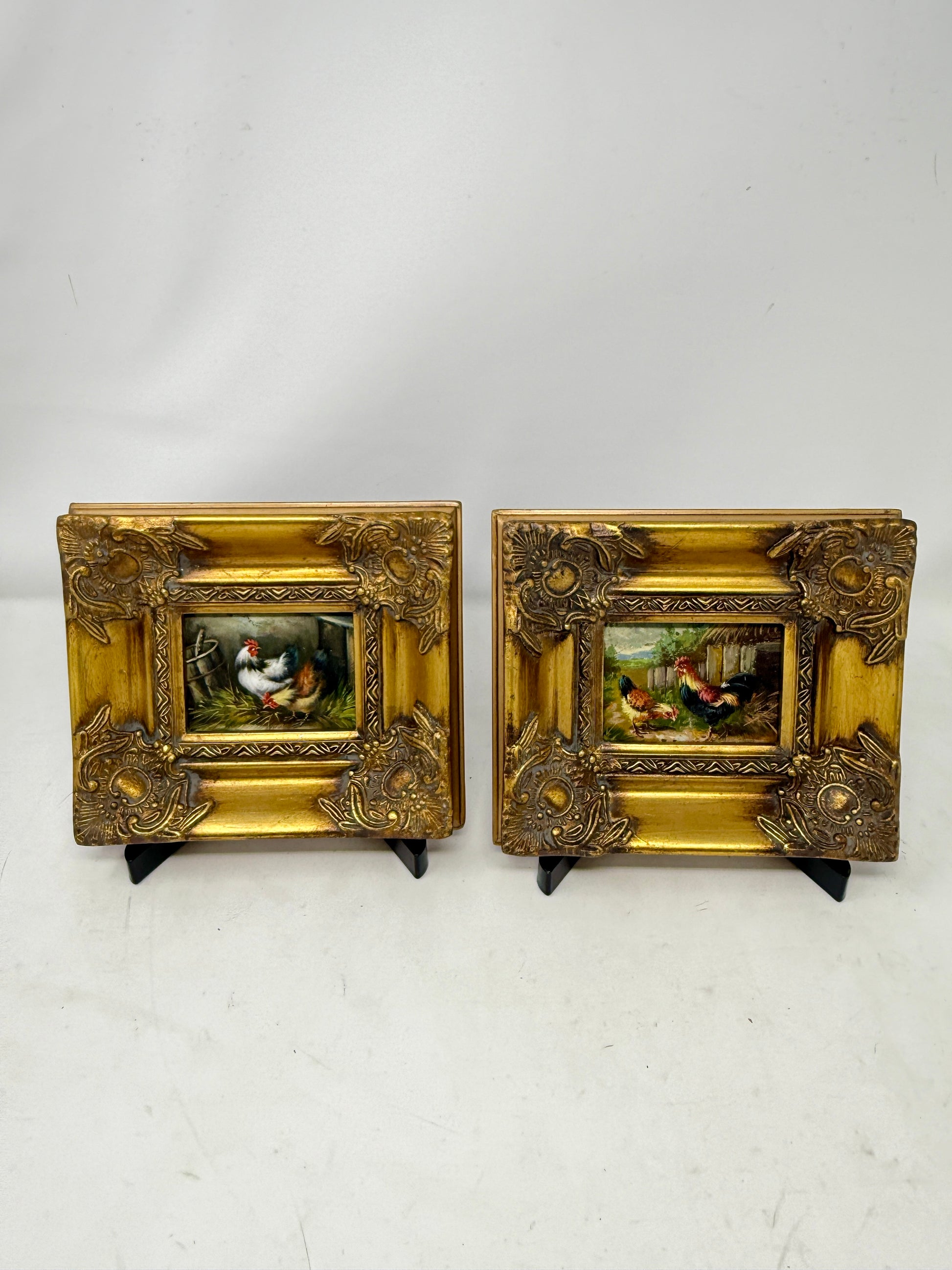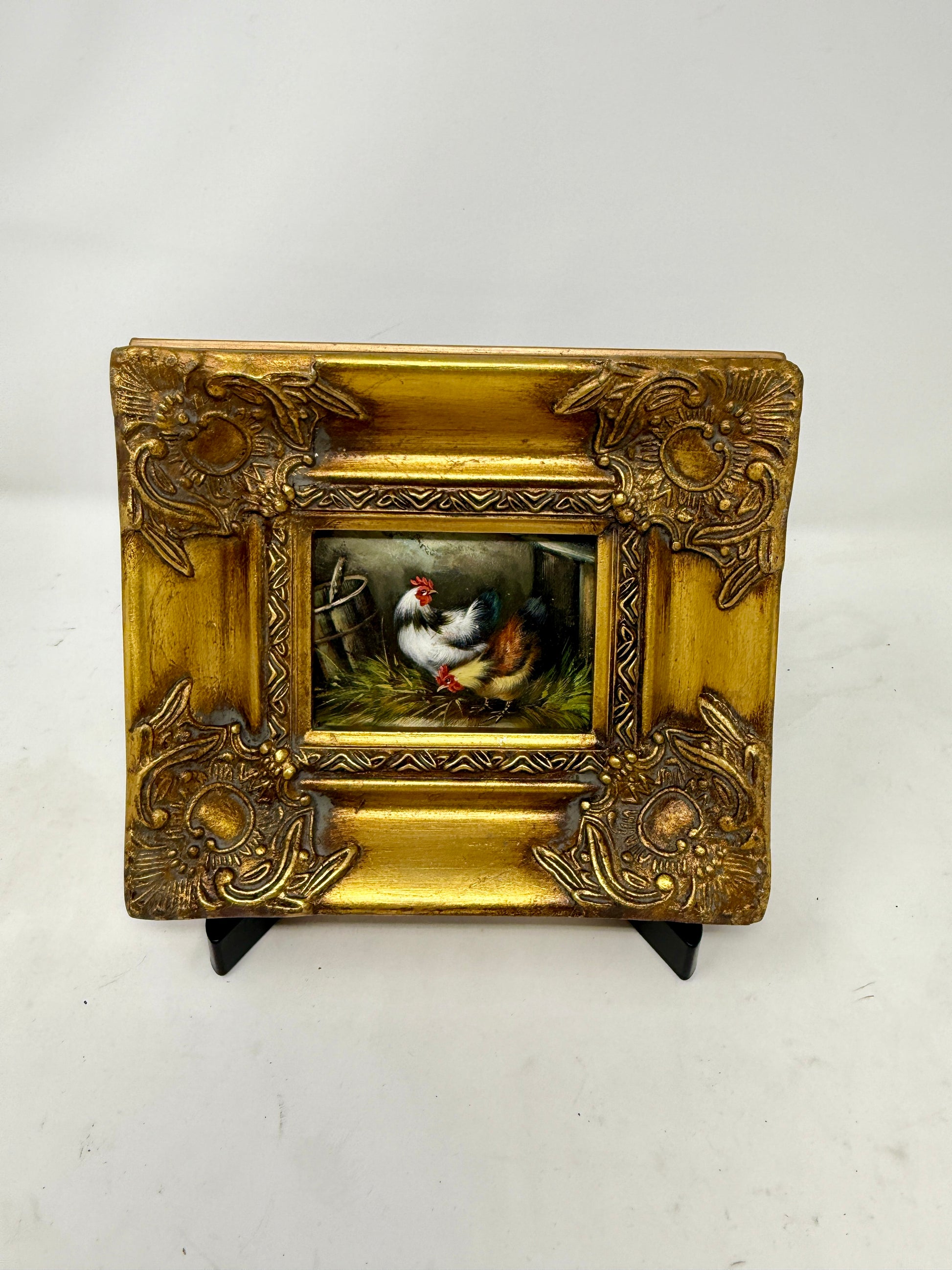 A delightful pair of miniature oil paintings capturing the rustic charm of countryside life. Each scene portrays proud roosters and gentle hens nestled among straw and wooden coops, painted with fine detail and warm, pastoral tones. The ornate gilt frames enhance their nostalgic elegance, making this duo a perfect addition to any farmhouse or vintage-inspired gallery wall.