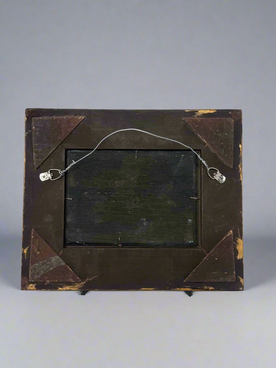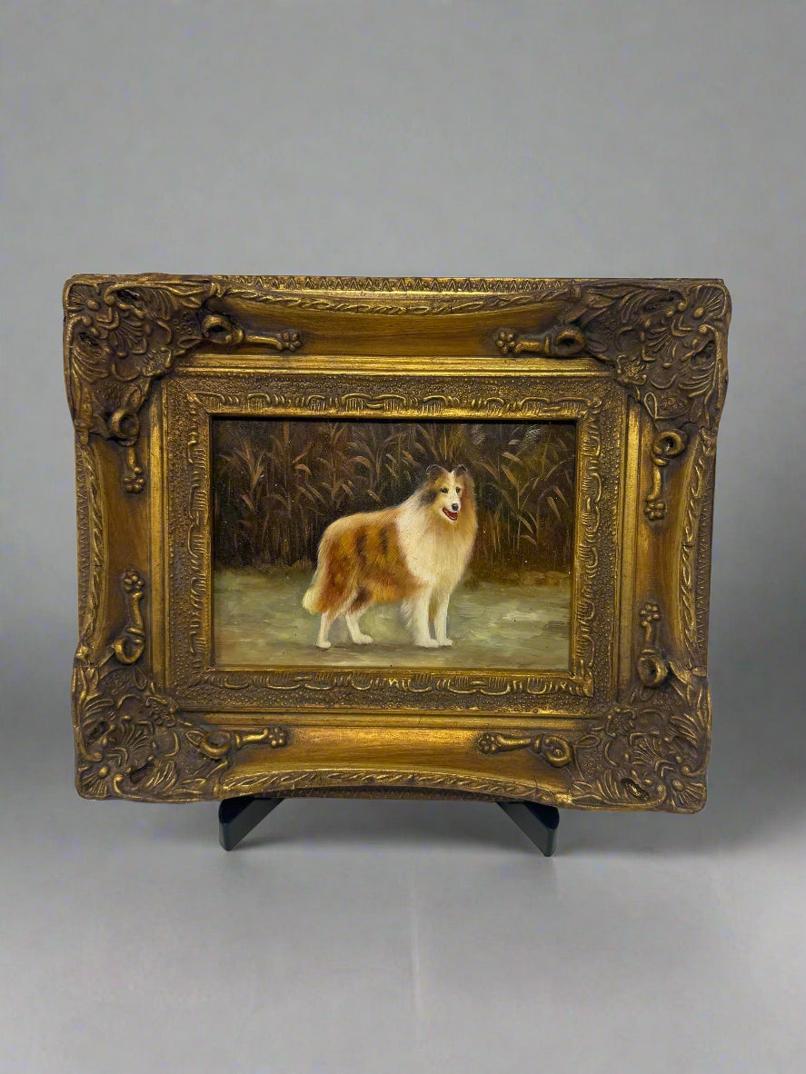 A poised Rough Collie stands guard along a quiet country path, its rich sable and white coat rendered in soft, confident brushstrokes. Behind it, a thicket of tall grasses fades into shadow, offering contrast to the dog’s luminous presence. Though the painting itself measures just 5x7 inches, it radiates a sense of calm loyalty and pastoral grace. Housed in an ornate gilt frame measuring 9x11 inches, this piece transforms into a timeless keepsake—elegant, nostalgic, and full of heart.