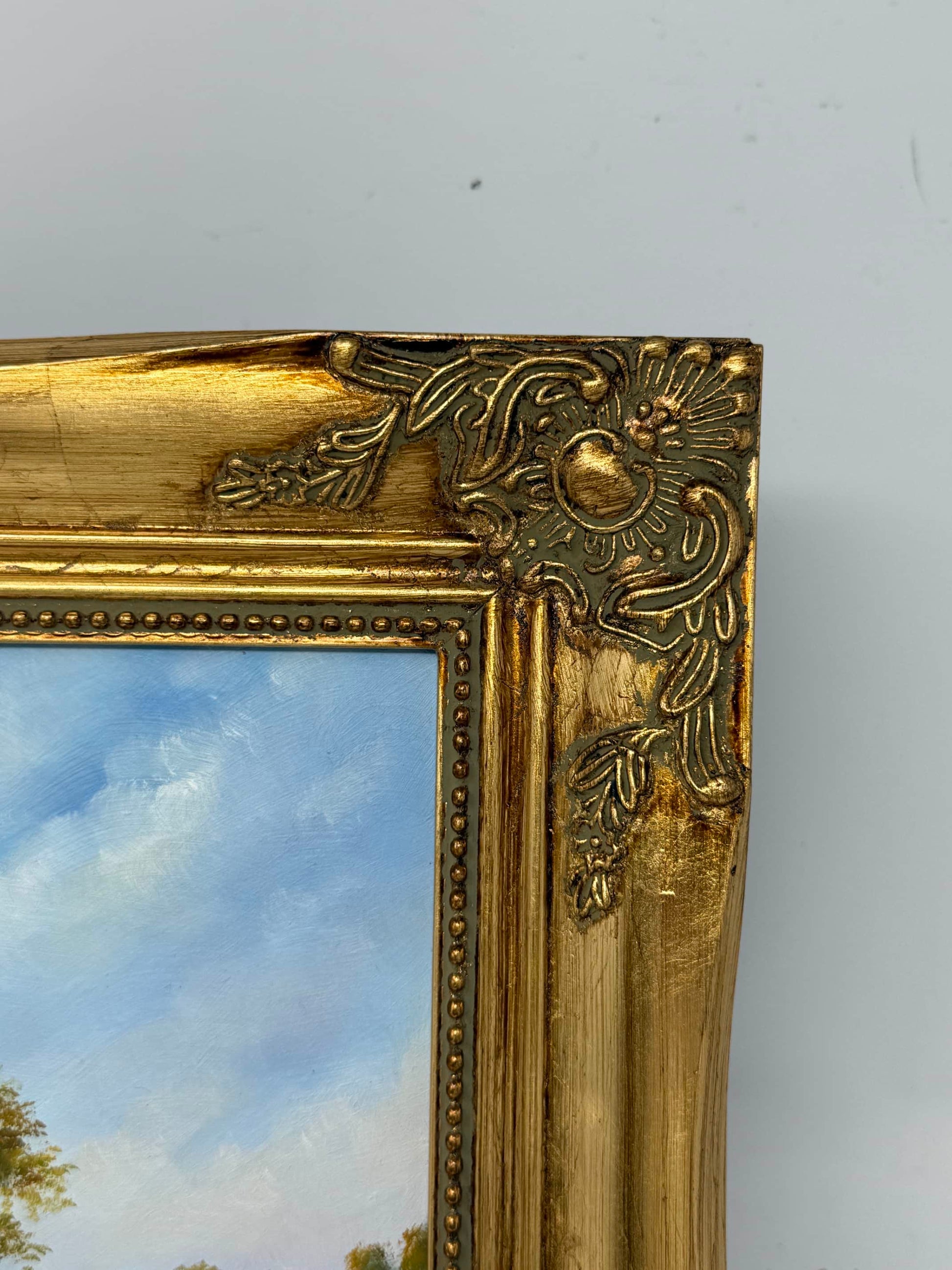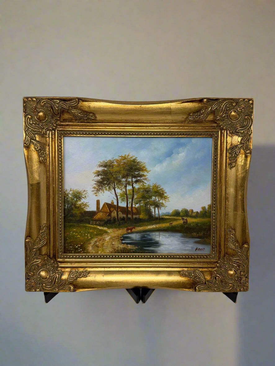 Bathed in golden morning light, this peaceful pastoral scene features a small herd of cows grazing near a quiet pond, with a charming cottage tucked behind a grove of trees. Wispy clouds drift acro