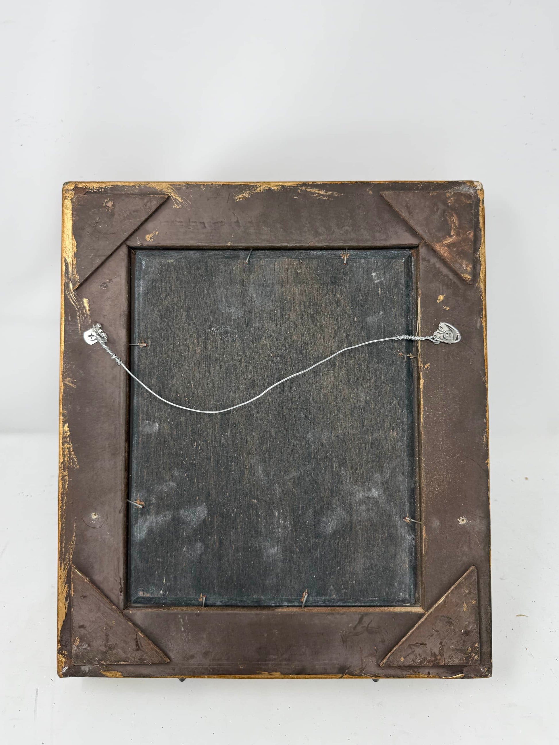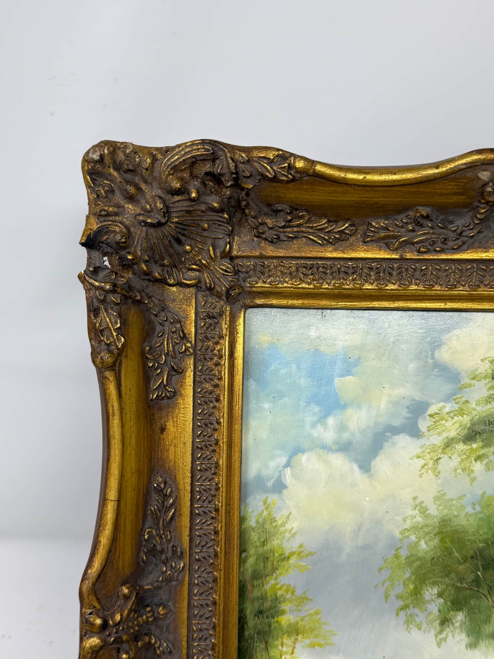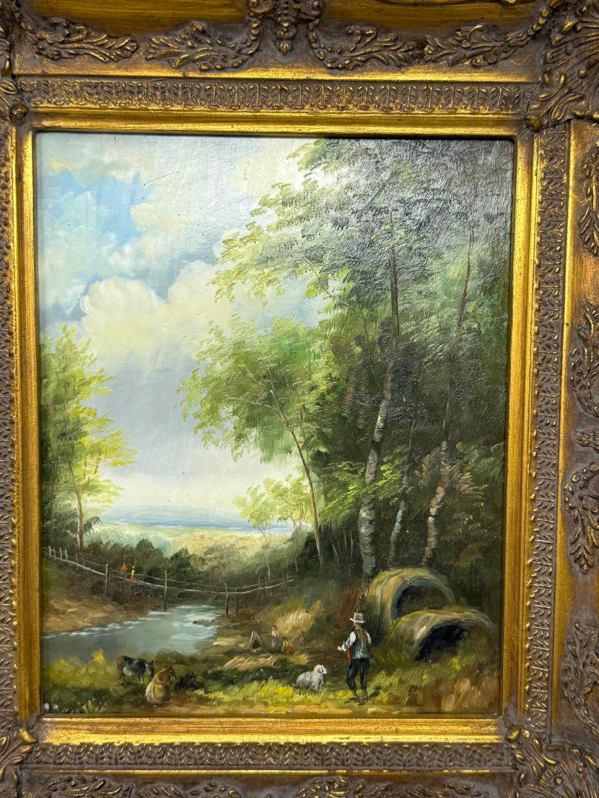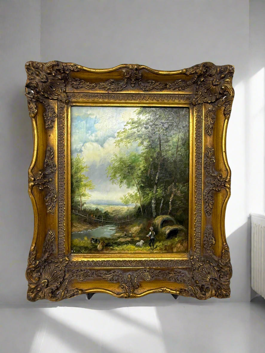 A winding stream cuts through the forest clearing, where a gentleman strolls alongside his dog near the mossy openings of fallen trees. The light dances gently across the foliage, hinting at early afternoon, while a distant horizon peeks through the canopy. This 8x10 inch painting captures a moment of calm exploration—where man and nature meet not in grandeur, but in quiet company. Framed in an ornate 12x14 inch gilt frame, the piece is both nostalgic and alive with subtle detail.