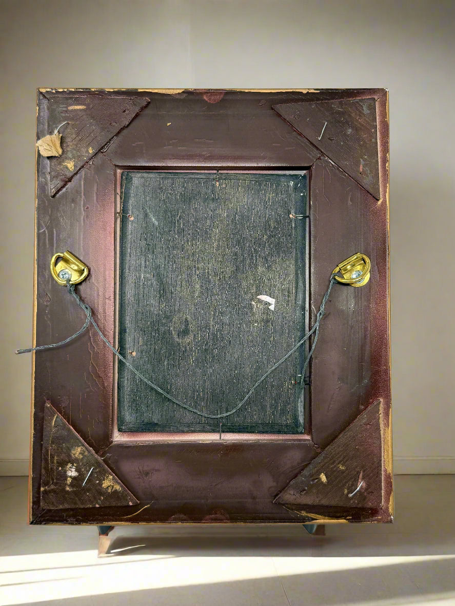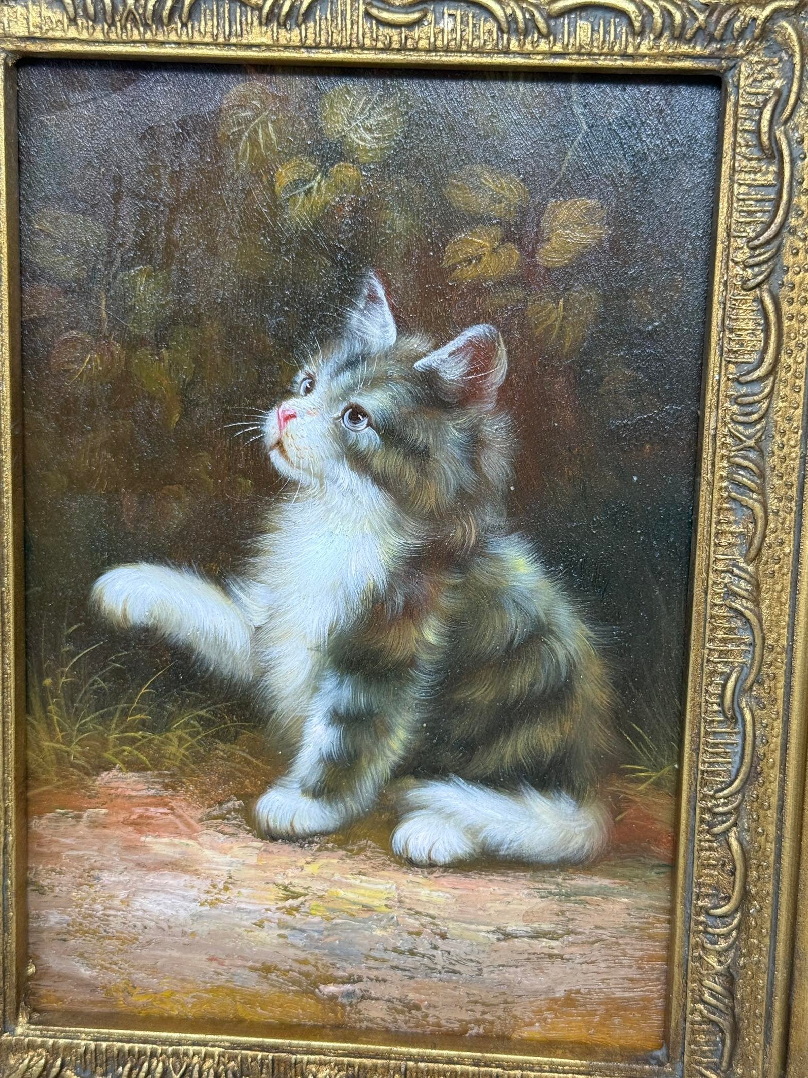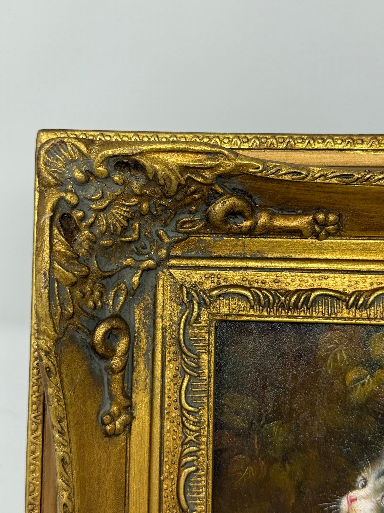 A charming vintage oil painting (Art: 5 x 7 in, Frame: 9 x 11 in) capturing a playful kitten mid-motion, paw lifted as if reaching for something just beyond sight. The artist’s brushwork brings out the softness of its fur and the gentle curiosity in its gaze. Surrounded by an ornate gold frame with sculptural flourishes, this piece embodies timeless Victorian charm and the innocence of feline wonder. Perfect for collectors of animal portraiture or as a warm accent in any home.