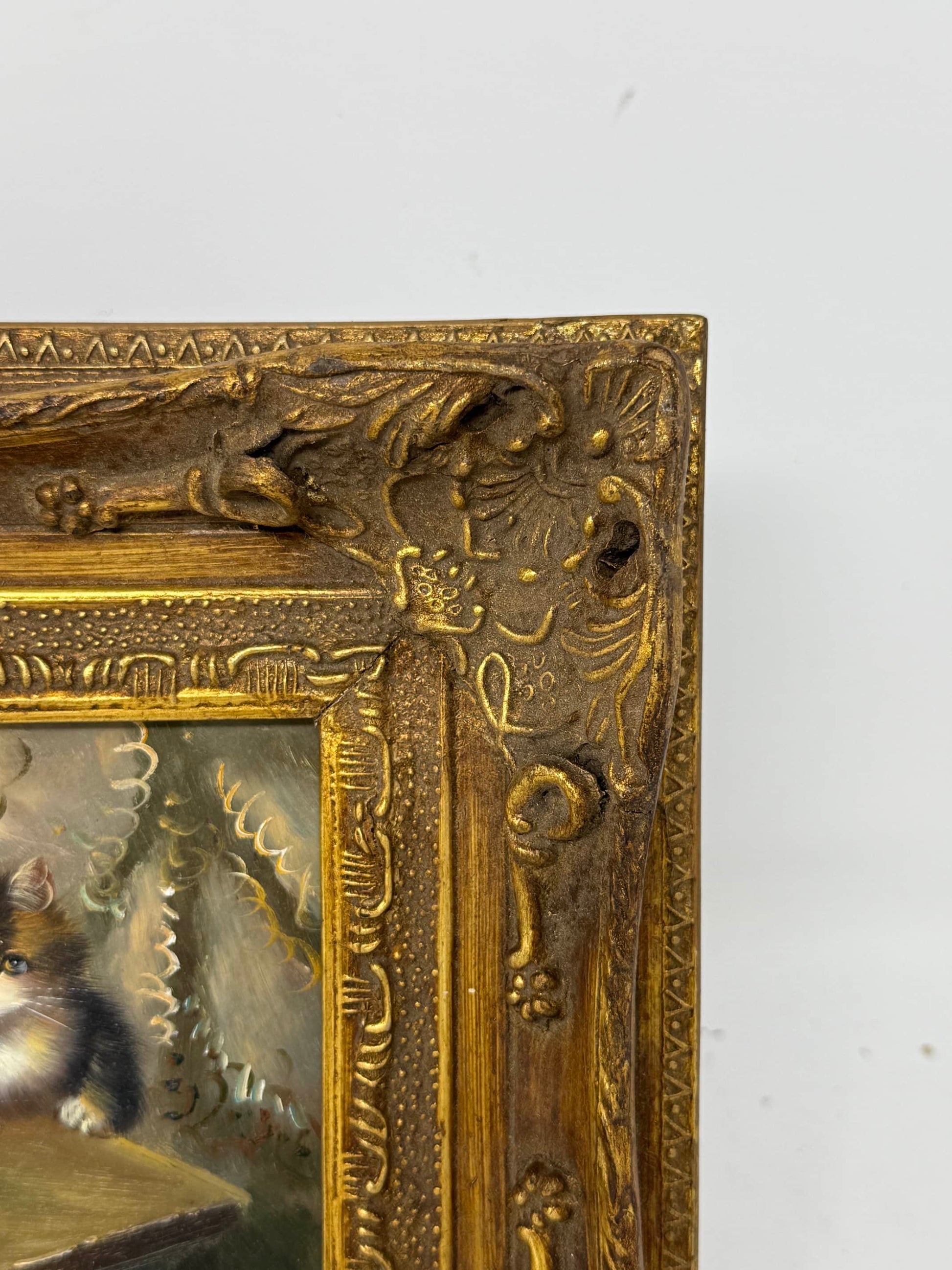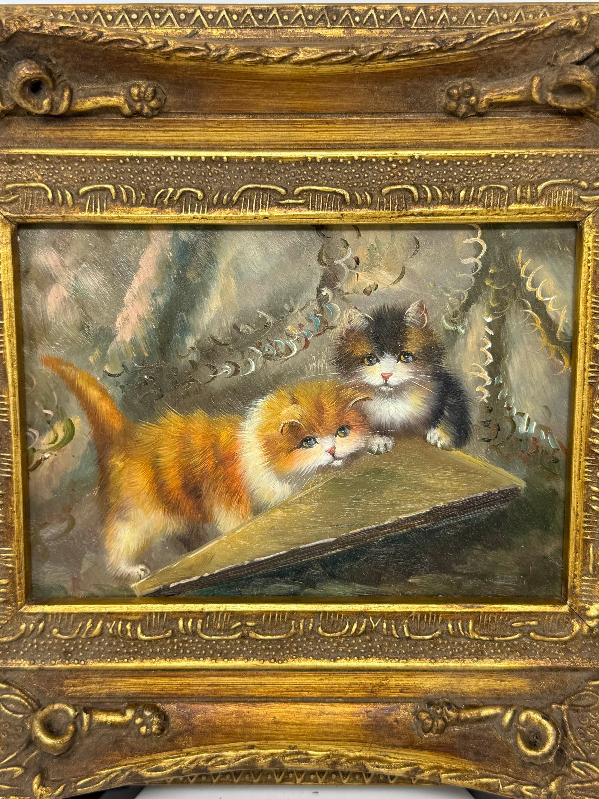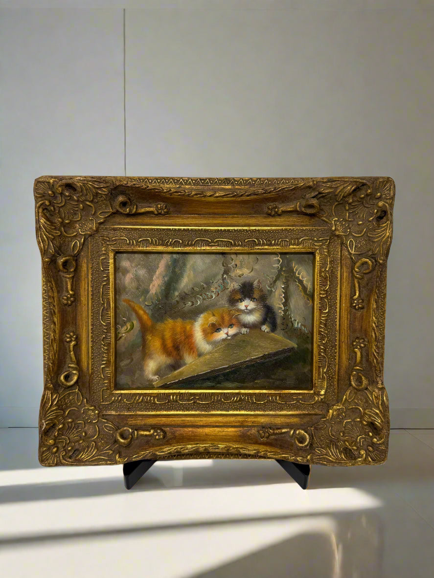 Two wide-eyed kittens peer out from behind a velvet-draped table, their tiny paws gripping the edge as if they’re about to tumble into your world. The ginger fluff and smoky fur capture a moment of innocent mischief, forever paused in this charming antique oil painting. At just 5x7 inches, the artwork’s intimate scale draws you in, while its 9x11 inch ornate gold frame adds a regal touch, turning this sweet scene into a timeless heirloom. Whether displayed alone or as part of a feline-themed gallery wall, it brings warmth, nostalgia, and a gentle smile to the heart.