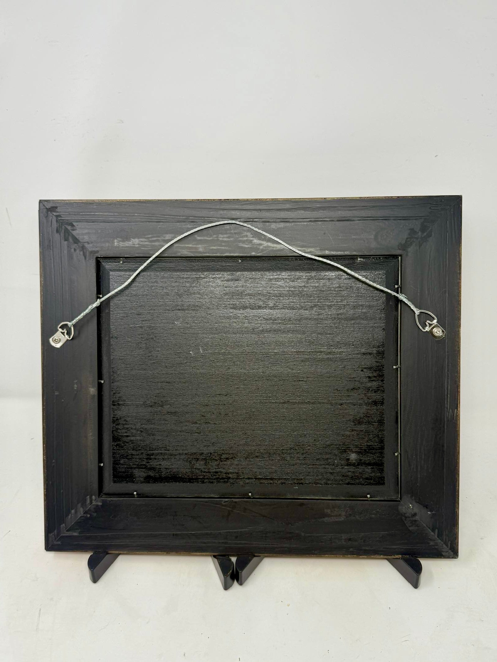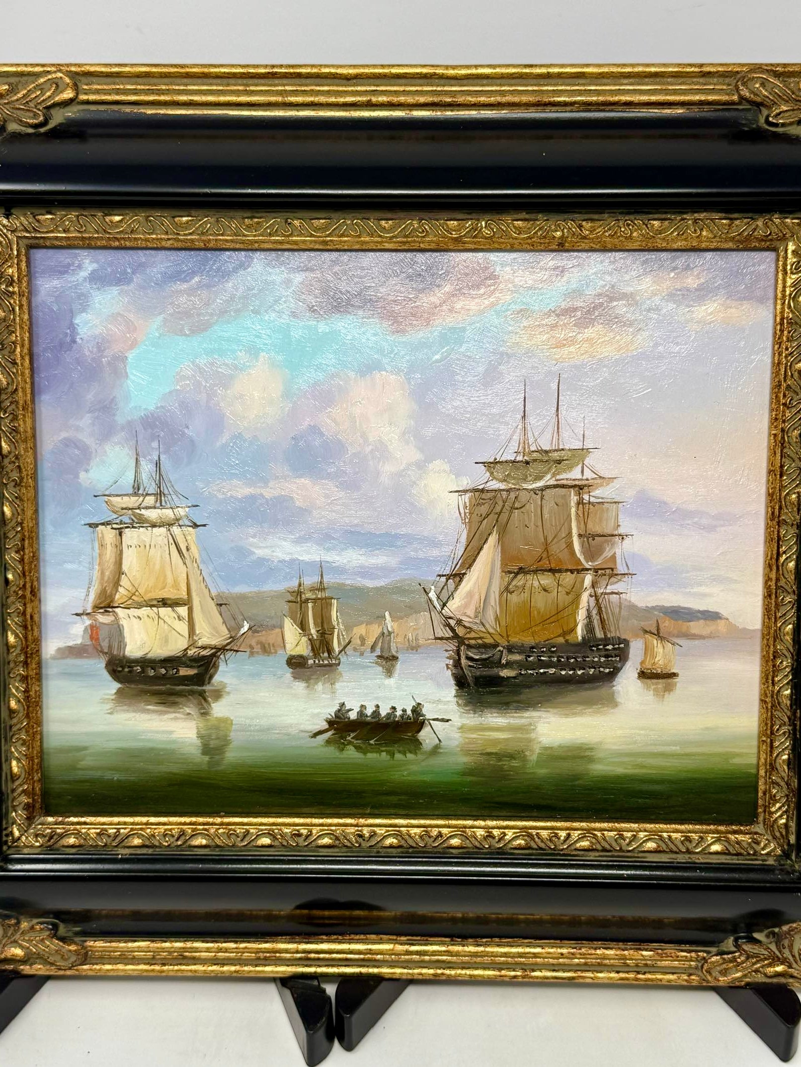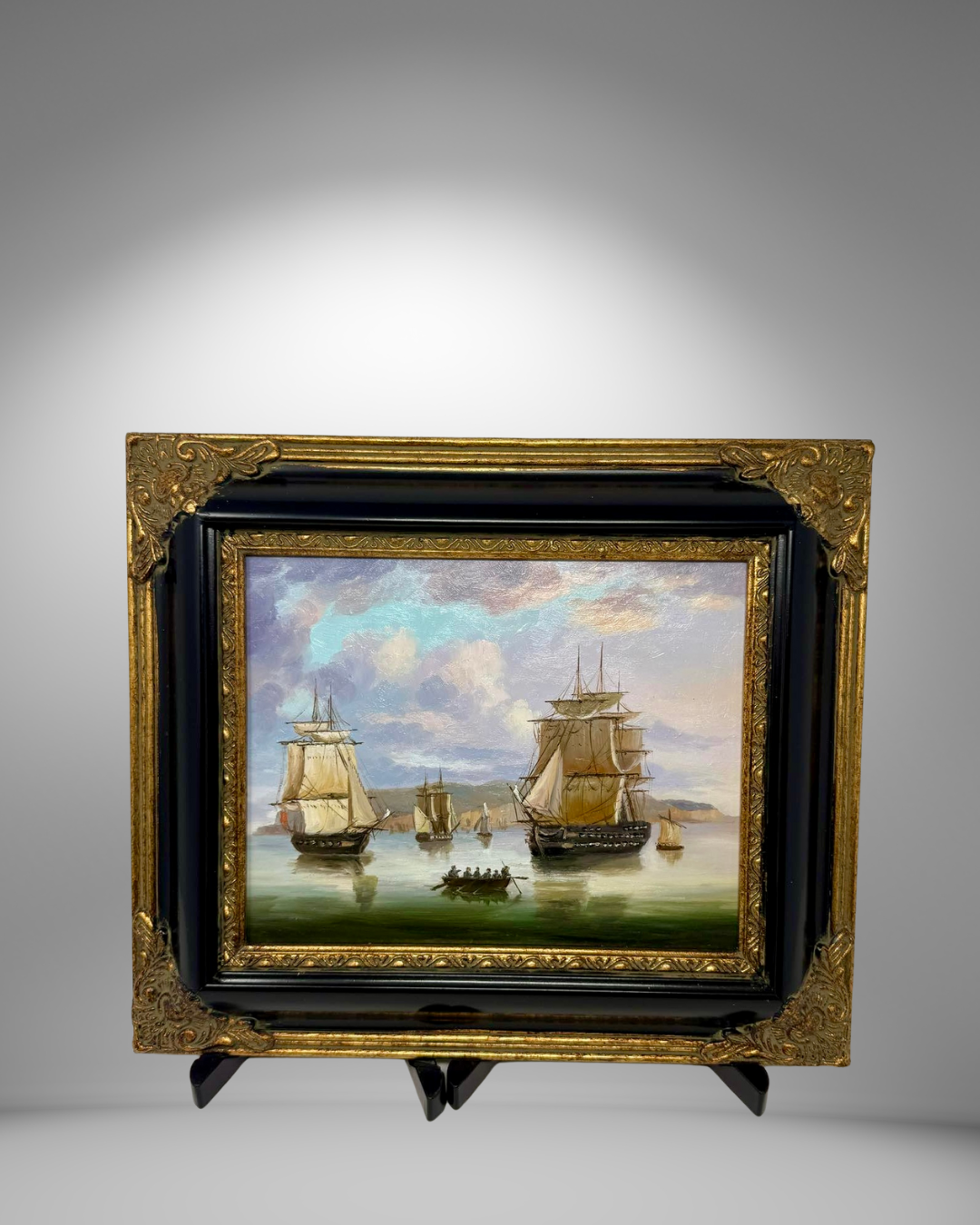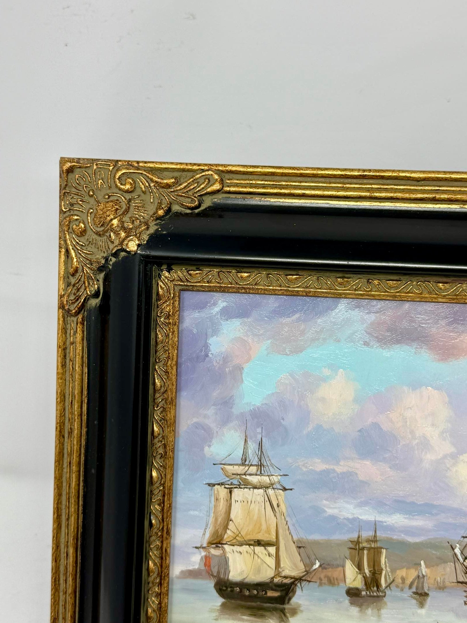 The warm tones of the ships contrast beautifully with the cool blues and greens of the sea, while the ornate black and gold frame adds a sense of classic refinement. This piece brings timeless maritime charm and understated elegance to any curated interior.