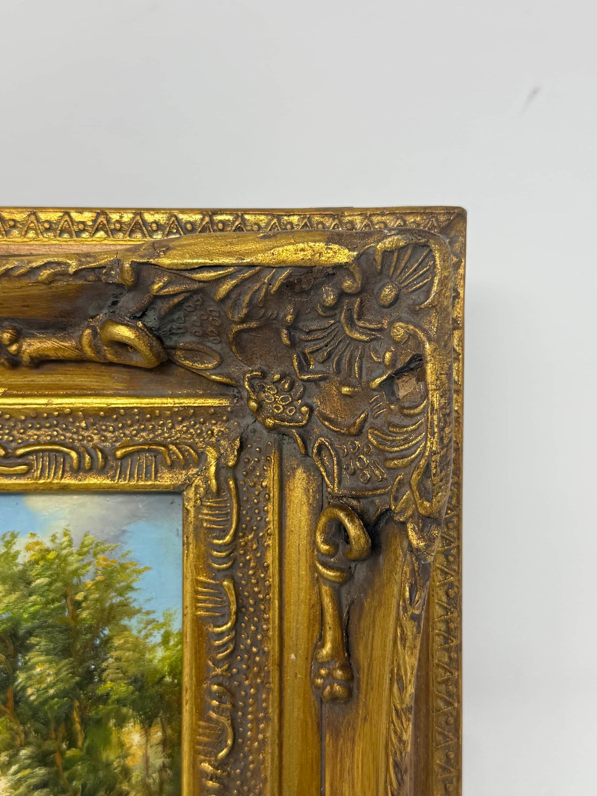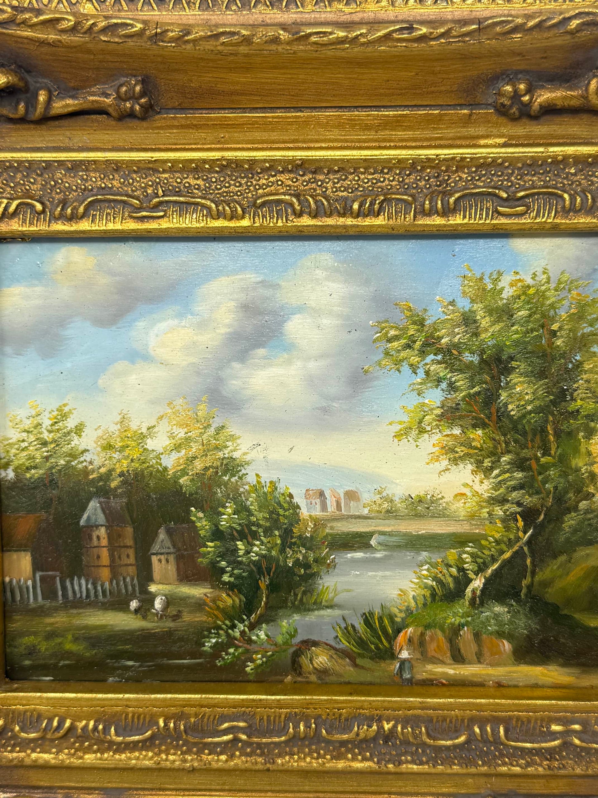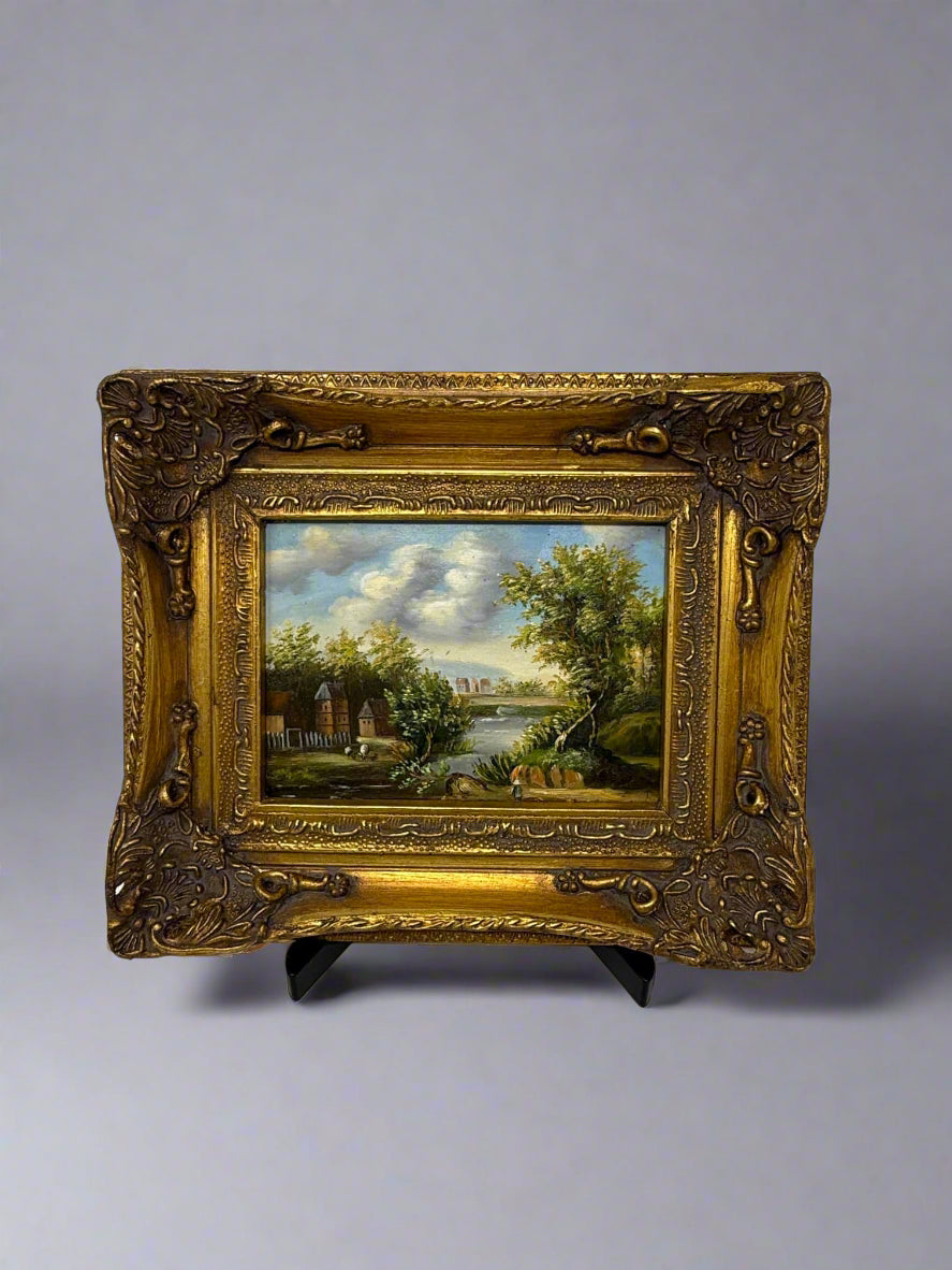 Nestled beneath drifting clouds and flanked by trees in full summer hush, this tranquil 5x7 inch village scene invites you into a world where time meanders like the river below. A soft breeze seems to stir the branches, while a quiet bridge spans the water like a whispered promise. Framed in a 9x11 inch antique-style gilt frame, it recalls a gentler pace of life—one where even the clouds seem to pause and listen.