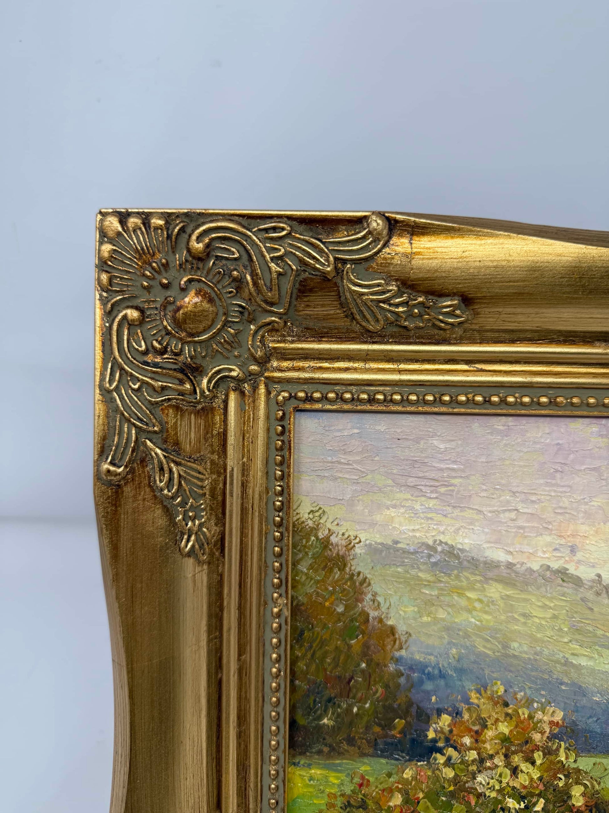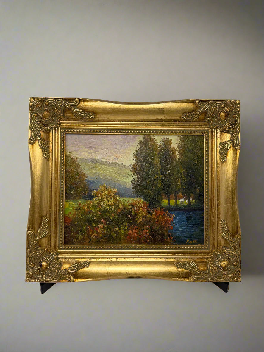 A burst of autumnal color cascades across this serene riverside landscape, where crimson shrubs and golden foliage glow beneath the soft light of a fading day. A gentle brook reflects the surrounding trees, guiding your gaze toward a distant sunlit cottage nestled beneath rolling hills. Each brushstroke carries the crisp breath of fall, inviting you to linger in this tranquil moment.
