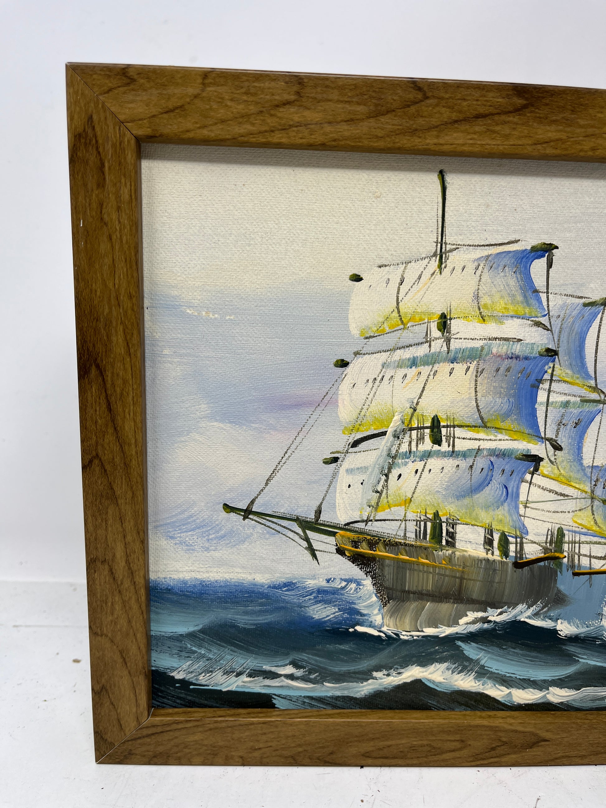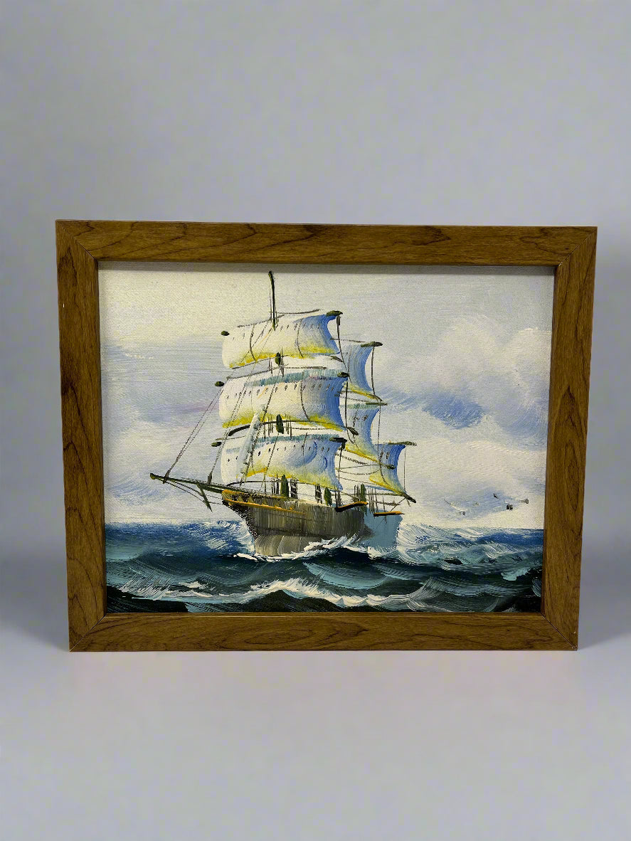 This 10x12-inch oil painting framed with natural wood frame, captures a majestic tall ship navigating the open sea with its white sails billowing in the wind. The artist's expressive brushstrokes bring movement to the churning waves and the soft, cloud-filled sky, evoking a sense of freedom and adventure. Hints of gold and blue highlight the details of the ship, enhancing the dynamic composition. Perfect for maritime enthusiasts and collectors, this painting brings the timeless beauty of seafaring voyages into any space.