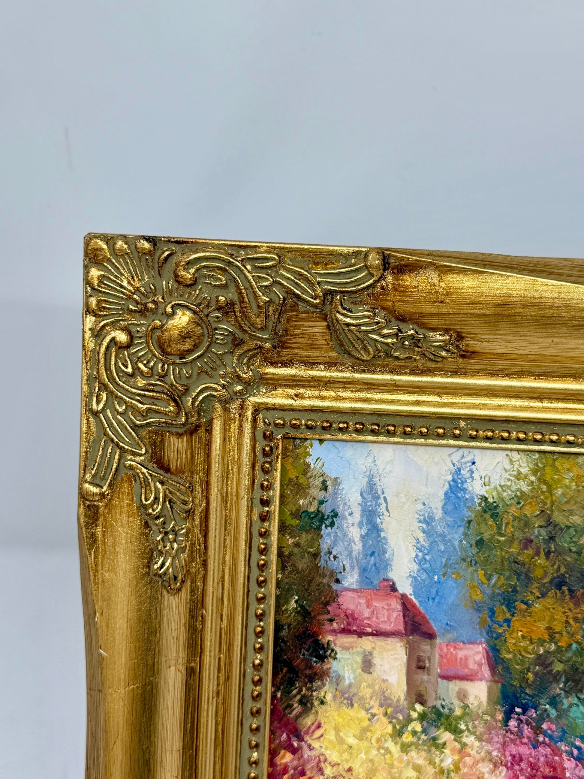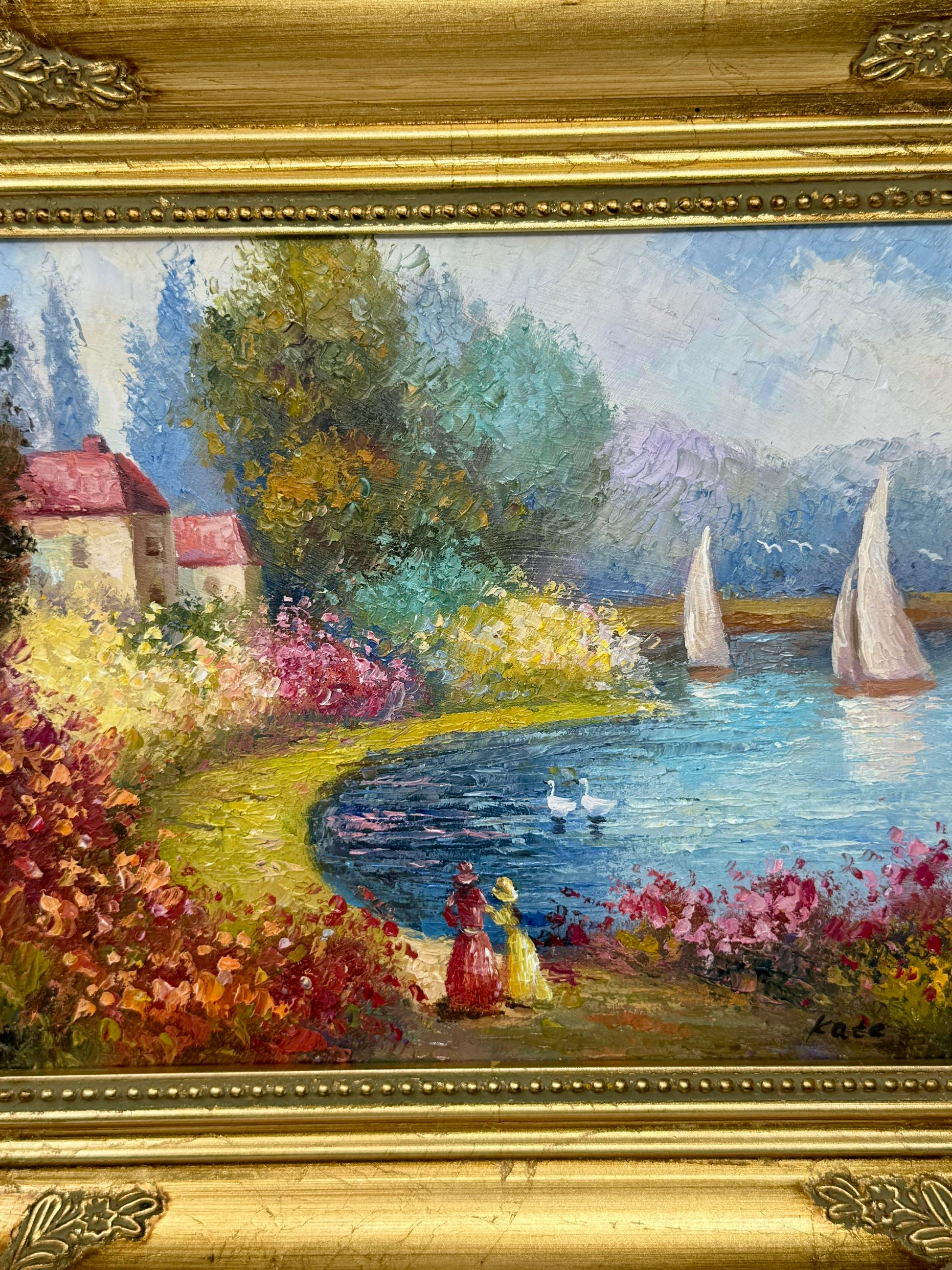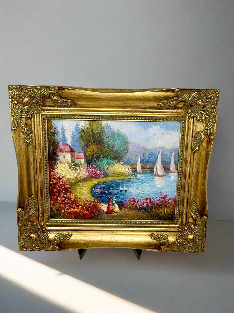 A joyful oil painting that blends the beauty of land and sea. Along the shoreline, vibrant flowers in pinks, yellows, and reds bloom abundantly, guiding the viewer’s eye toward the sparkling blue water. White sailboats glide gracefully across the bay, their sails bright against the soft mountain backdrop. Two elegant figures in period dress stroll the garden path, adding a touch of romance and timeless charm. Framed in a richly gilded ornate frame, this piece radiates warmth, leisure, and elegance.
