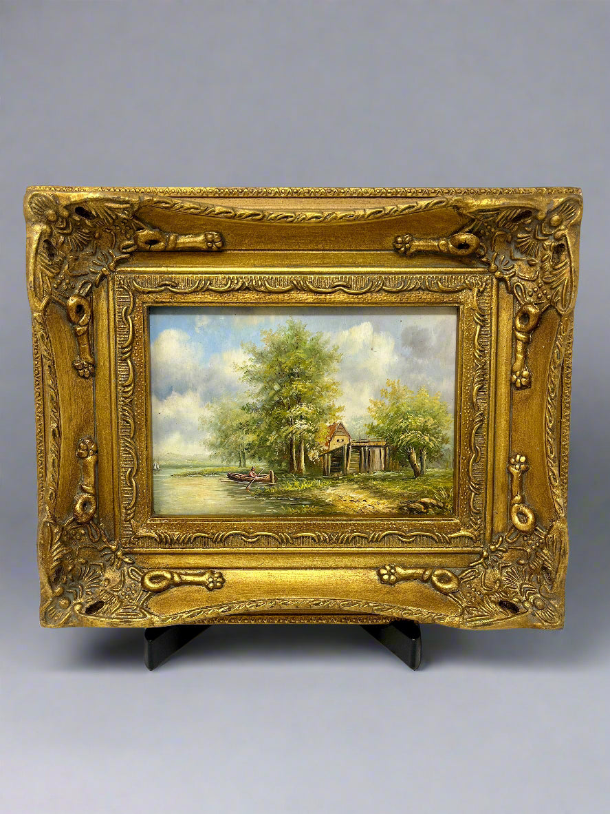 This 5x7-inch vintage oil painting beautifully captures a tranquil lakeside scene, where a rustic boathouse and a moored rowboat rest beneath the shade of lush trees. The gentle ripples on the water reflect the soft clouds above, evoking a peaceful, nostalgic charm. With meticulous brushwork and a harmonious palette, the artist brings to life the serenity of nature and the quiet elegance of rural life.