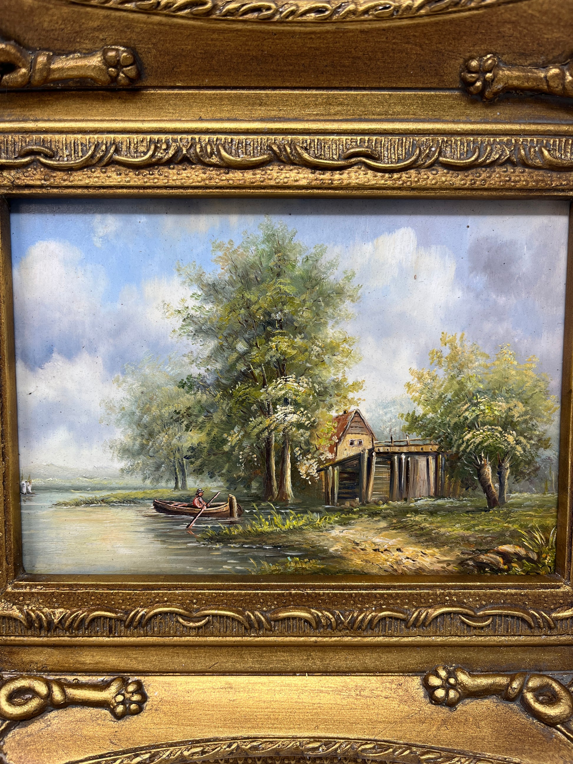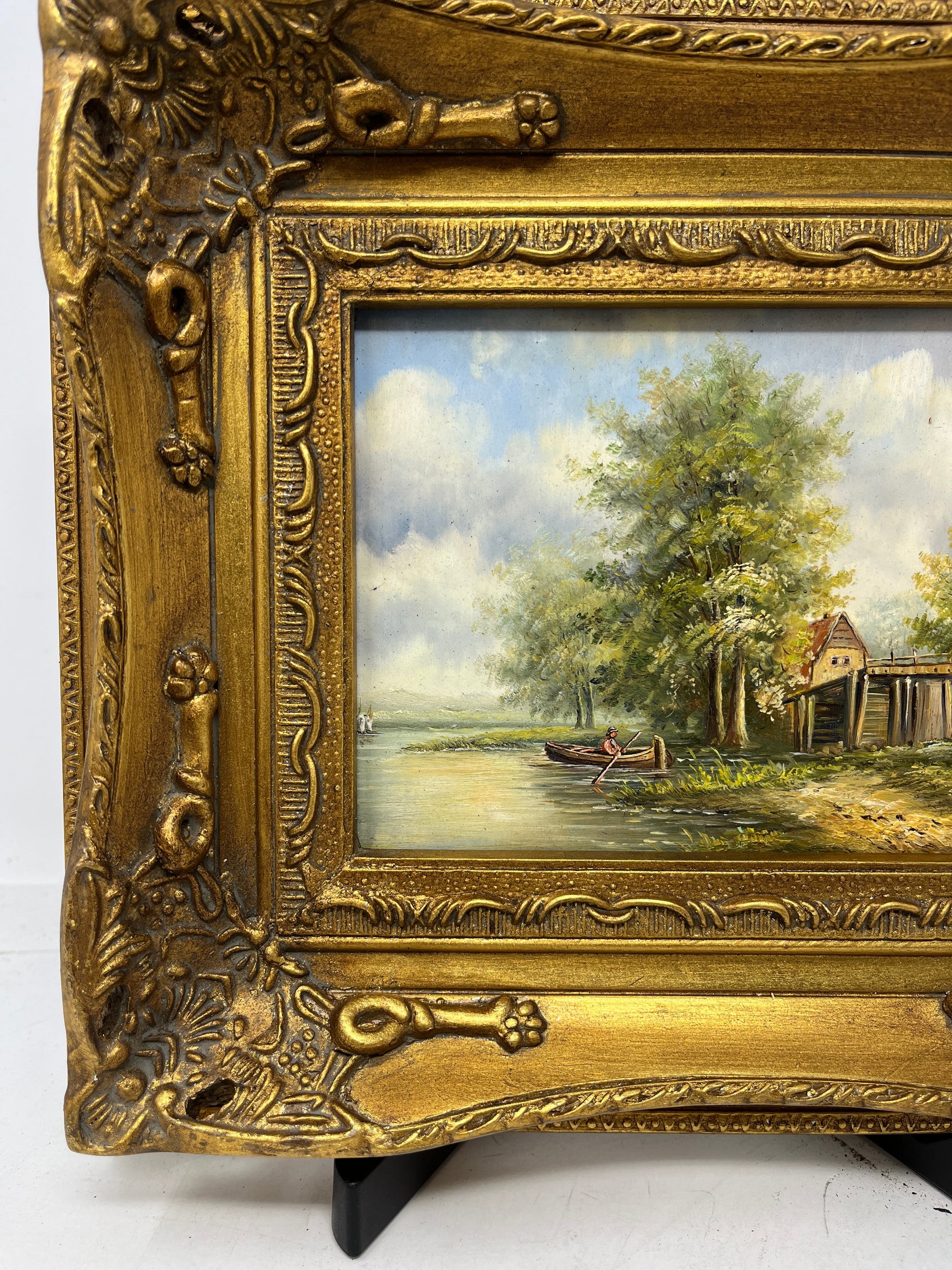 Encased in an ornate 10x12-inch gold frame, this timeless piece is perfect for collectors of vintage landscapes and those who appreciate the beauty of stillness and simplicity in art.