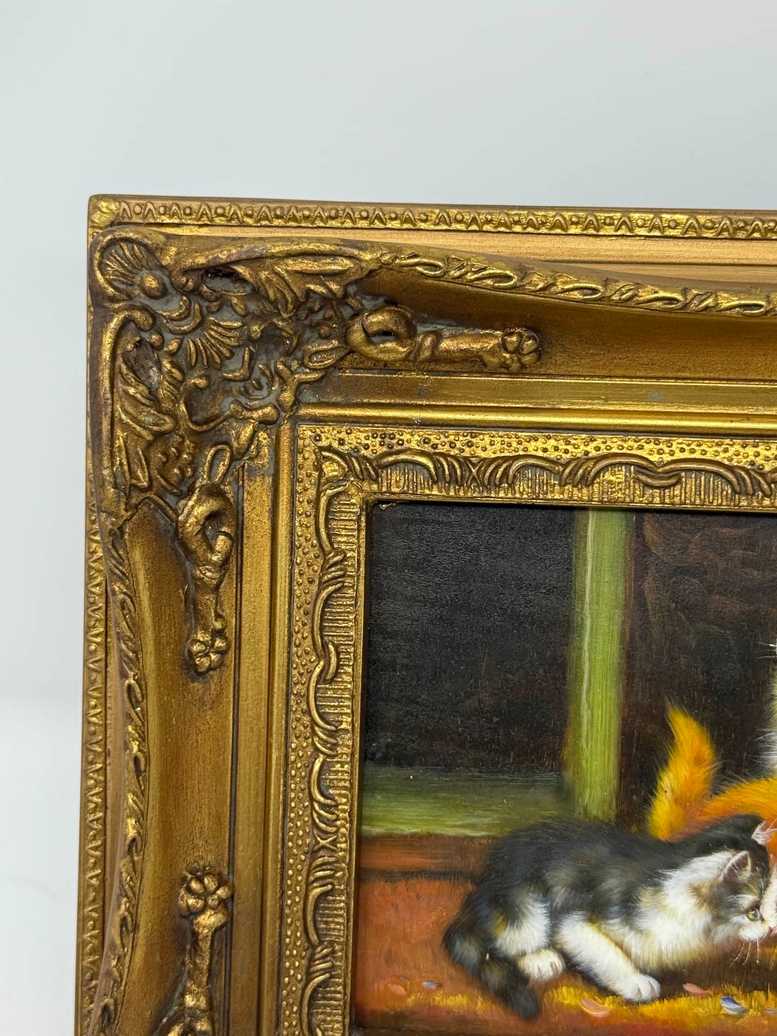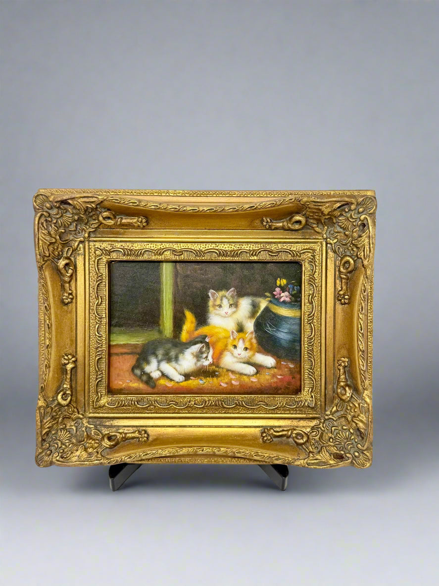 Three kittens lounge in the gentle spill of sunlight by the open doorway. Their fur glows with warmth, their eyes bright with curiosity and playfulness. Soft golden light dances across the scene, capturing a fleeting moment of innocence and comfort.