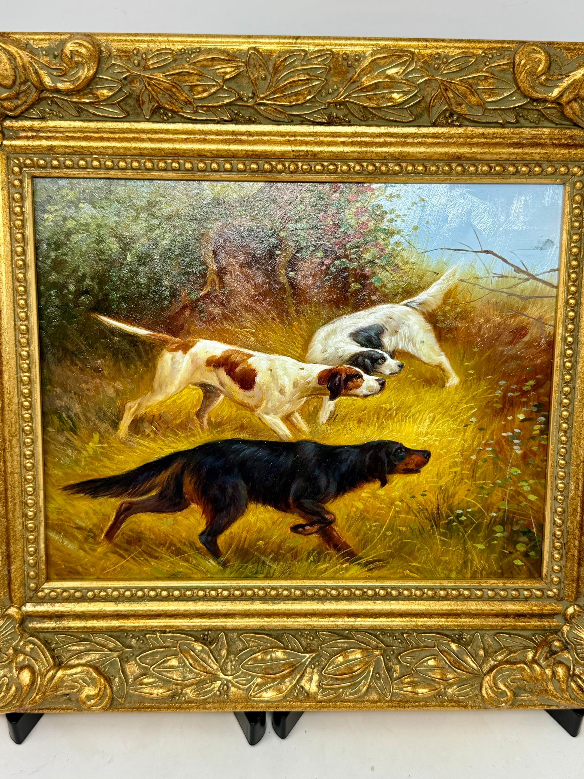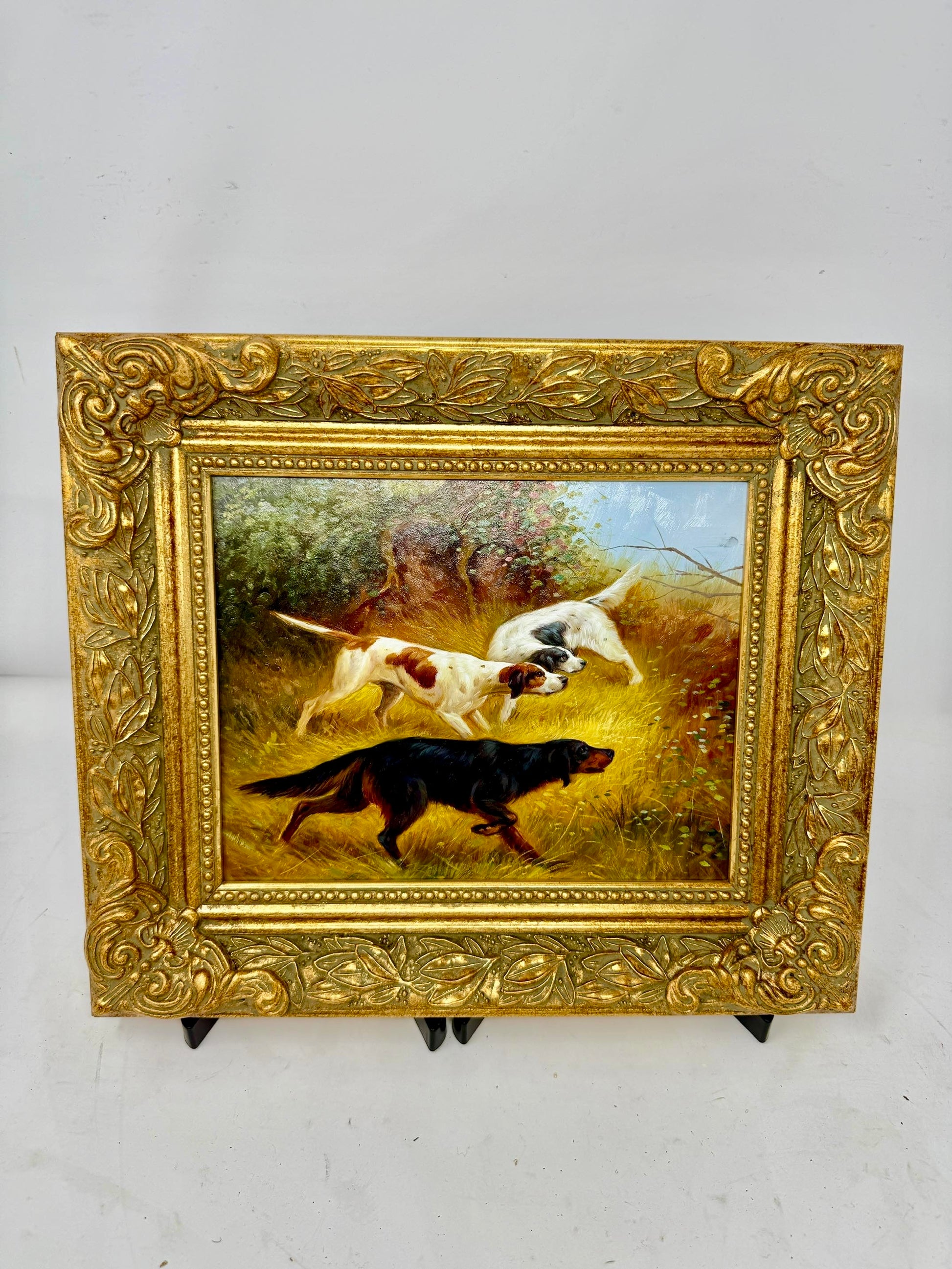 A vibrant 8×10-inch sporting masterwork set within an ornate 12×14-inch gilt frame. Three noble hunting dogs—two light-coated setters and a sleek black companion—move in unified rhythm across the sunlit field. 🌤️🐕🦺 Their muscles, coats, and expressions are captured with stunning realism, each brushstroke alive with motion and instinct.