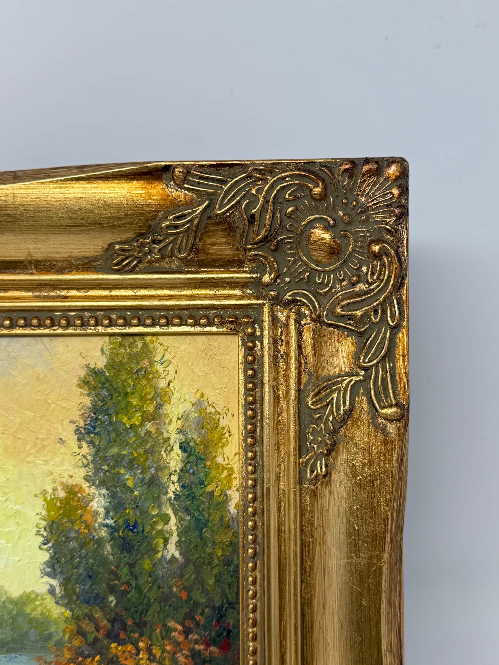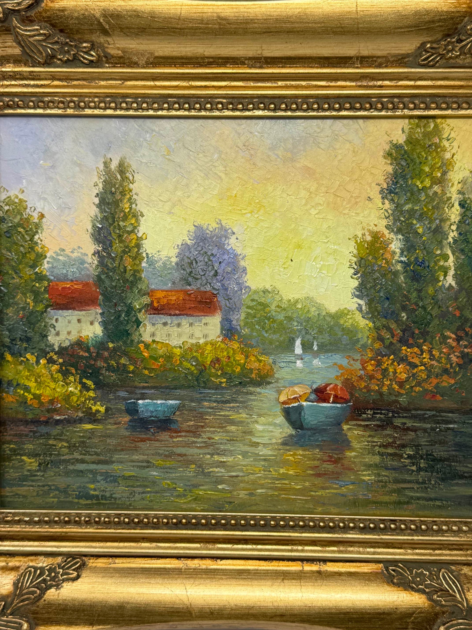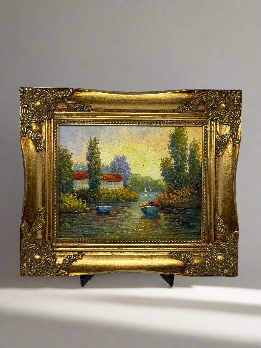 This 8x10 inch oil painting (13x15 inches with frame) feels like a scene you once passed through in a dream — warm light, still water, boats gently swaying, and a quiet village tucked into the trees. The brushstrokes are thick and alive, colors melt into each other like early evening light.