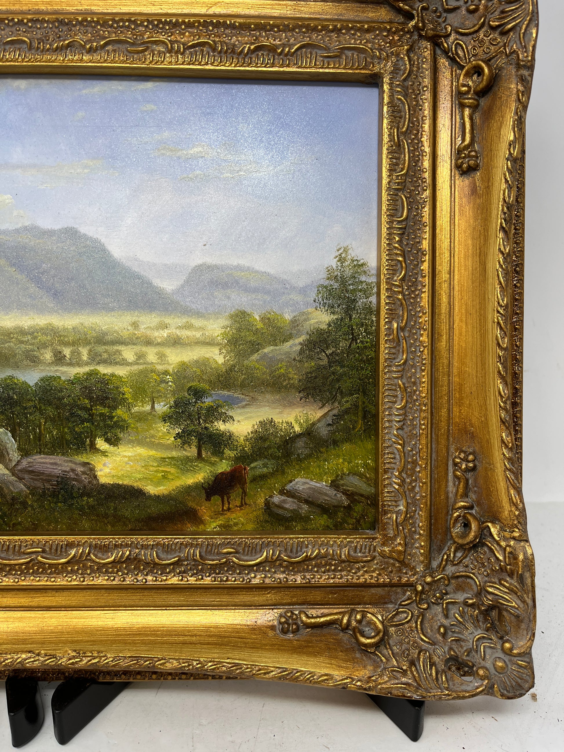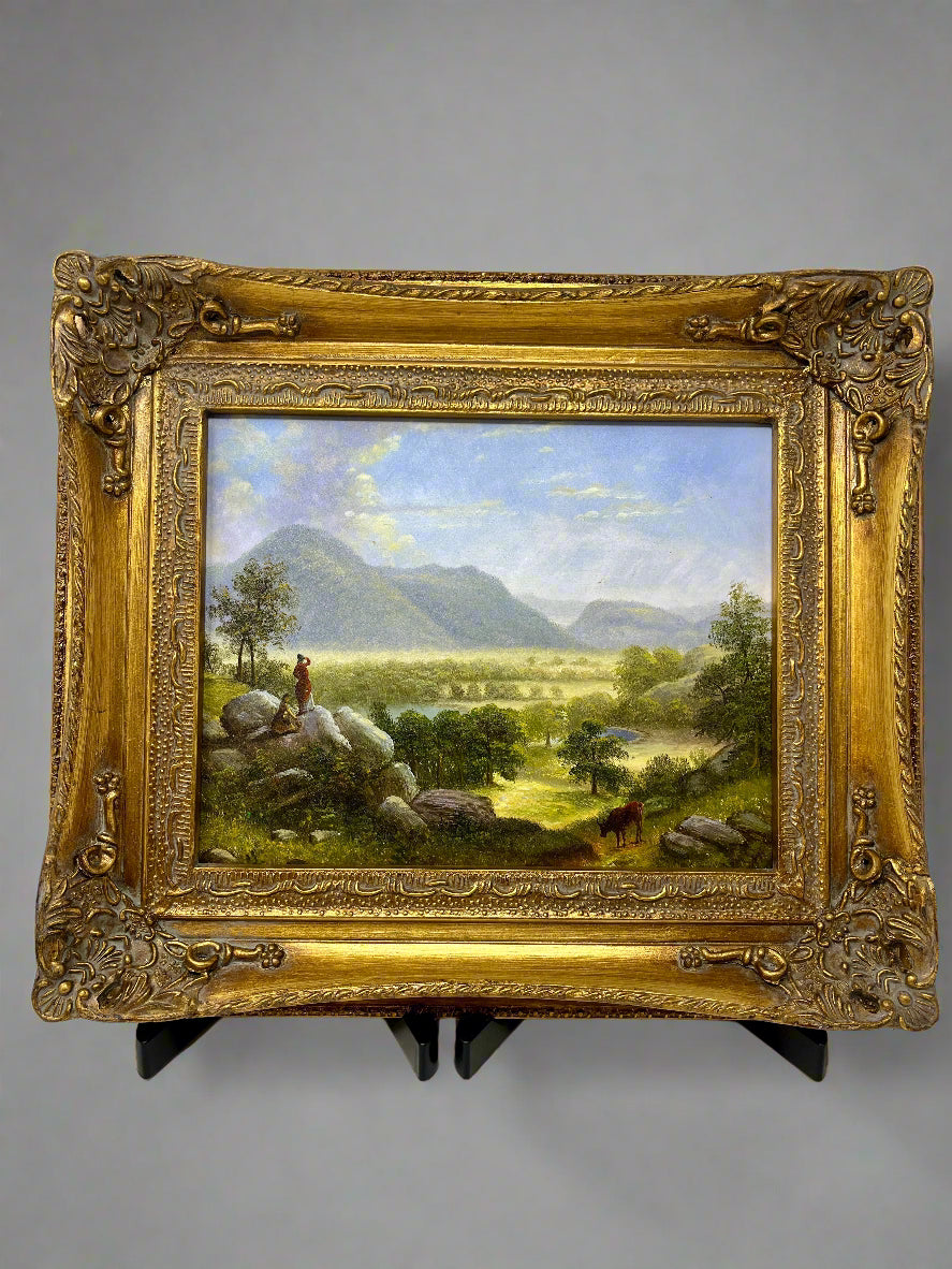 This breathtaking 8x10-inch oil painting, framed to an elegant 13x15 inches, portrays a serene valley landscape bathed in golden sunlight. Rolling hills stretch into the distance, framed by majestic mountains and dotted with lush trees and grazing cattle. A lone figure standing atop a rocky outcrop gazes out at the expansive view, evoking a sense of wonder and connection to nature. Encased in an intricately crafted gold-tone frame, this piece radiates timeless charm, making it a perfect addition to any classic or rustic interior.