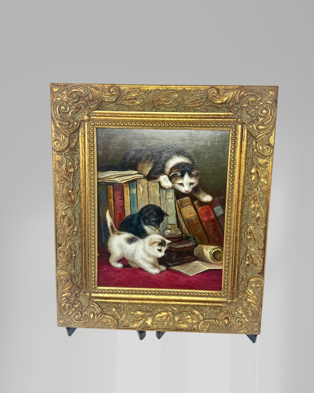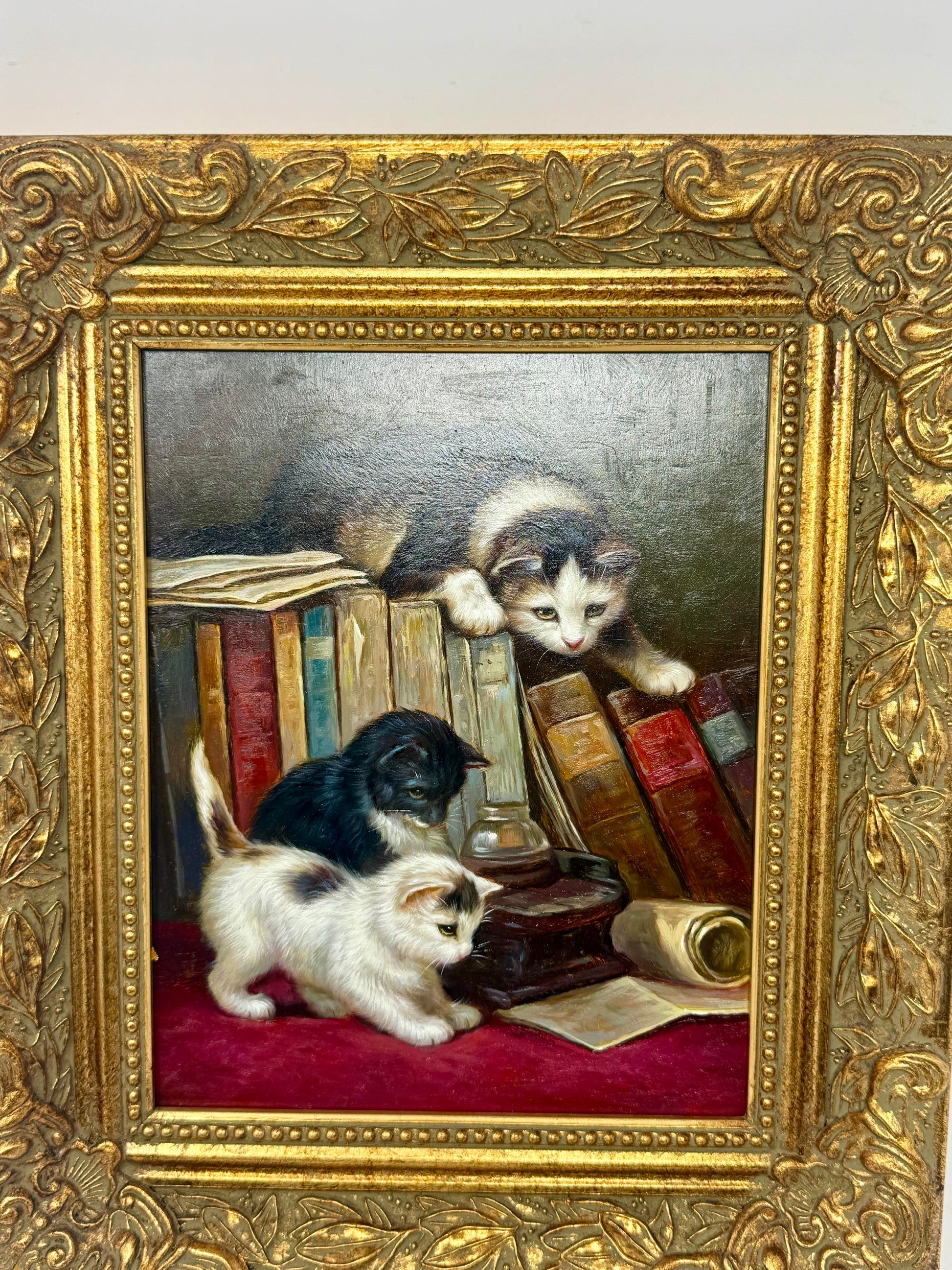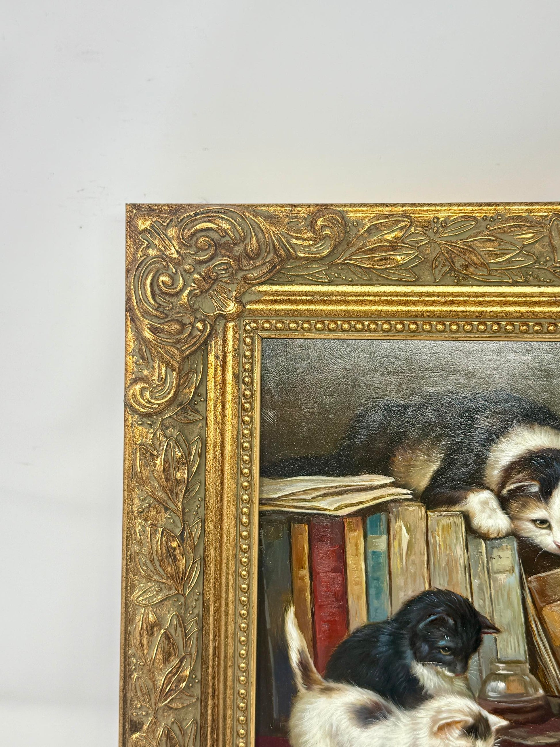 Set within a richly carved gold ornate frame measuring 12×14 inches, this piece feels like a secret uncovered in an old European library — intimate, nostalgic, and irresistibly warm. A true heirloom for cat lovers, book collectors, and those drawn to timeless storytelling.