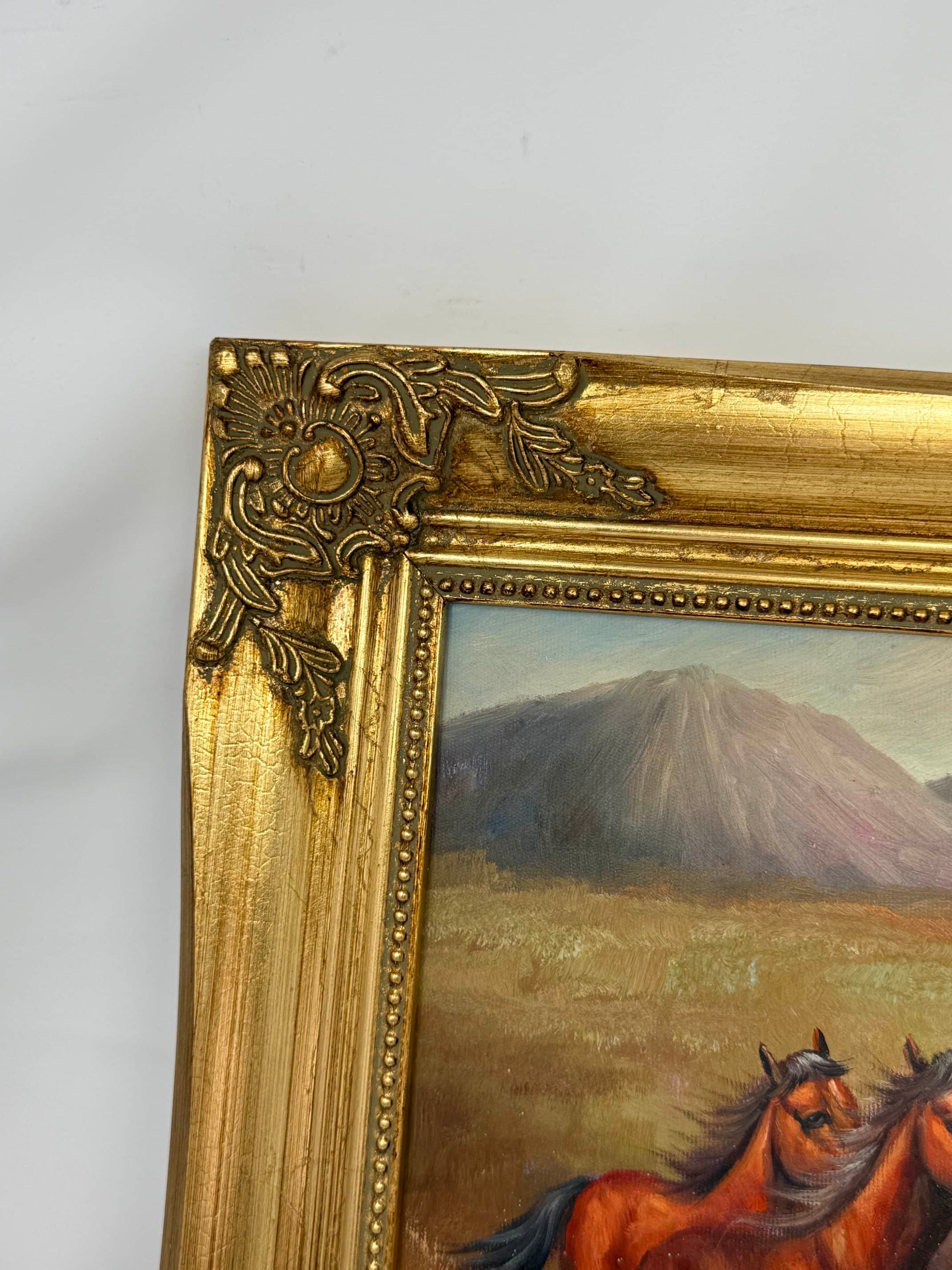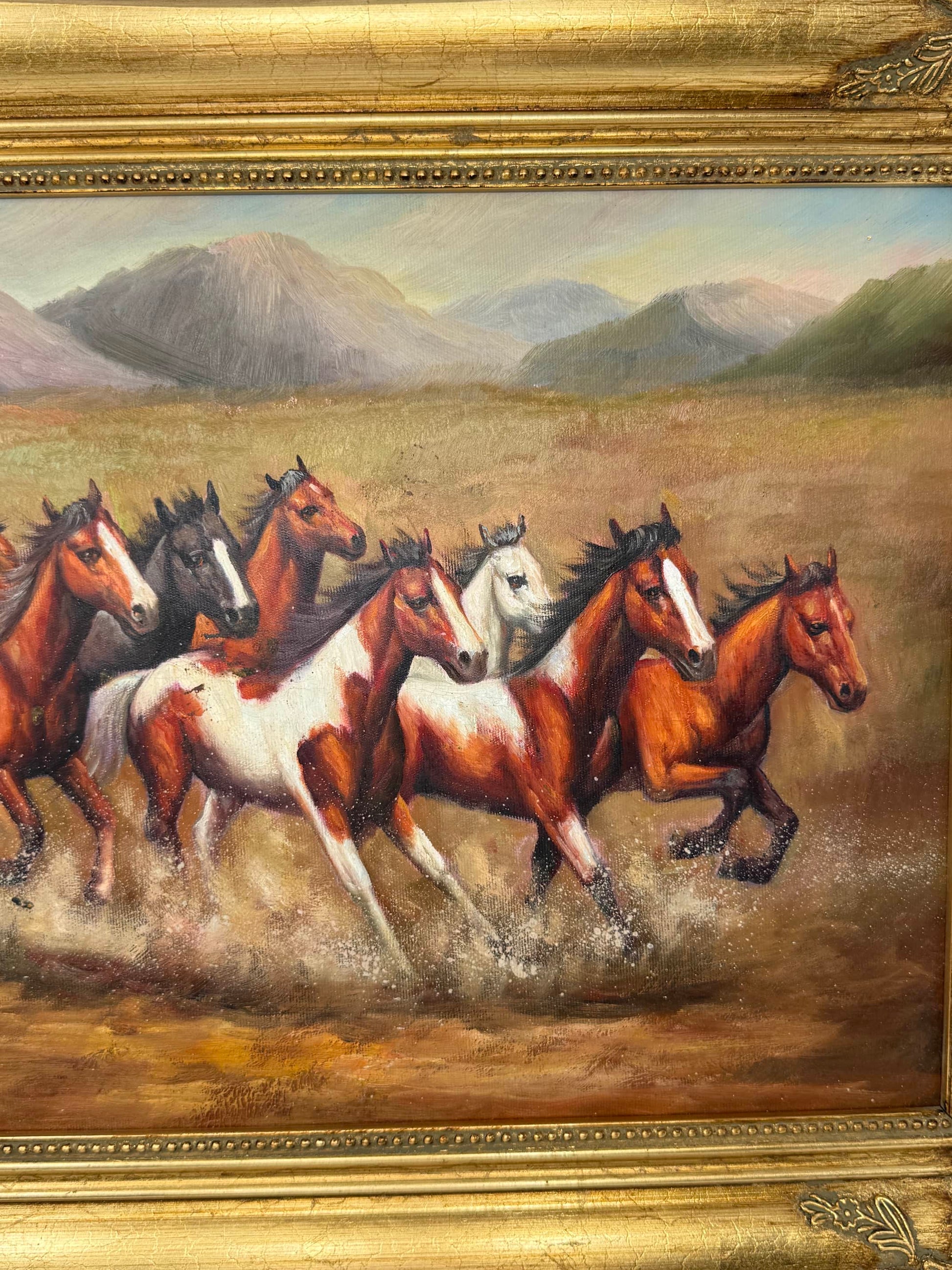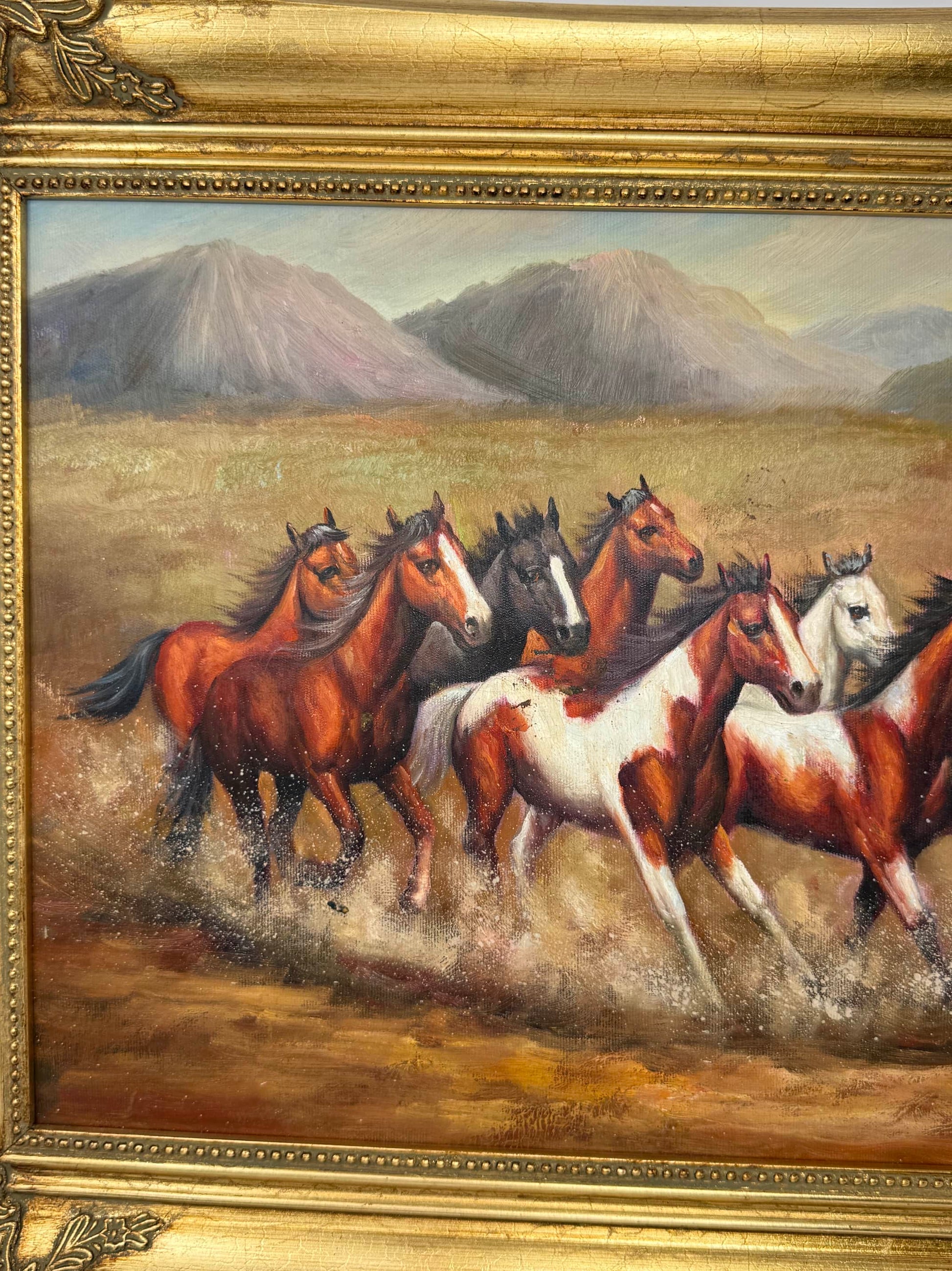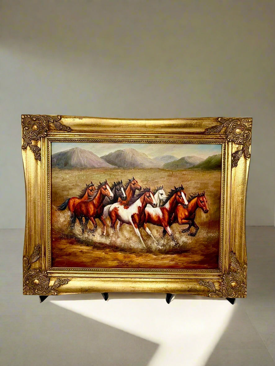 Across a golden plain, six magnificent horses gallop side by side, their hooves kicking up clouds of dust like surging waves. Their manes stream in the wind, blending power and speed into a hymn of freedom. In the distance, rolling mountains stand in quiet watch, adding grandeur and a sense of vastness to the scene.