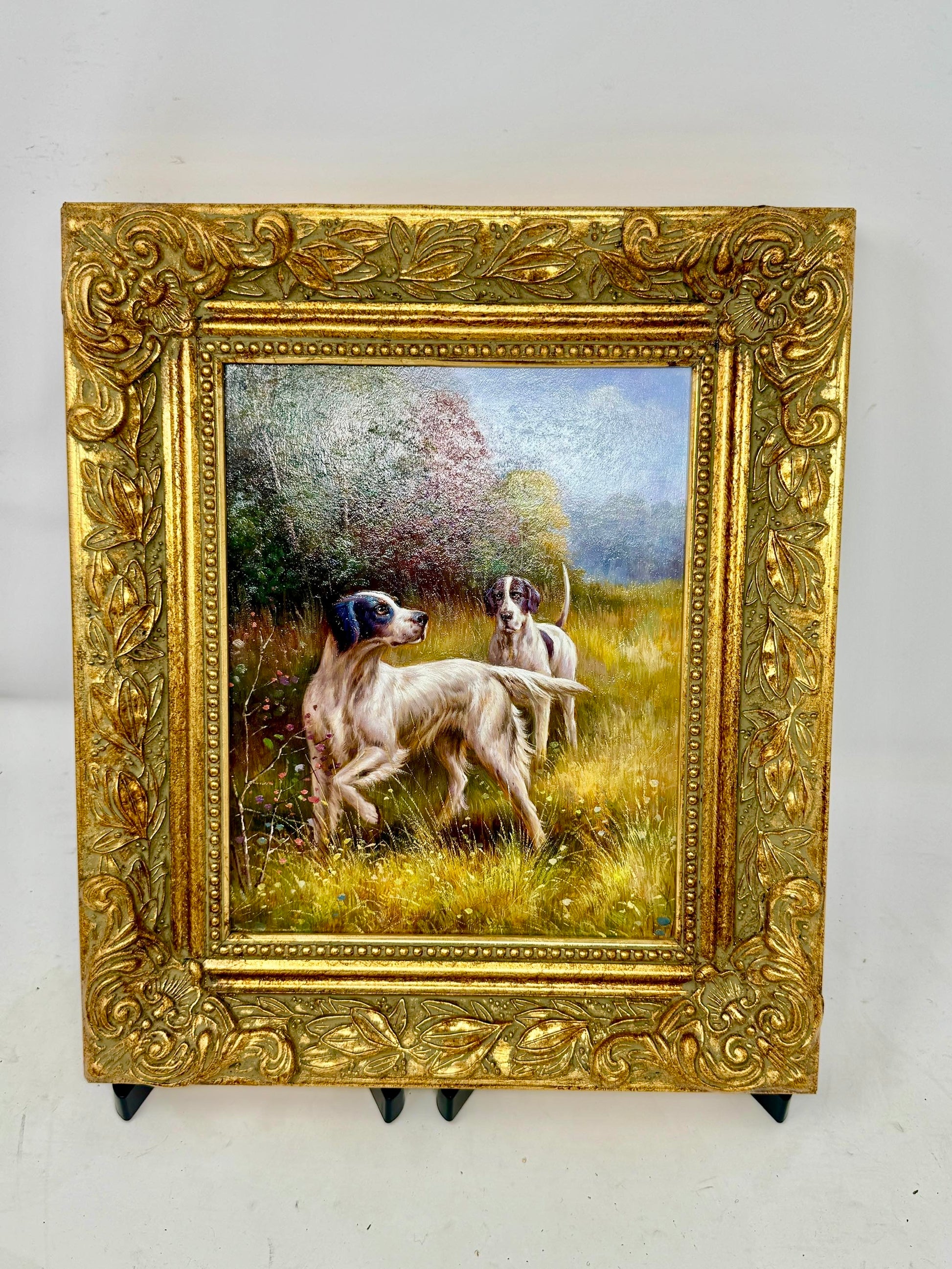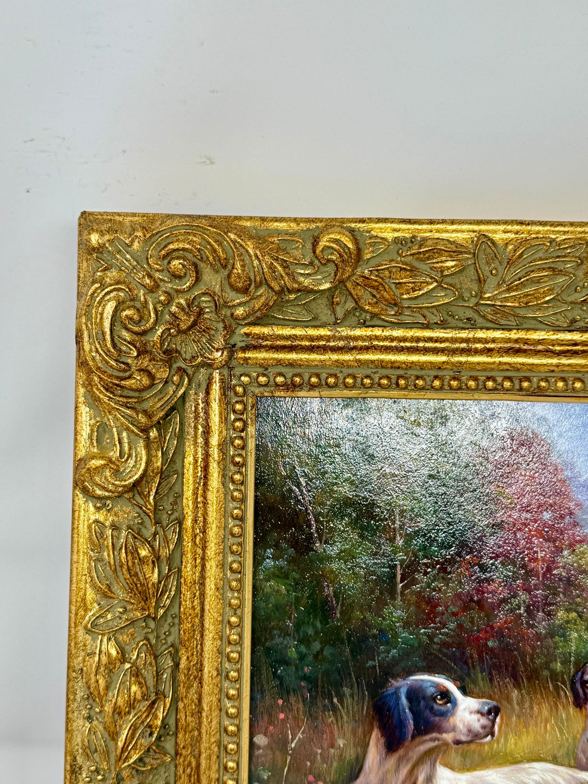 A striking 8×10-inch sporting portrait framed in an ornate 12×14-inch antique gilt frame. Two noble setters stand alert at the forest’s edge, their bodies alive with instinct and focus. 🌿🐕🦺 Warm light filters through autumn foliage, illuminating their coats with a soft golden sheen and revealing the painter’s exquisite attention to detail and movement. 🍂🌤️